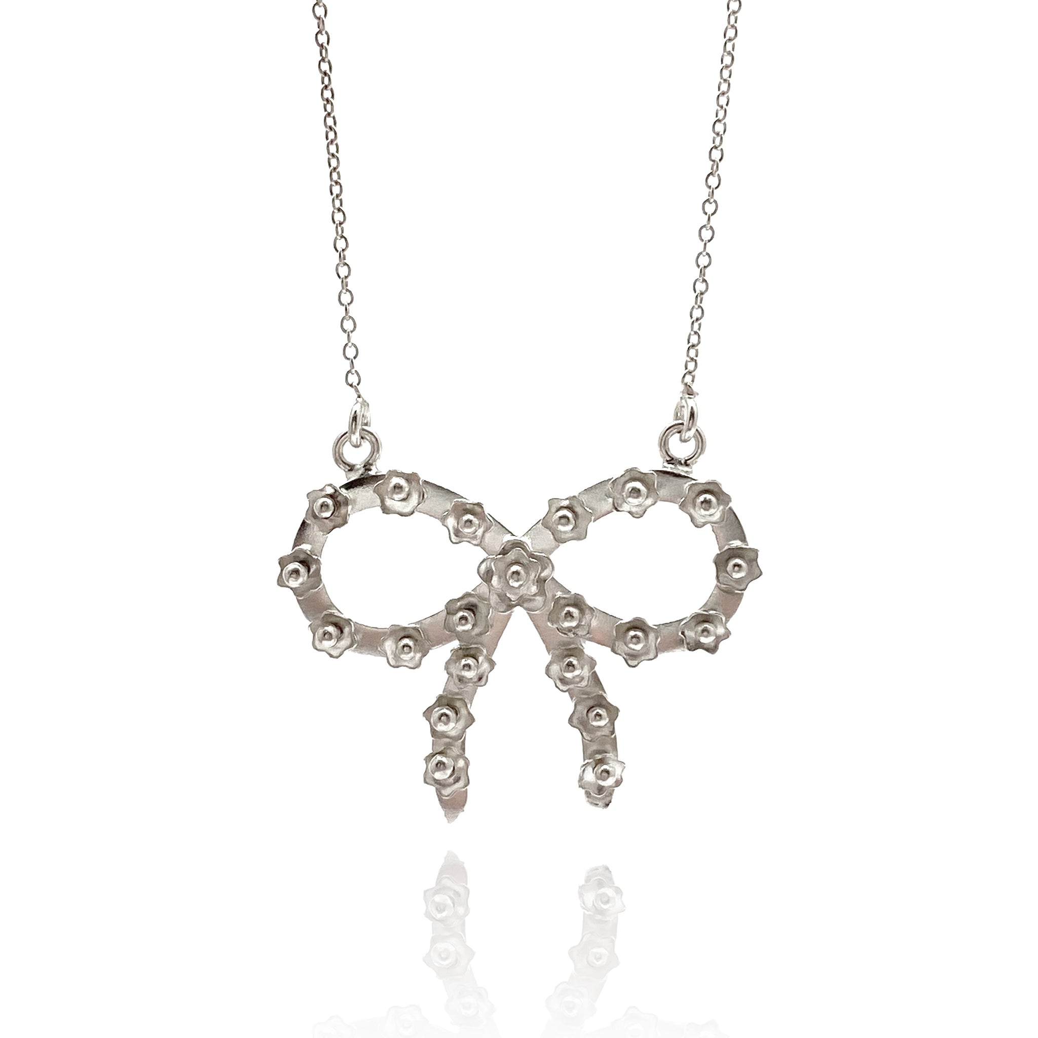 This sweet bow necklace from Liz Clark is adorned with flowers. Each of the sterling...