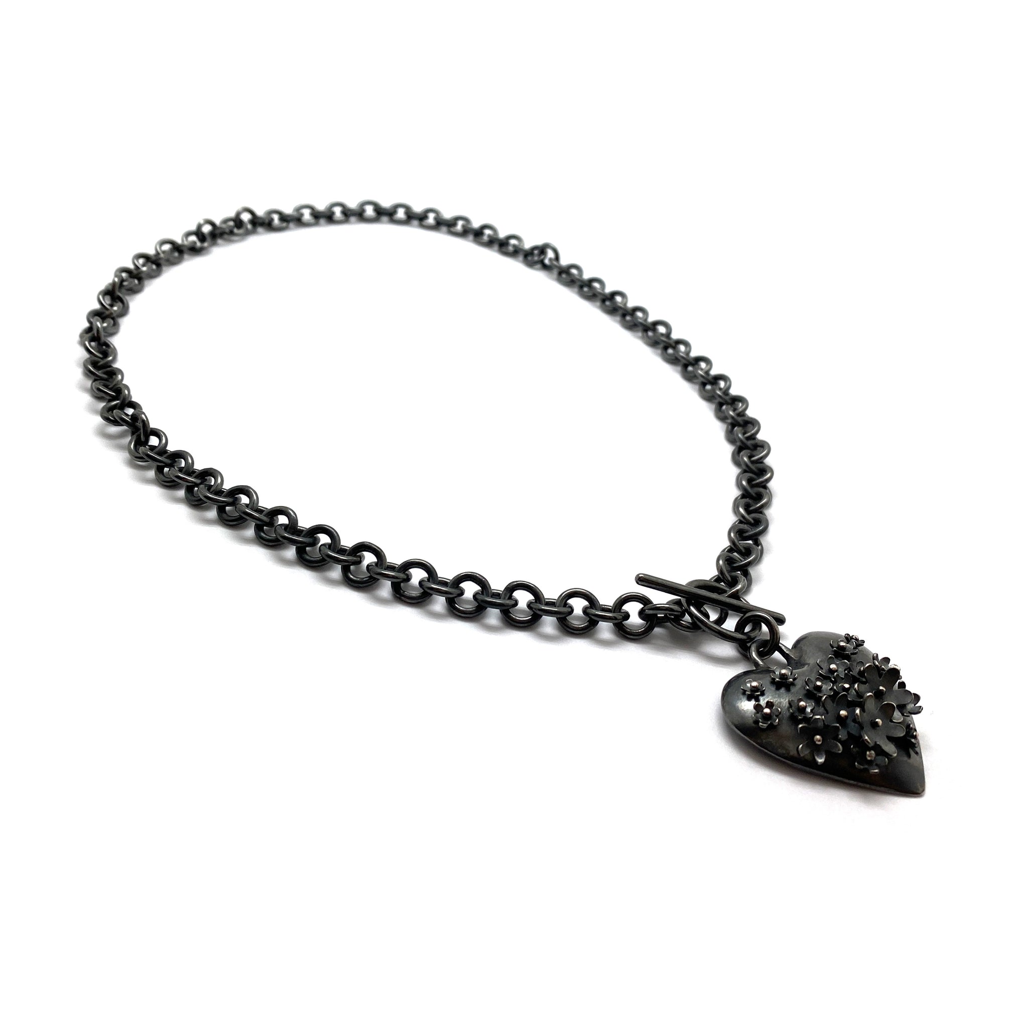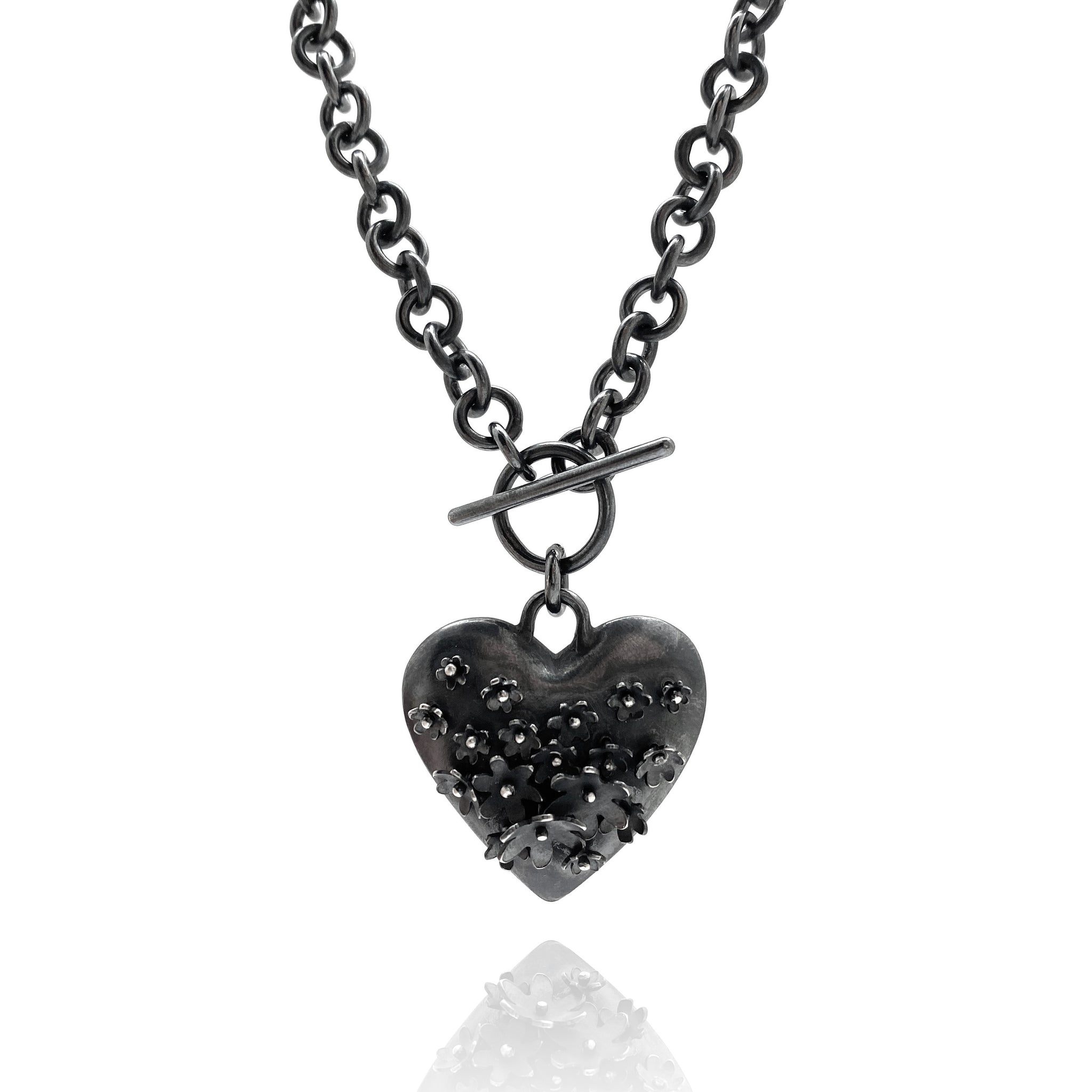 This dark, sterling silver necklace from Liz Clark is made with love. A hollow-form heart...