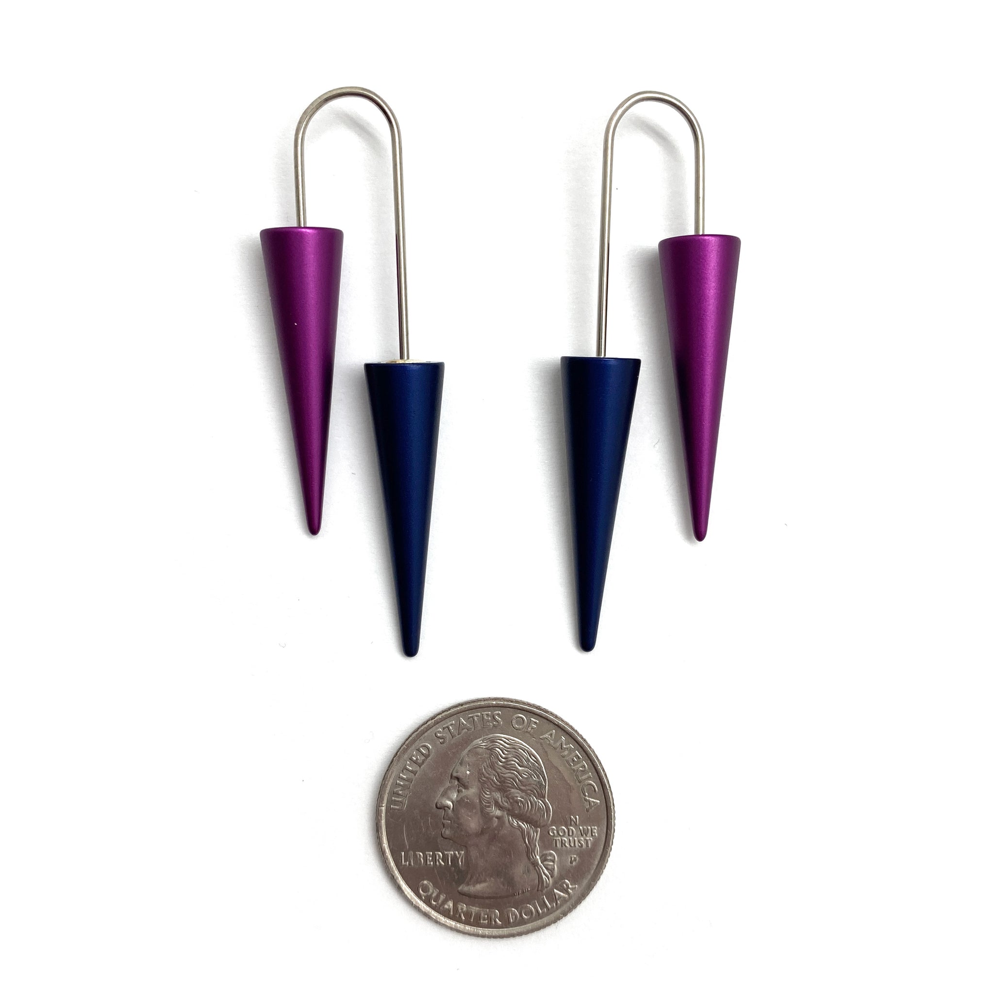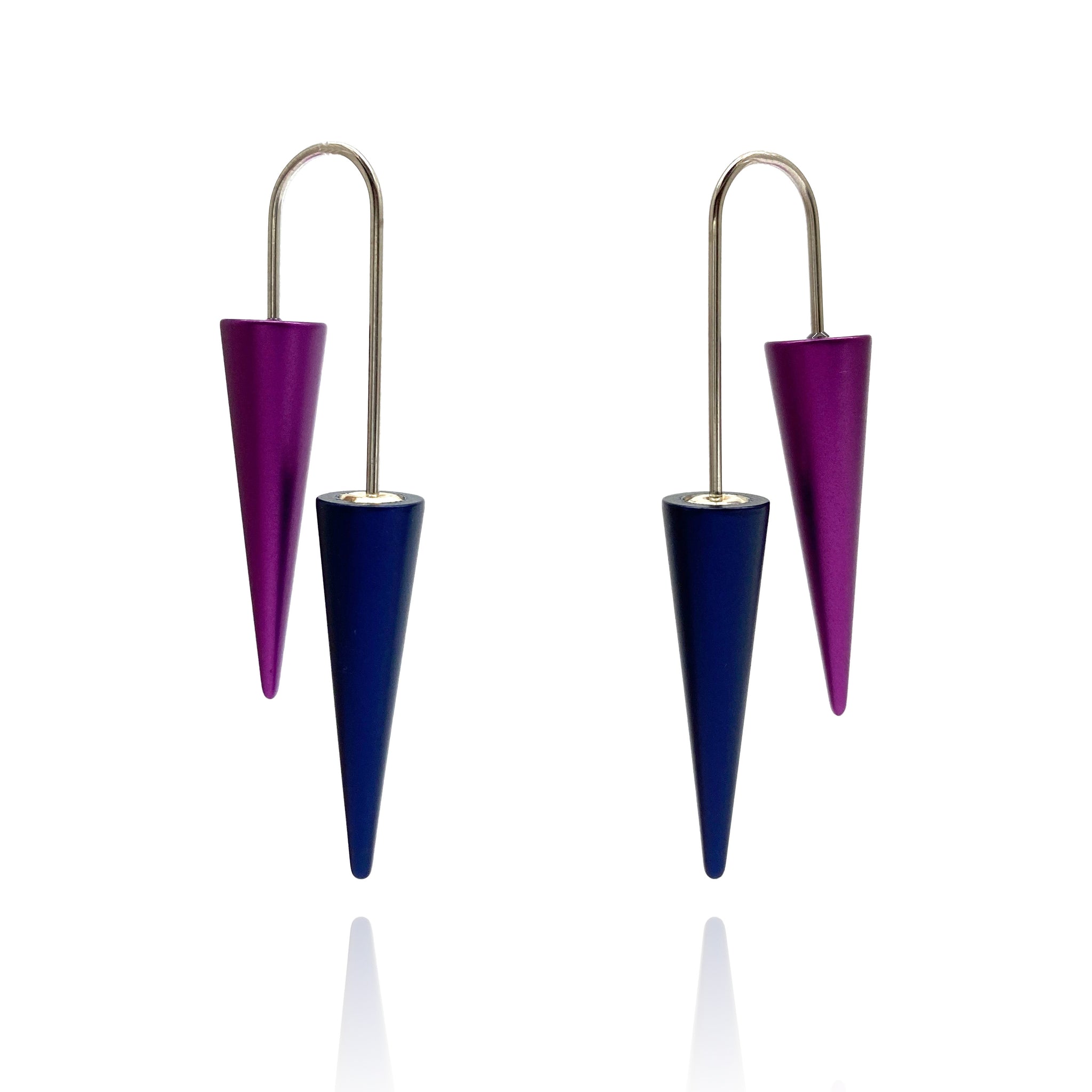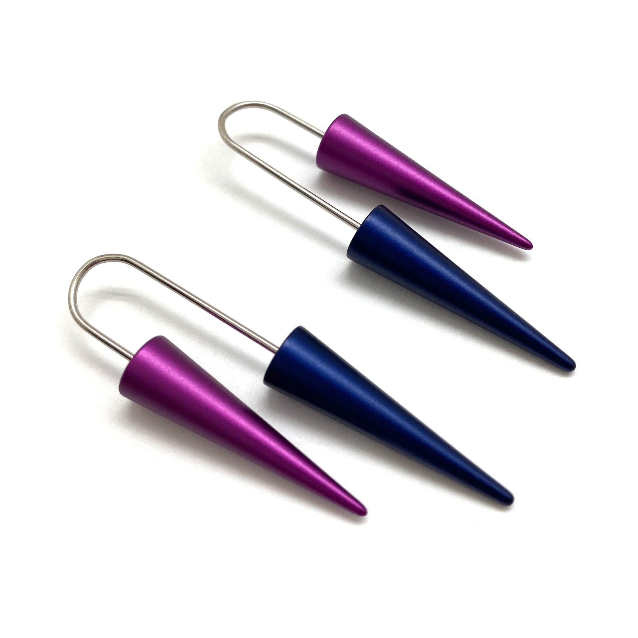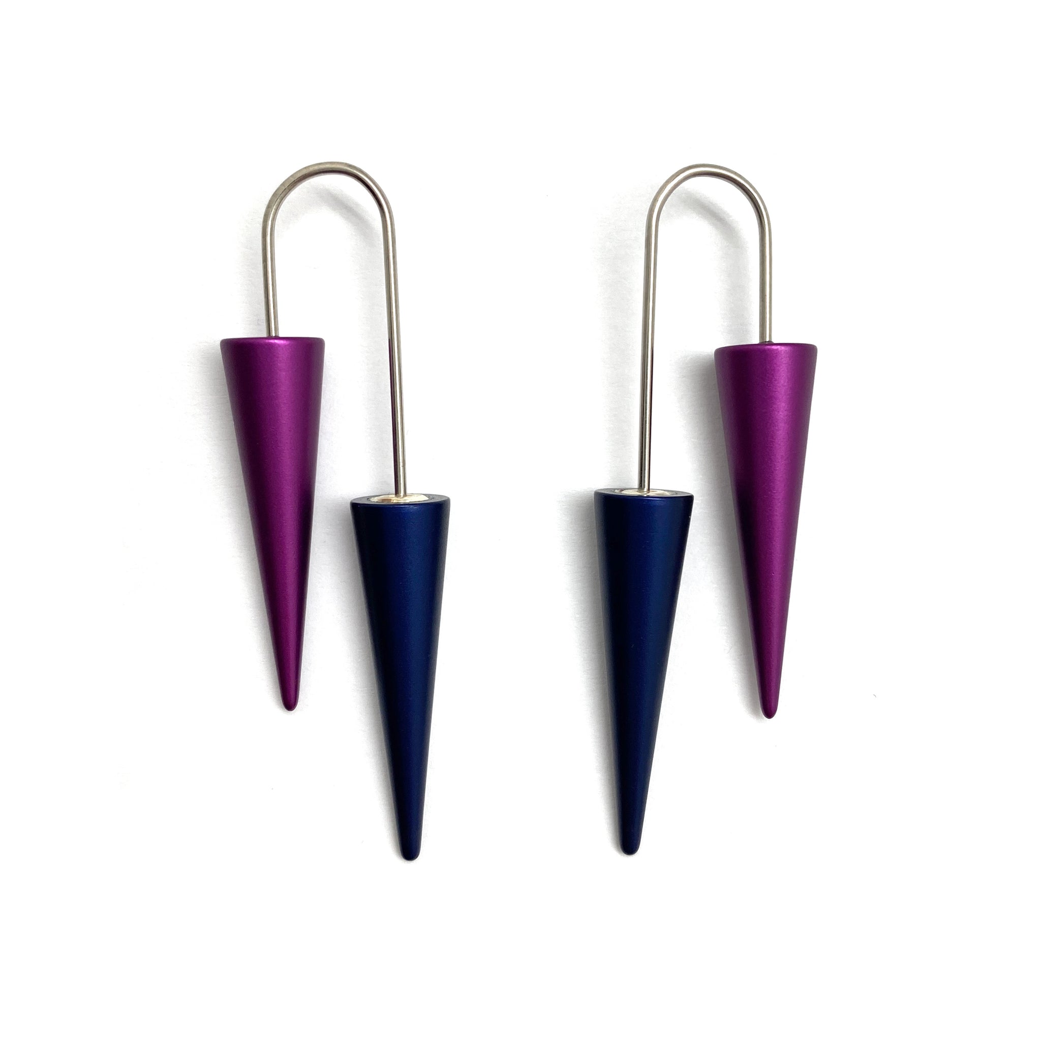This edgy pair star bold, asymmetrical purple and green cones. These anodized aluminum earrings have...