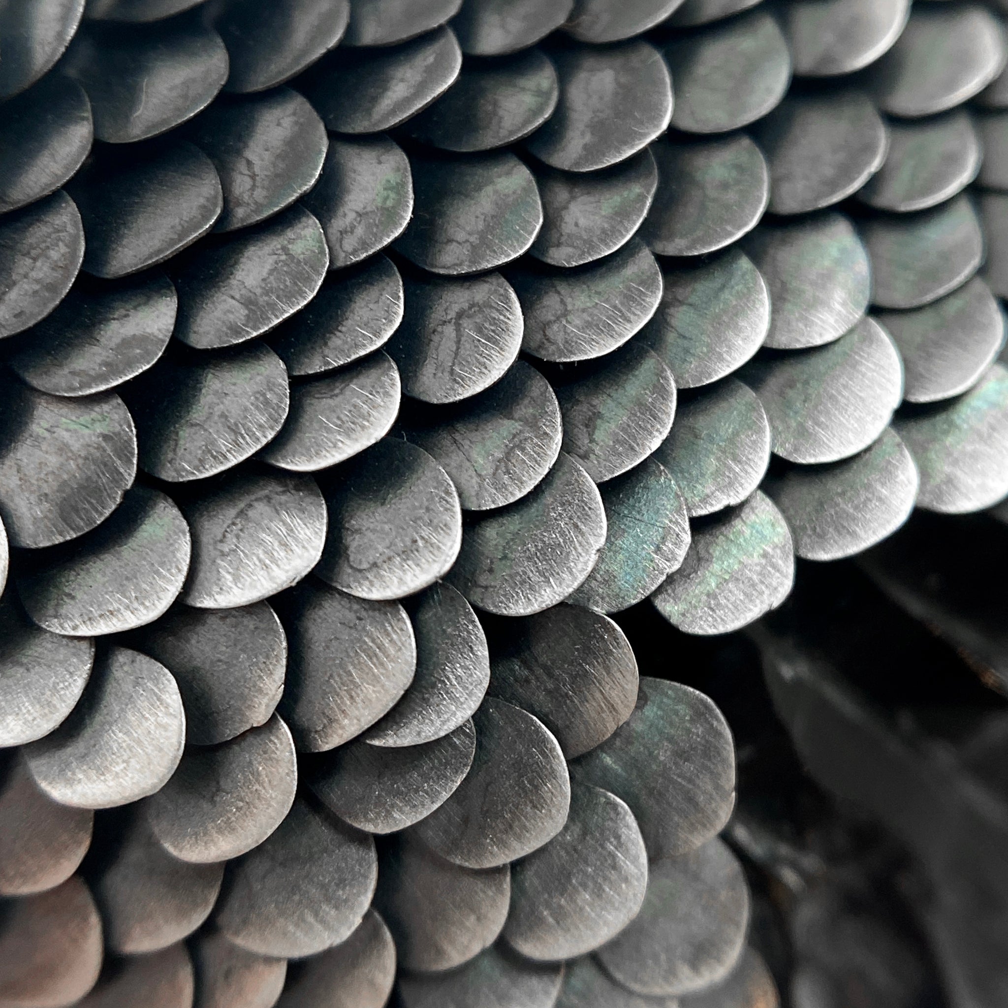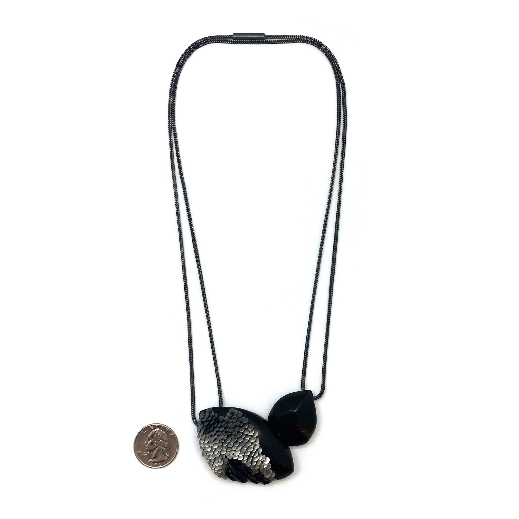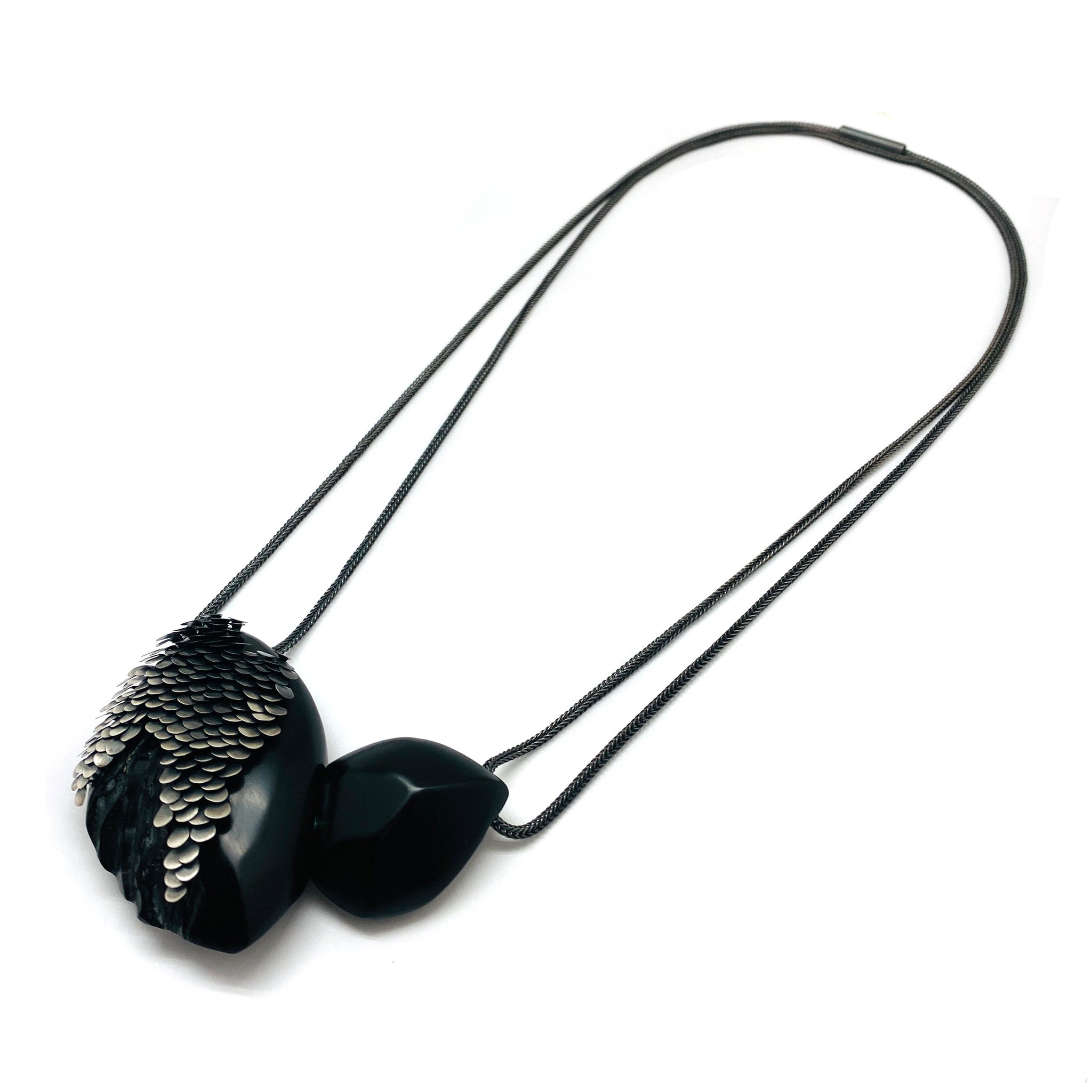 Featuring hand carved acrylic adorned with sterling silver scales, this is smaller sized Murmur necklace...