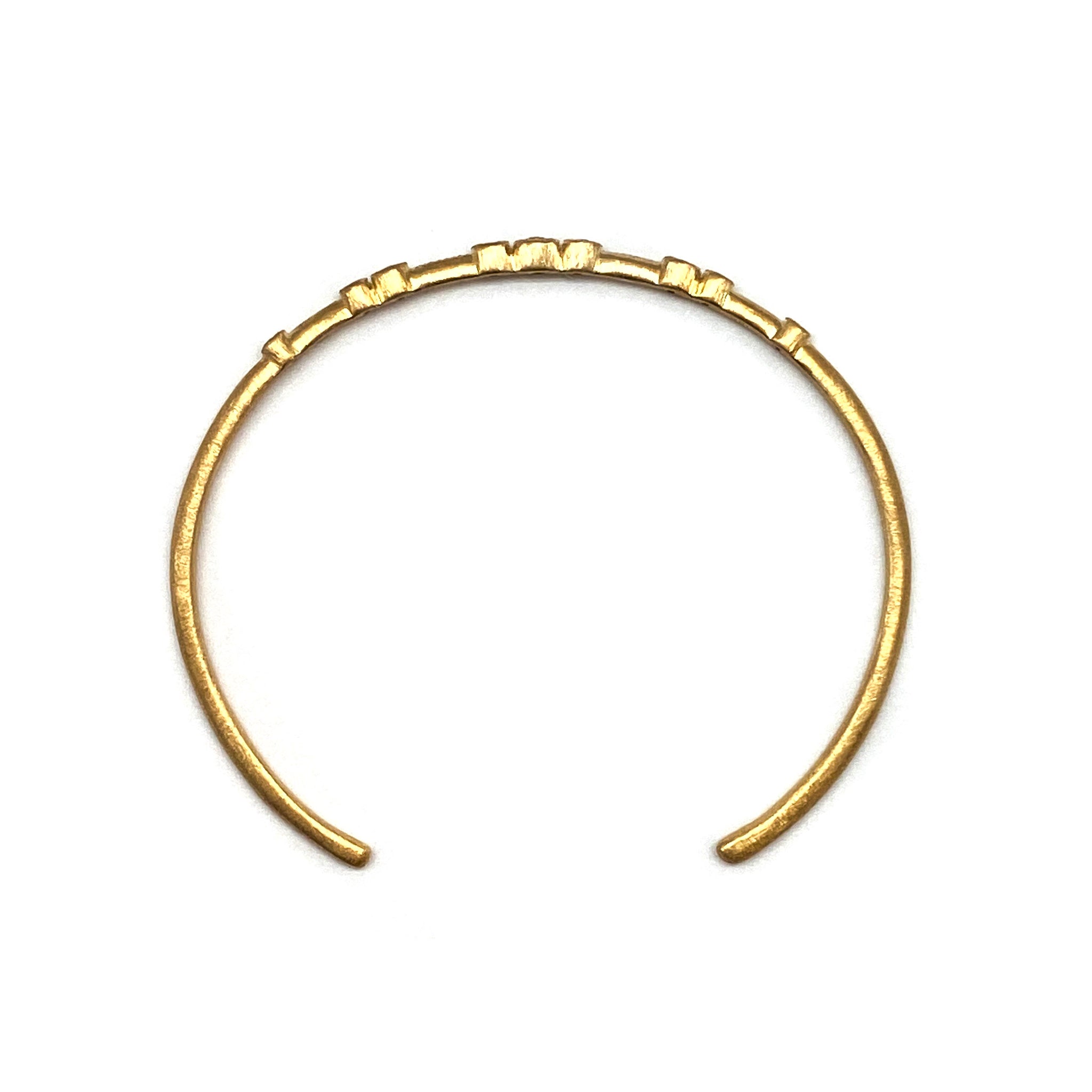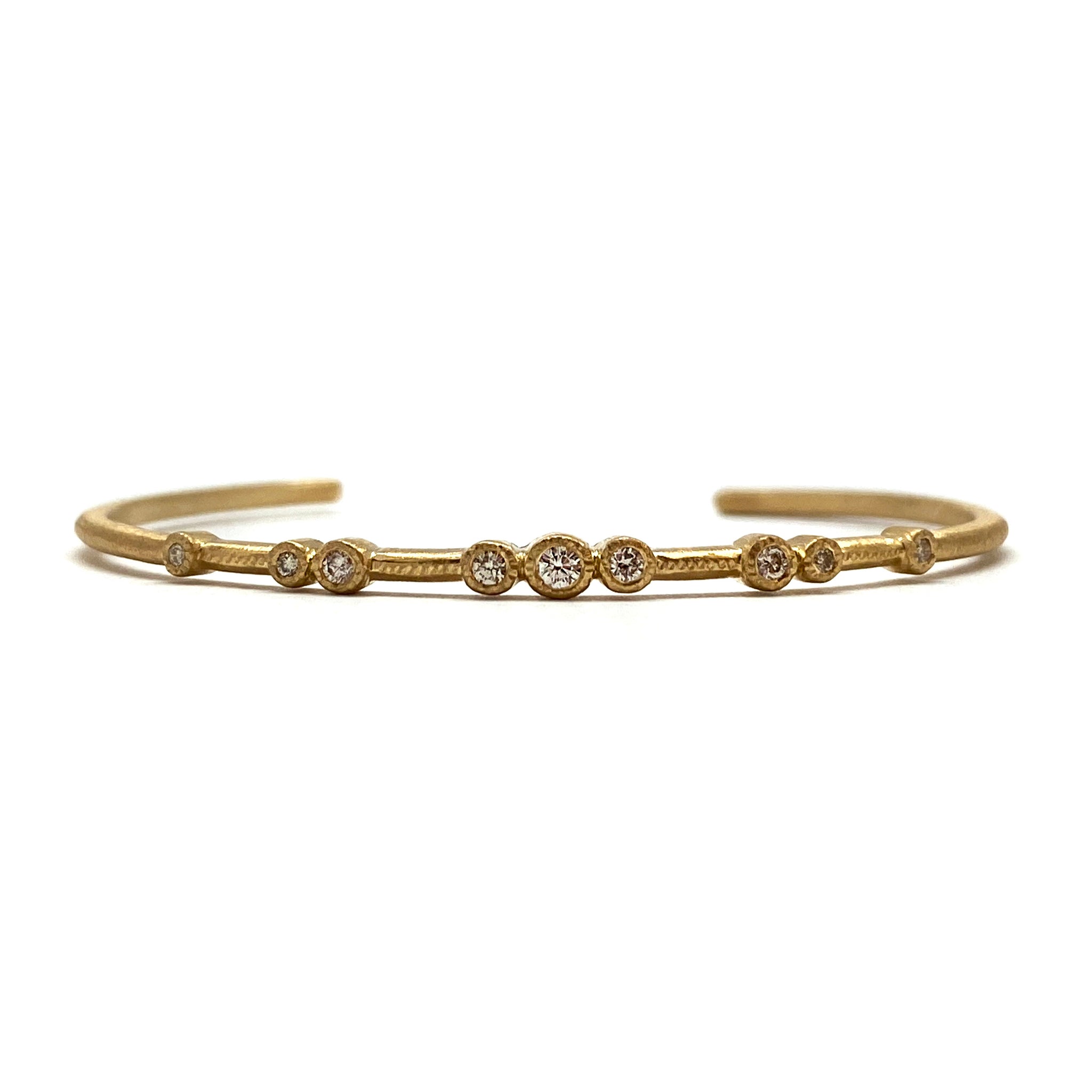 This cuff by Yasuko Azuma is a contemporary take on the classic gold and diamond bracelet. Featuring 9 bezel set diamonds, this piece is a favorite here at Pistachios.
