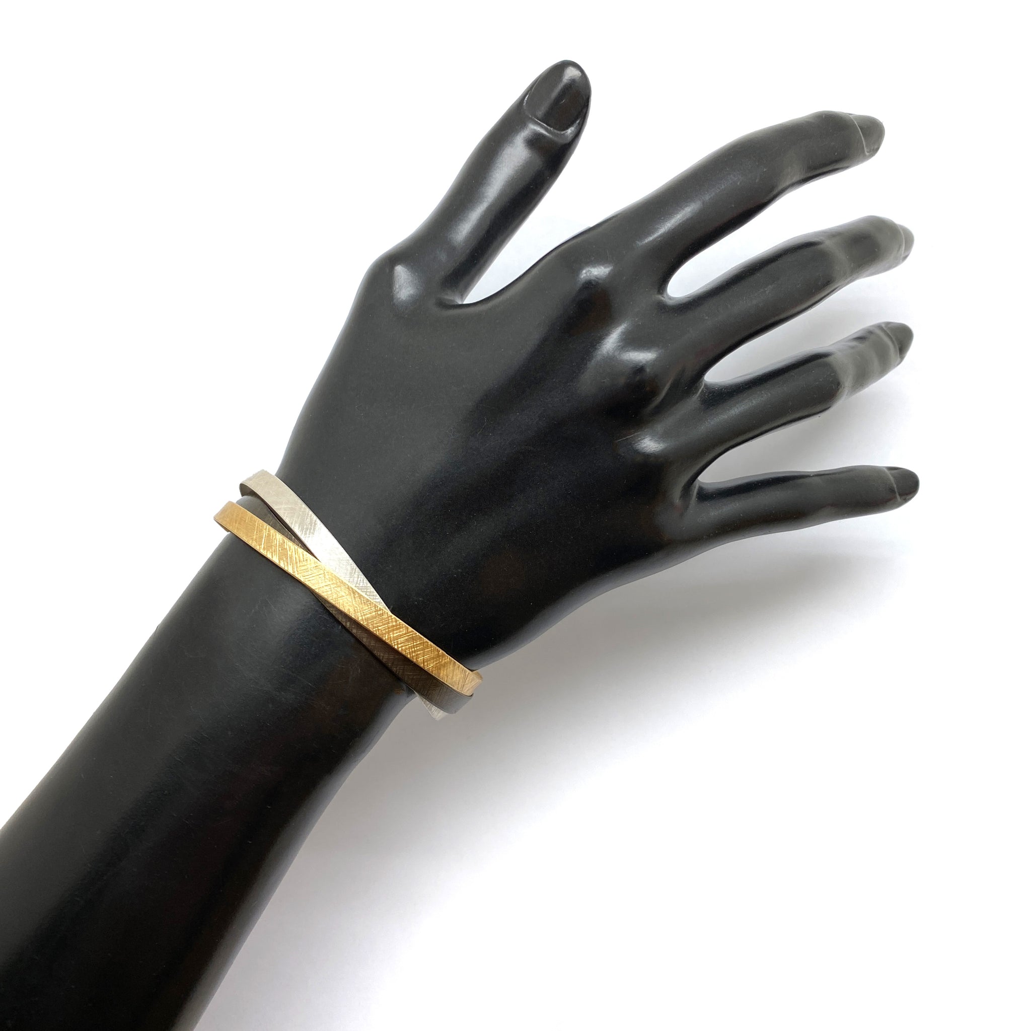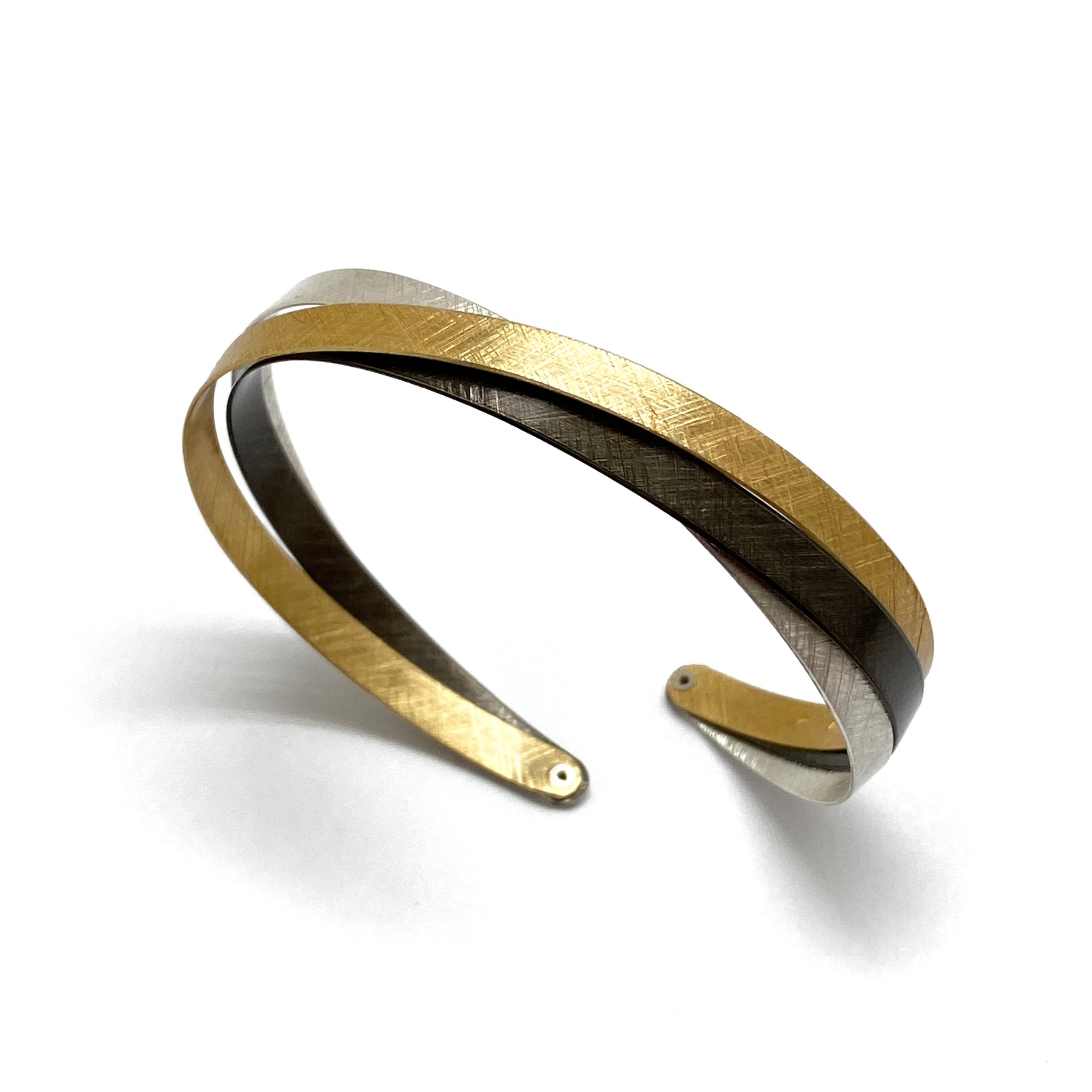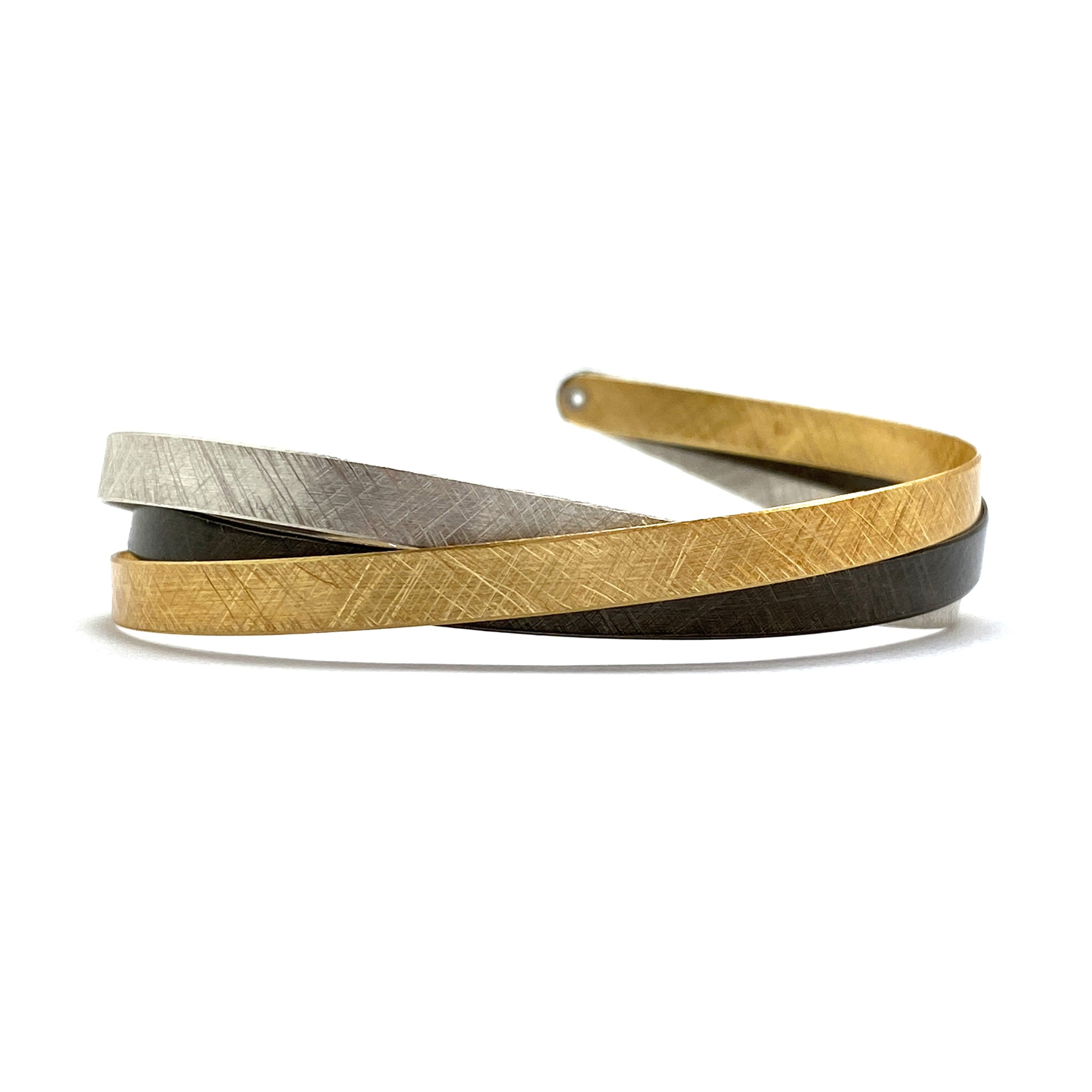 This tension based cuff bracelet by Polish artist Mariusz Fatyga features textured resin-coated gold vermeil, bright and oxidized sterling silver in a bypass style. The tension based cuff has a flexible opening, allowing it to be worn a variety of wrist sizes.