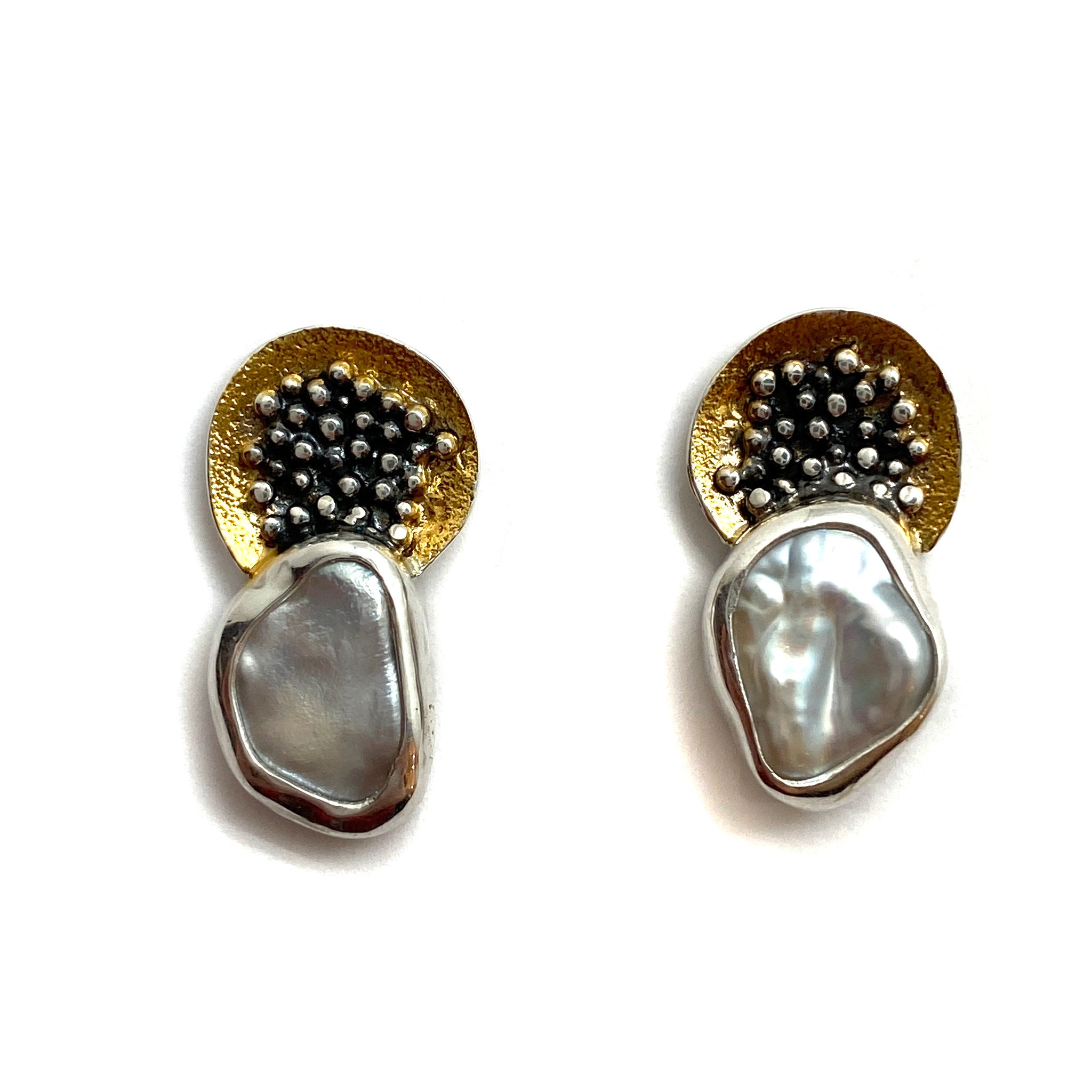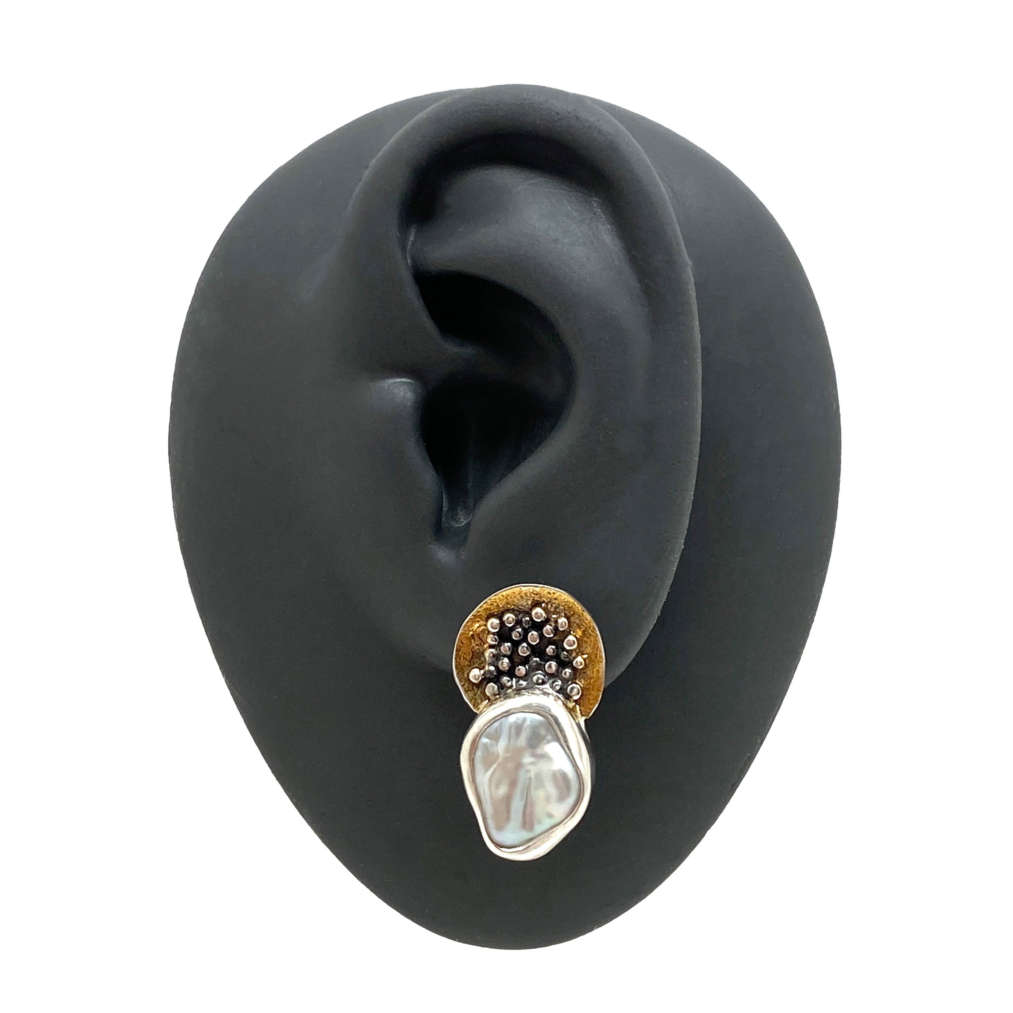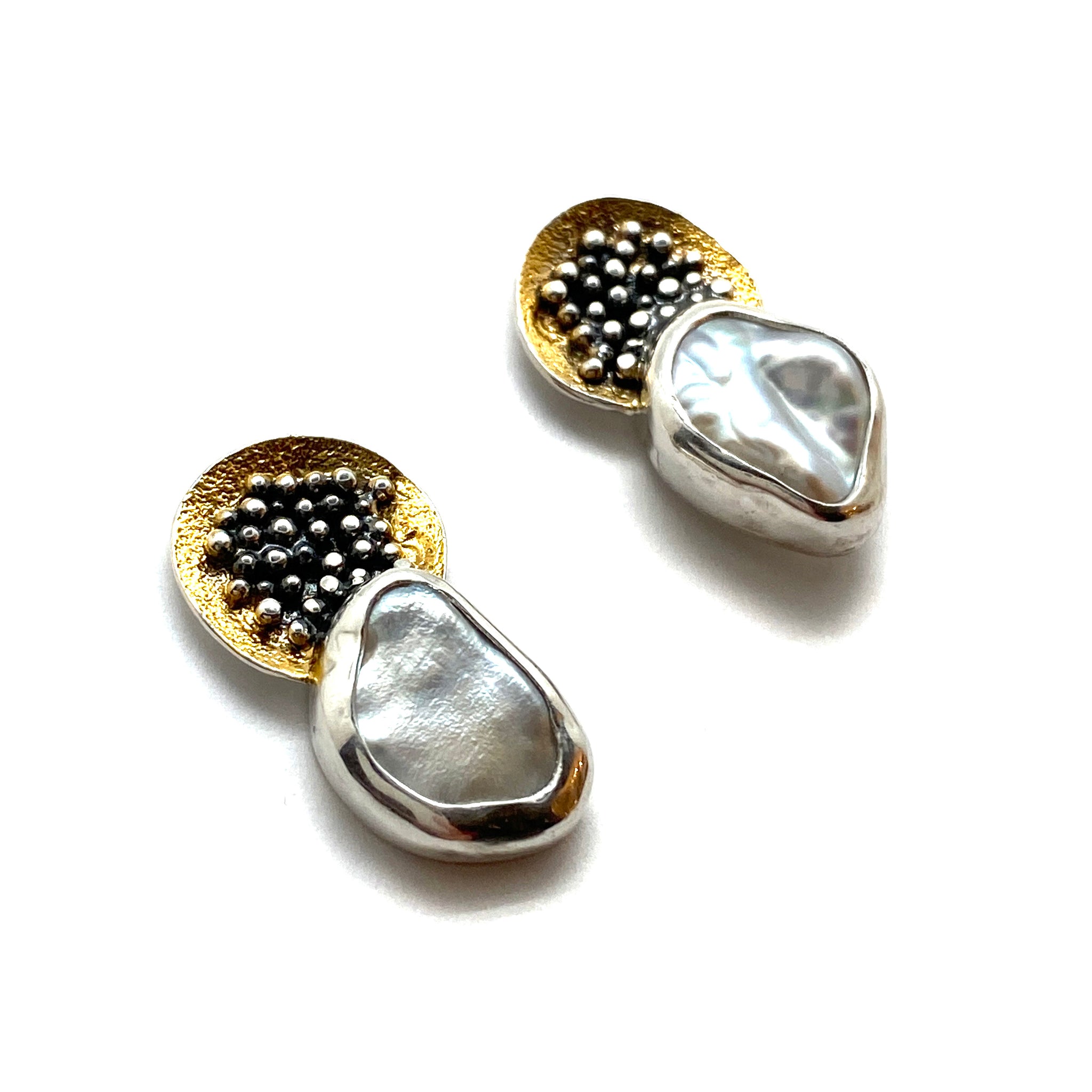 These aren't your average pearl earrings! Made with a mix of gold vermeil and textured bright and oxidized sterling silver, these studs have an elegant edge.