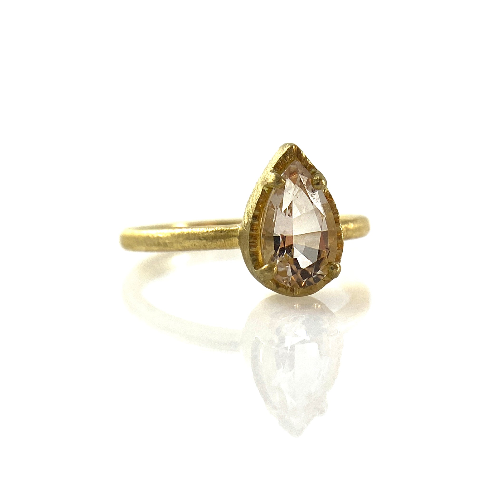 Featuring a dynamic, pear shaped morganite, this ring is a radiant choice for that special someone in your life. Made with 18k gold, this showstopping ring will last a lifetime.