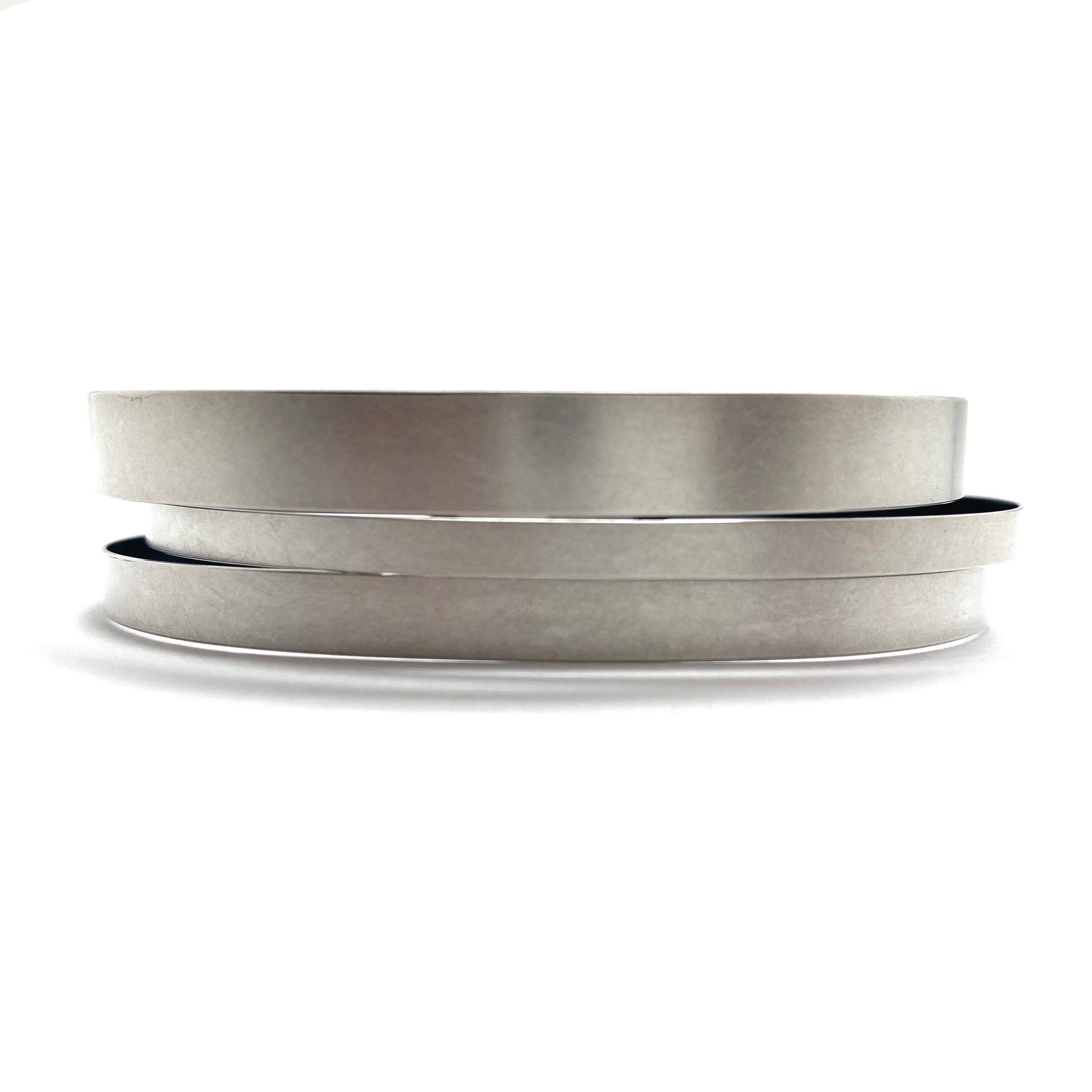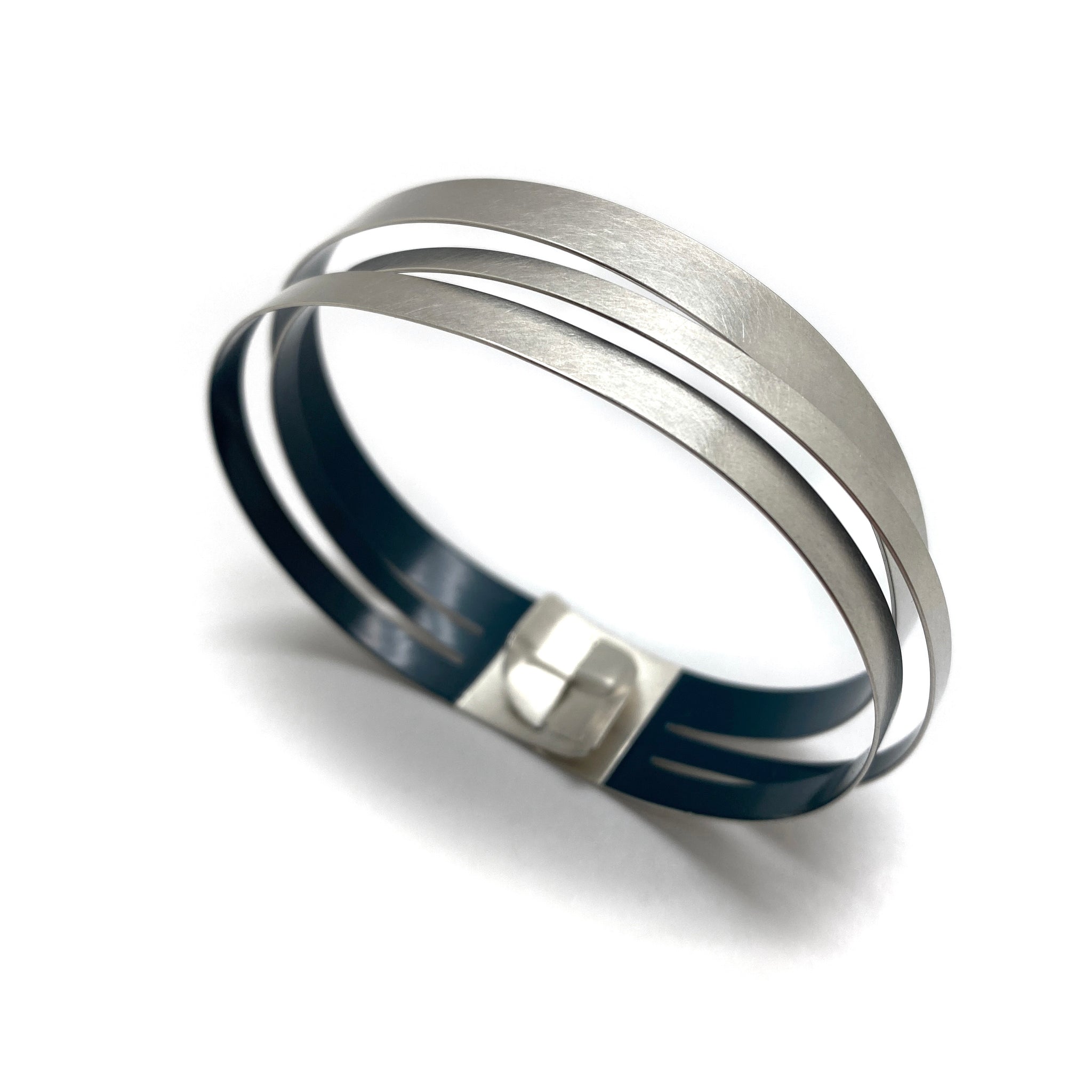 Futuristic and funky, this statement bracelet is made with bright sterling silver and navy blue lacquer. The blue hue peeks out from the inside for a subtle showing of color. This piece is finished with a secure slot closure mechanism.