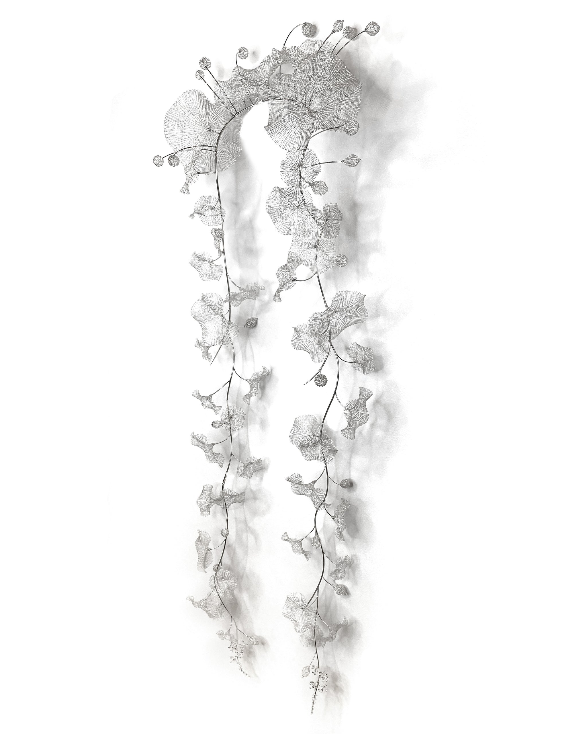 This one of a kind necklace from Sowon Joo is a collector's must have. This jawdropping necklace extends nearly 3.5 feet with hand crocheted sterling silver flowers and cast branches. This piece is wearable and will look absolutely stunning as a sculpture in your home.