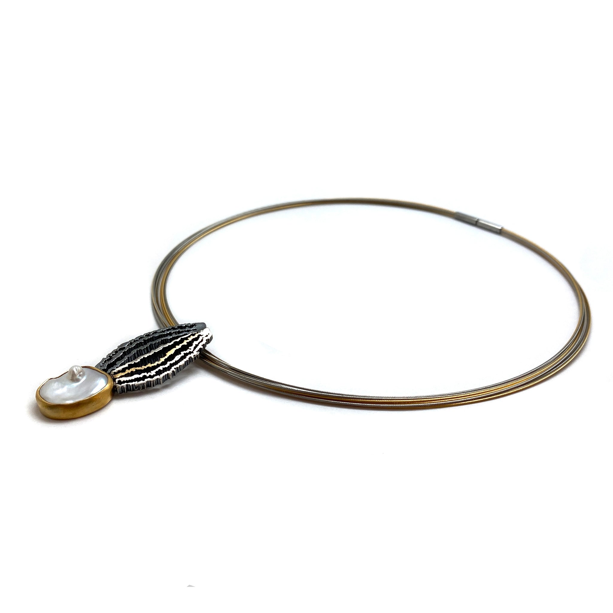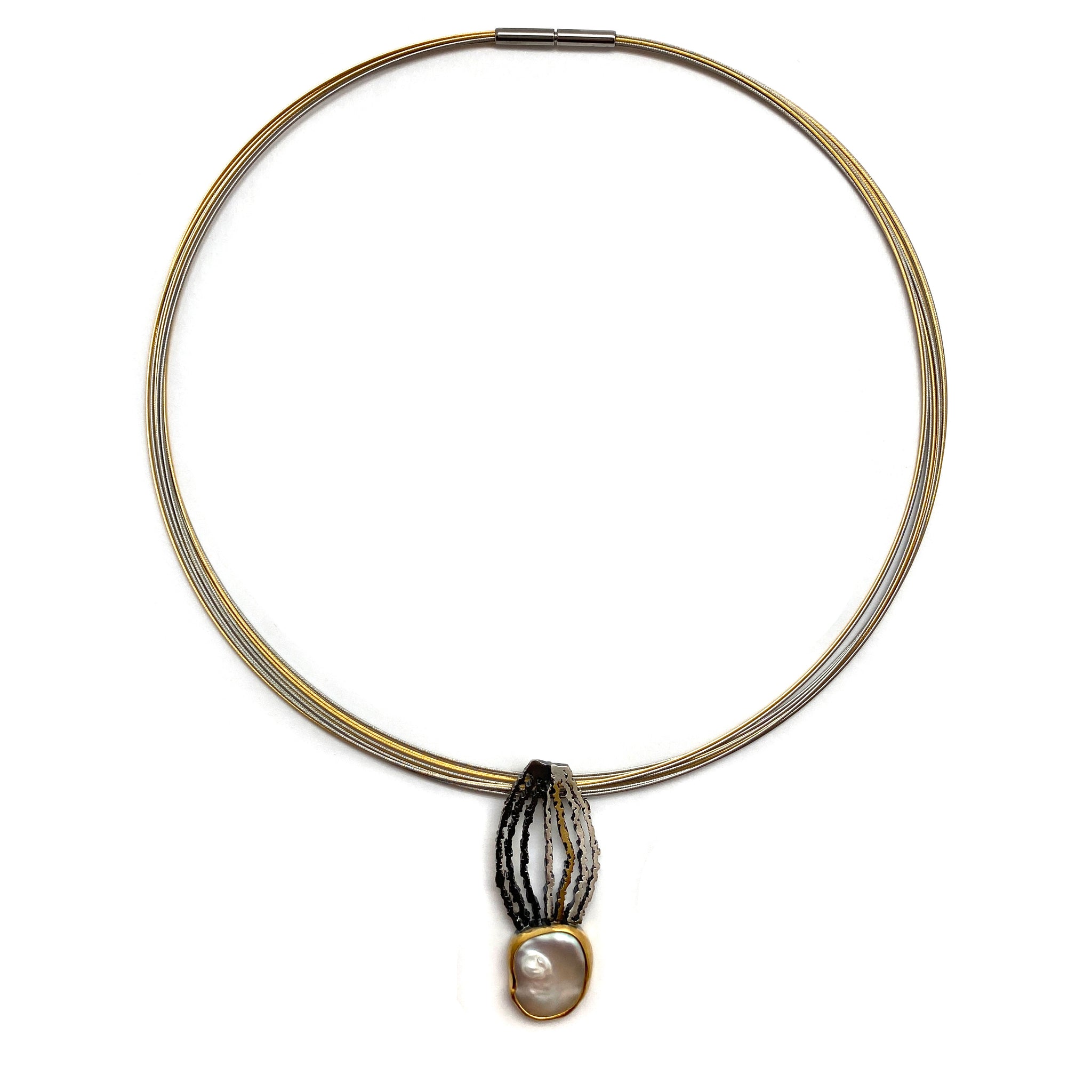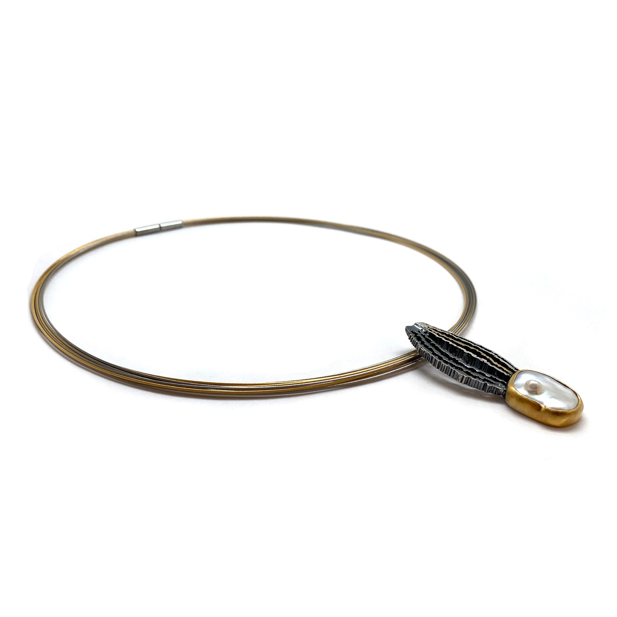 This organic pendant features a baroque pearl set in sterling silver and gold vermeil that accentuates the organic nature. This pendant can be removed for versatility from the nylon coated stainless steel cable and worn on any additional chain or cable you might already own.