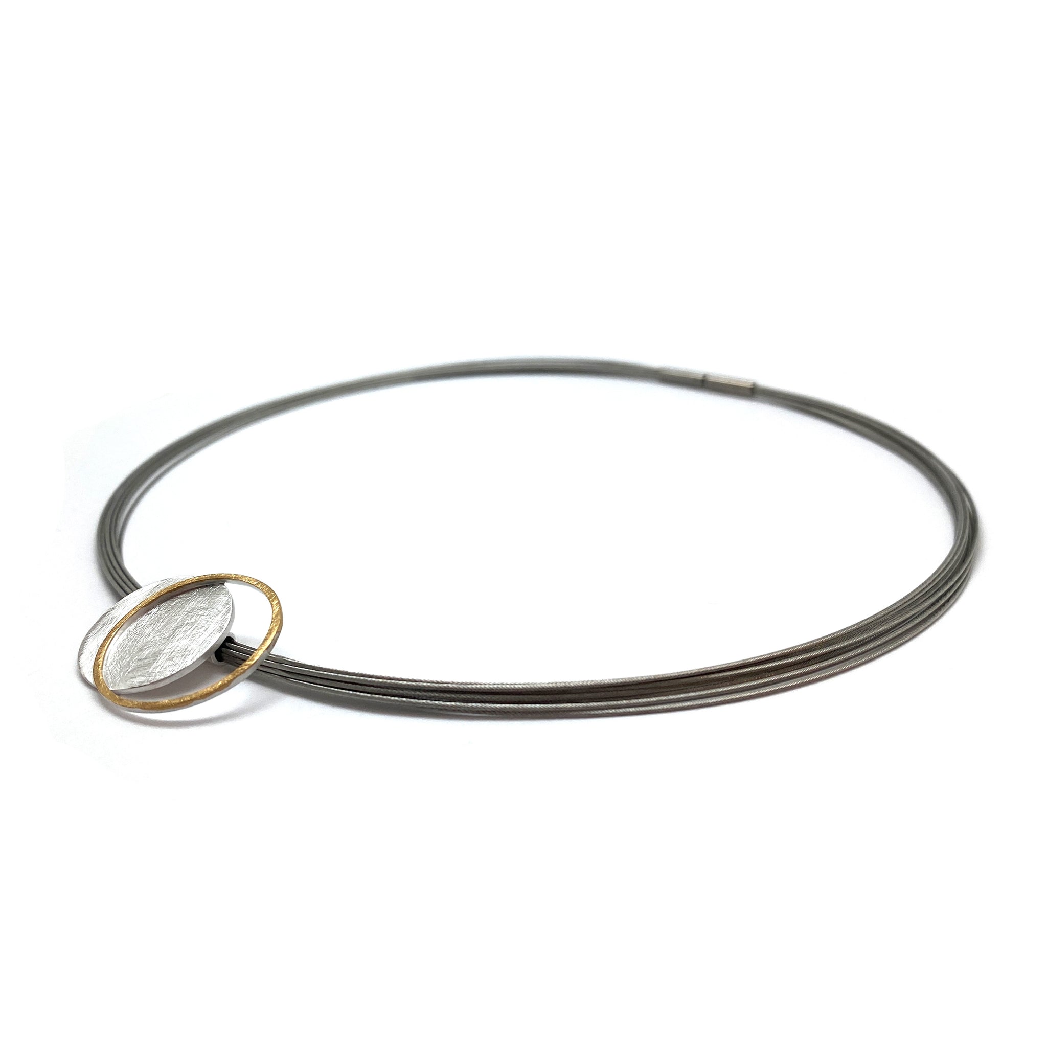 Lovely and light, this necklace from Manuela Carl mixes bright sterling silver, gold vermeil and dark stainless steel. Suspended from the circular steel, the pendant sits comfortably just under the neck.