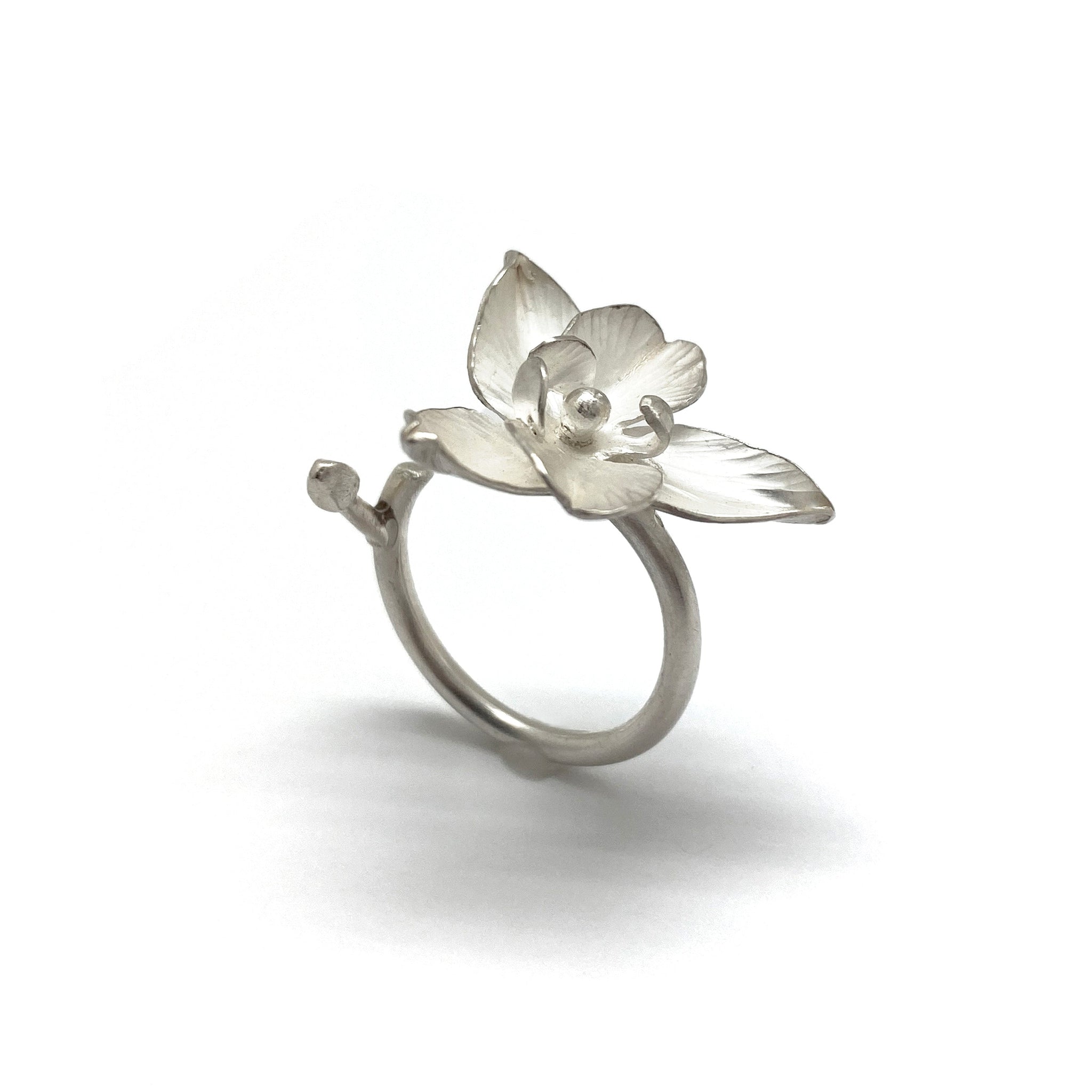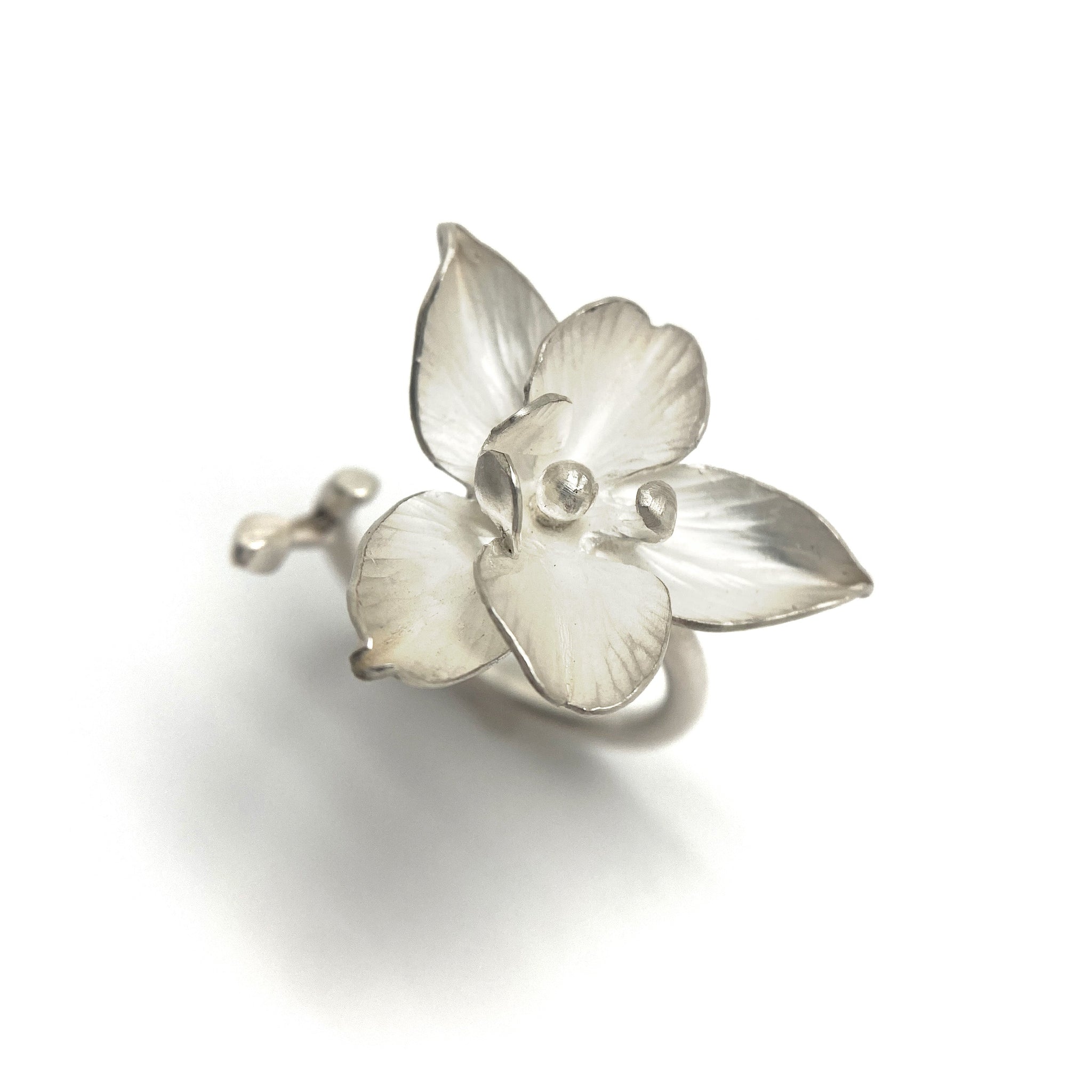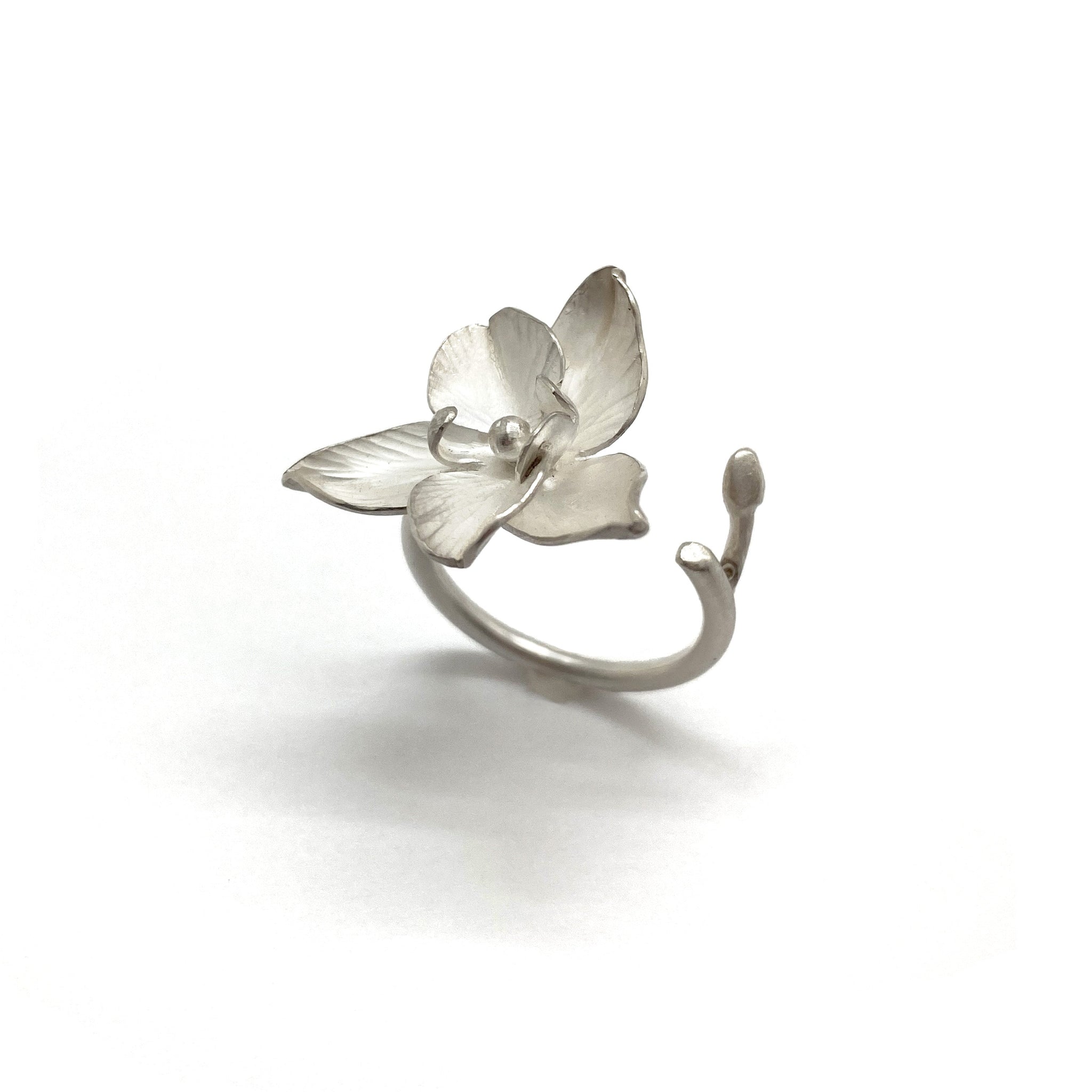 With an open design, this stunning orchid ring is incredibly comfortable to wear! Huiyu Chiu's sterling silver work has a unique white appearance, setting this ring apart from any other.