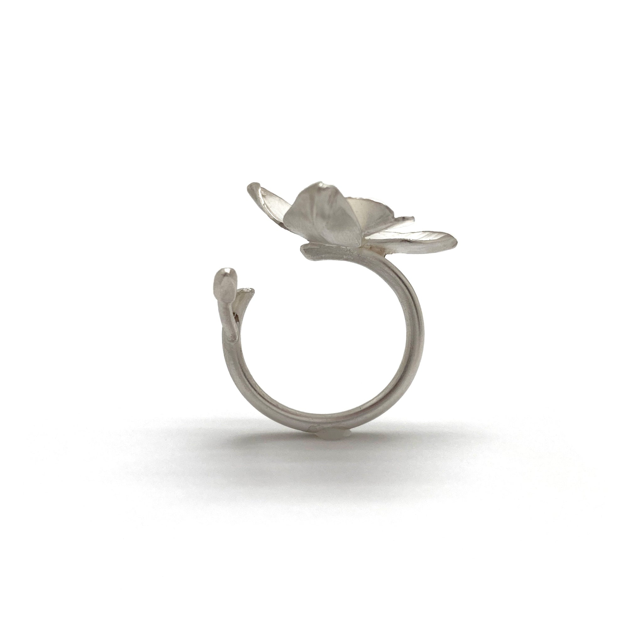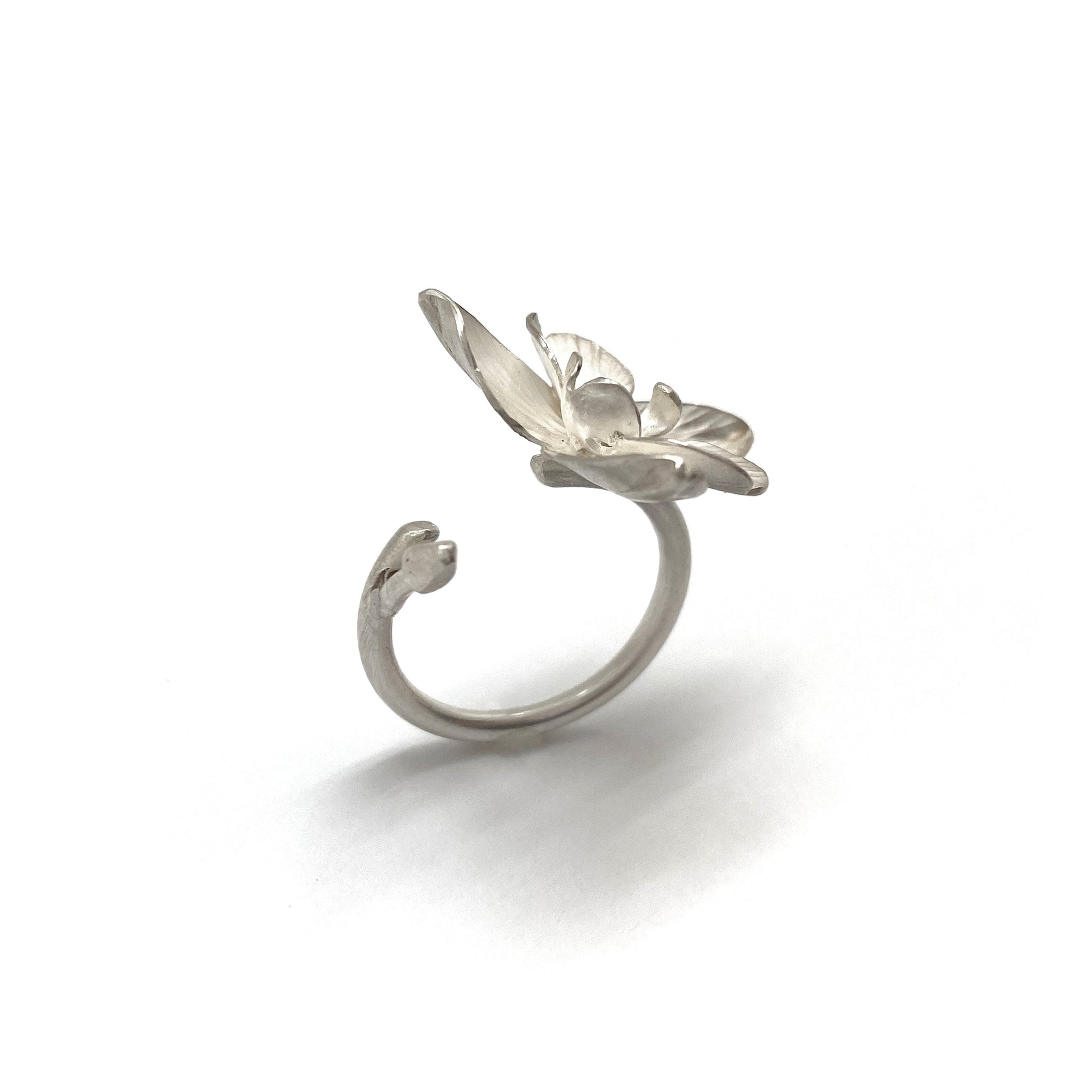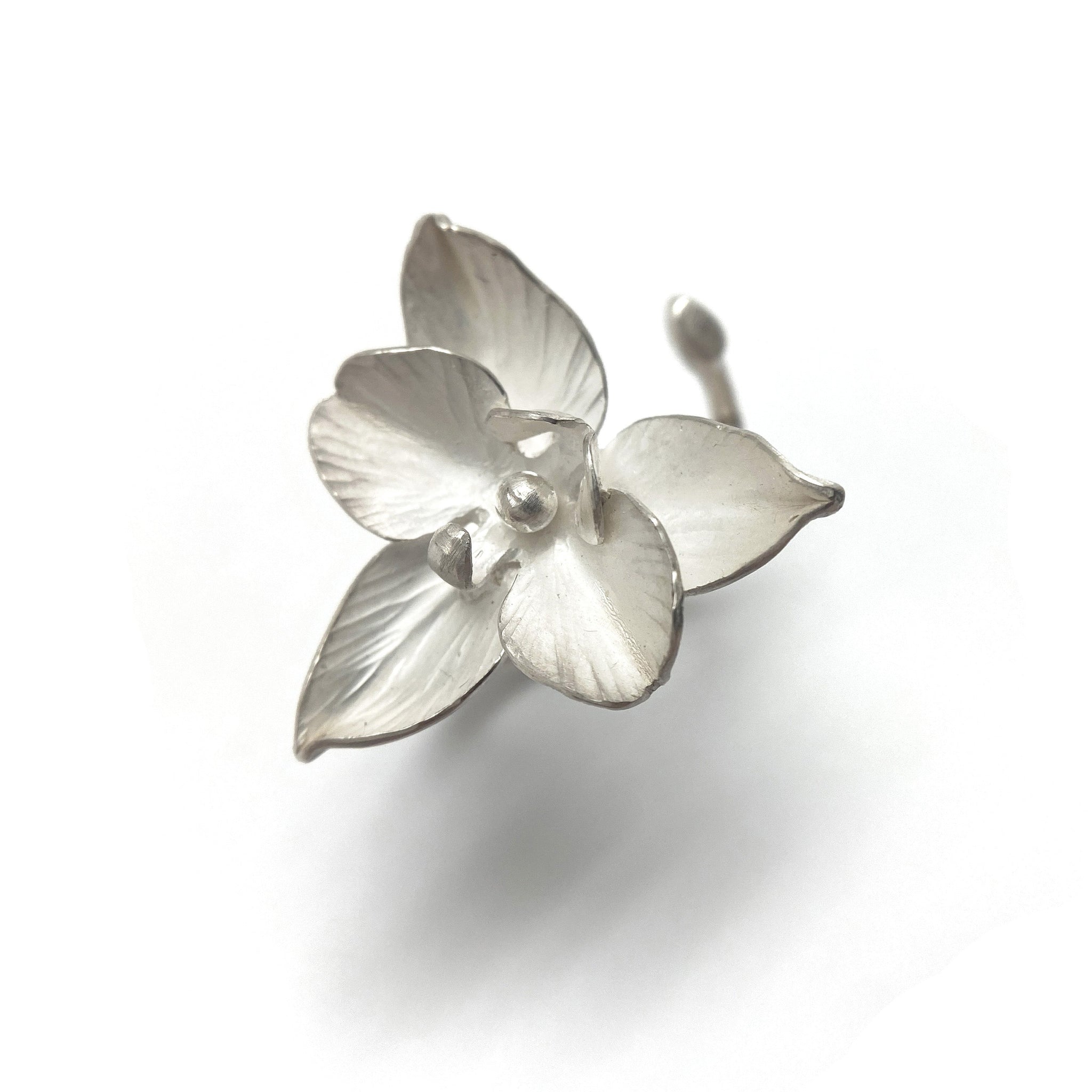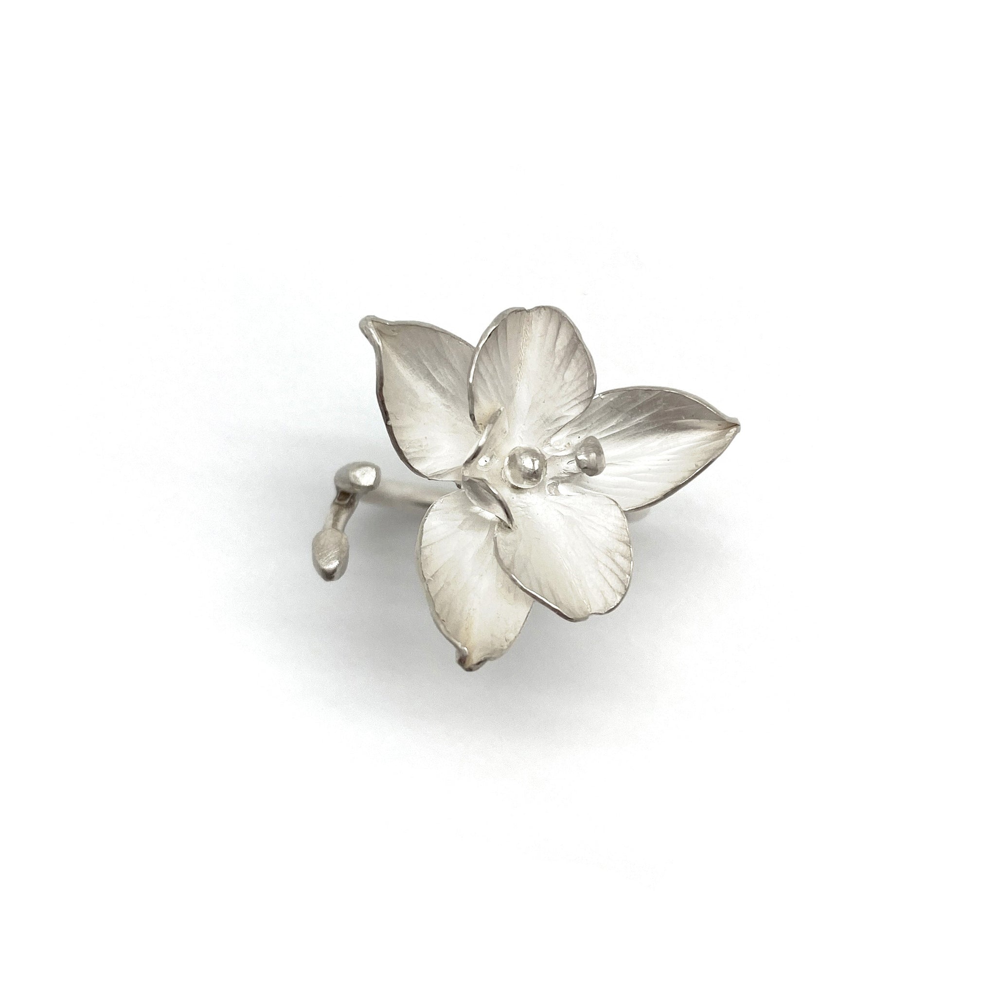 With an open design, this stunning orchid ring is incredibly comfortable to wear! Huiyu Chiu's sterling silver work has a unique white appearance, setting this ring apart from any other.