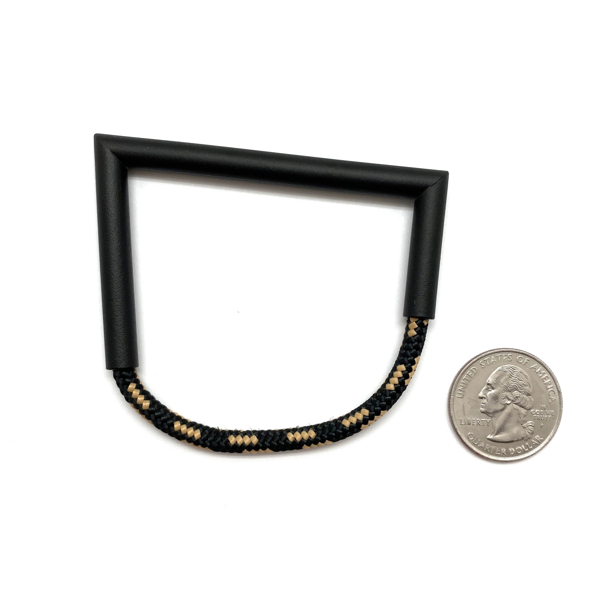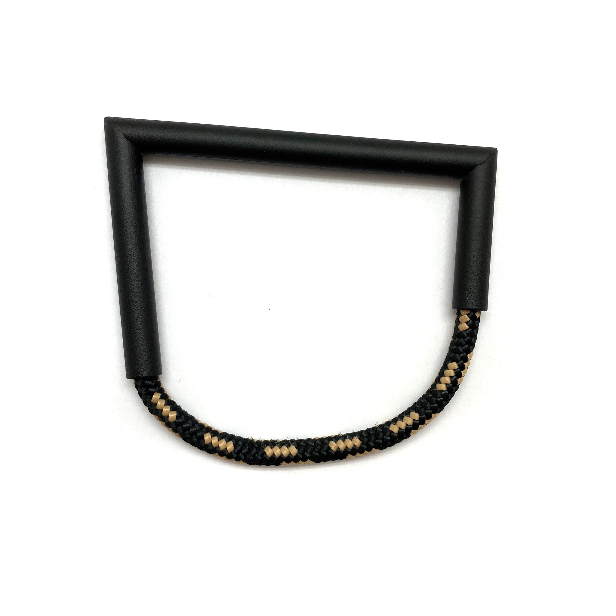 Unlike anything in your collection, this bracelet from Joanne Grimonprez mixes her signature, angular power coated copper with black and cream rope. While the bracelet is comfortable when worn, the rope does not have any stretch and must be slipped over the hand.