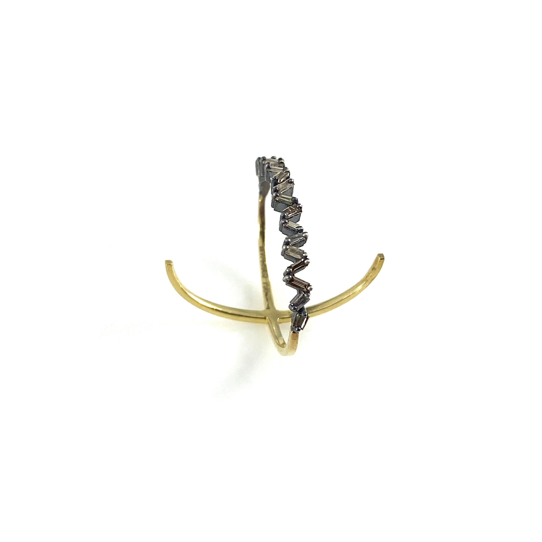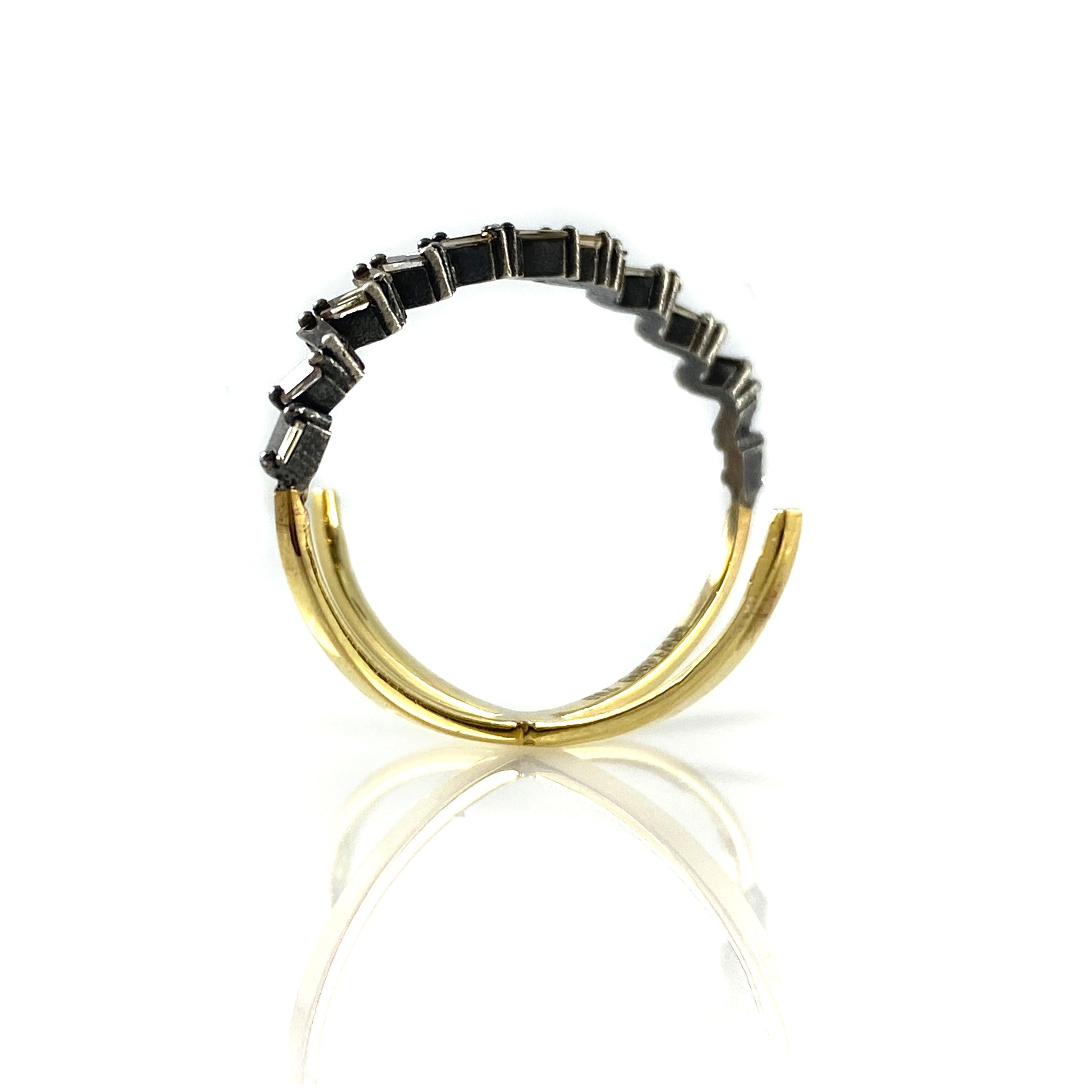 This unique ring is unlike anything in your collection. Rather than a traditional band, this ring has a comfortable "X" back to create an illusion of diagonal line of dark diamonds set in oxidized sterling silver across your finger.