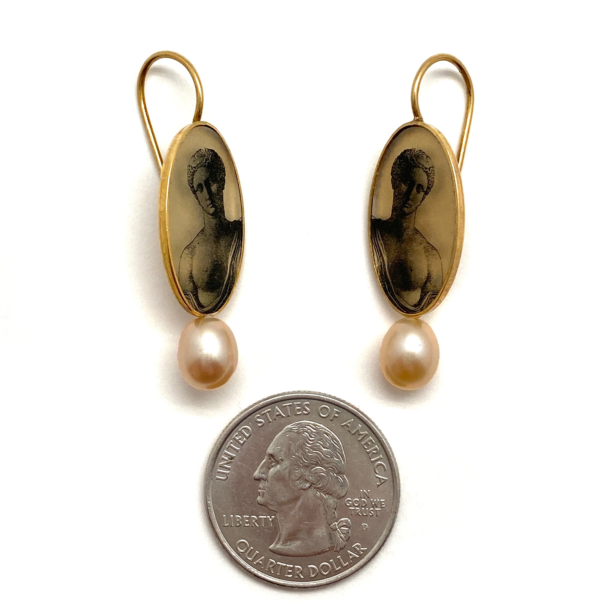 Adorned with peach freshwater pearls, these one of a kind earrings by Anna Bánkuti feature meticulously hand-drawn images of Aphrodite. Made in her studio in Germany, this pair by Bánkuti are a fabulous addition to any collection.