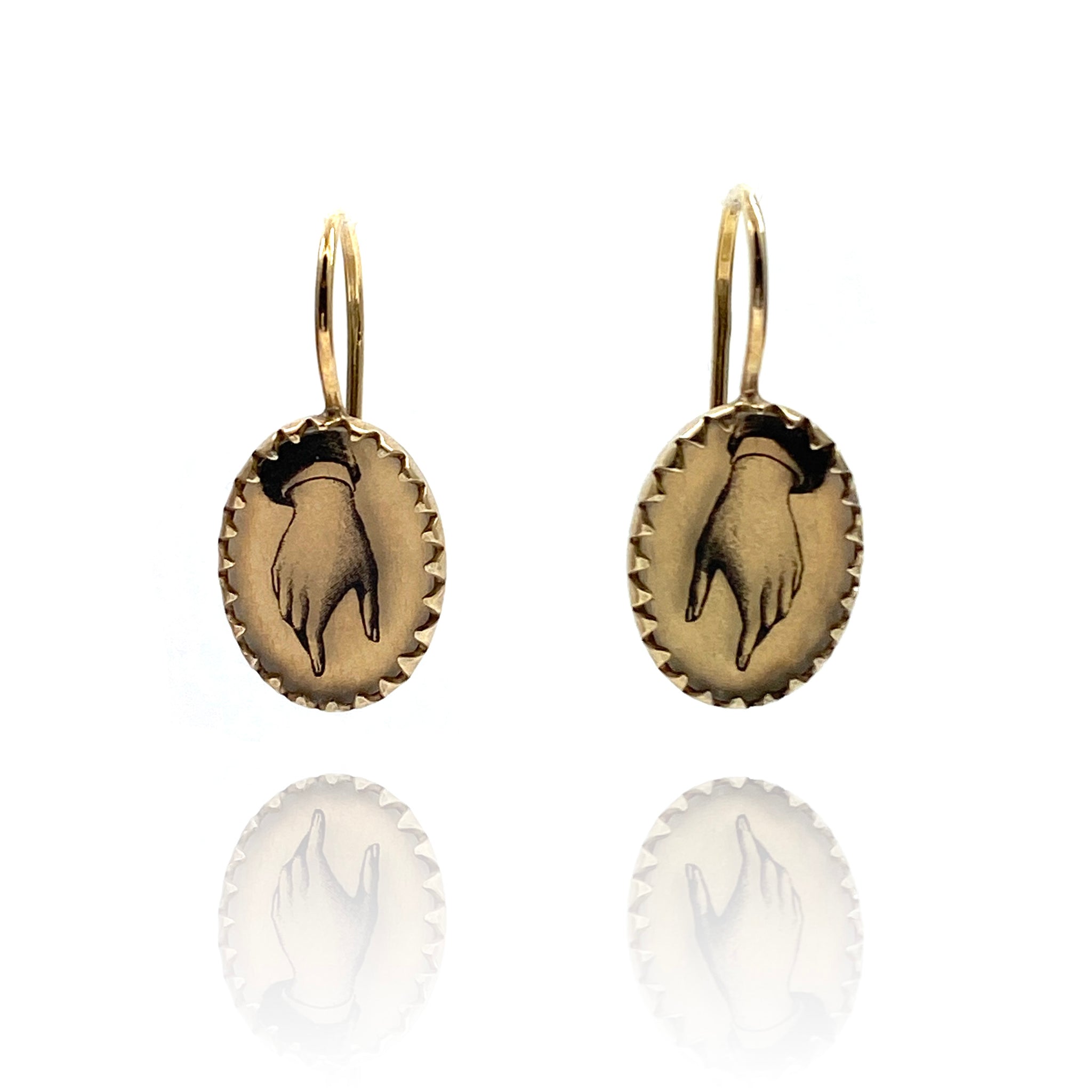 Channeling a vintage vibe, these gold vermeil earrings will add a touch of nostalgia to your collection. This one of a kind pair star hand-drawn Victorian-inspired hands.
