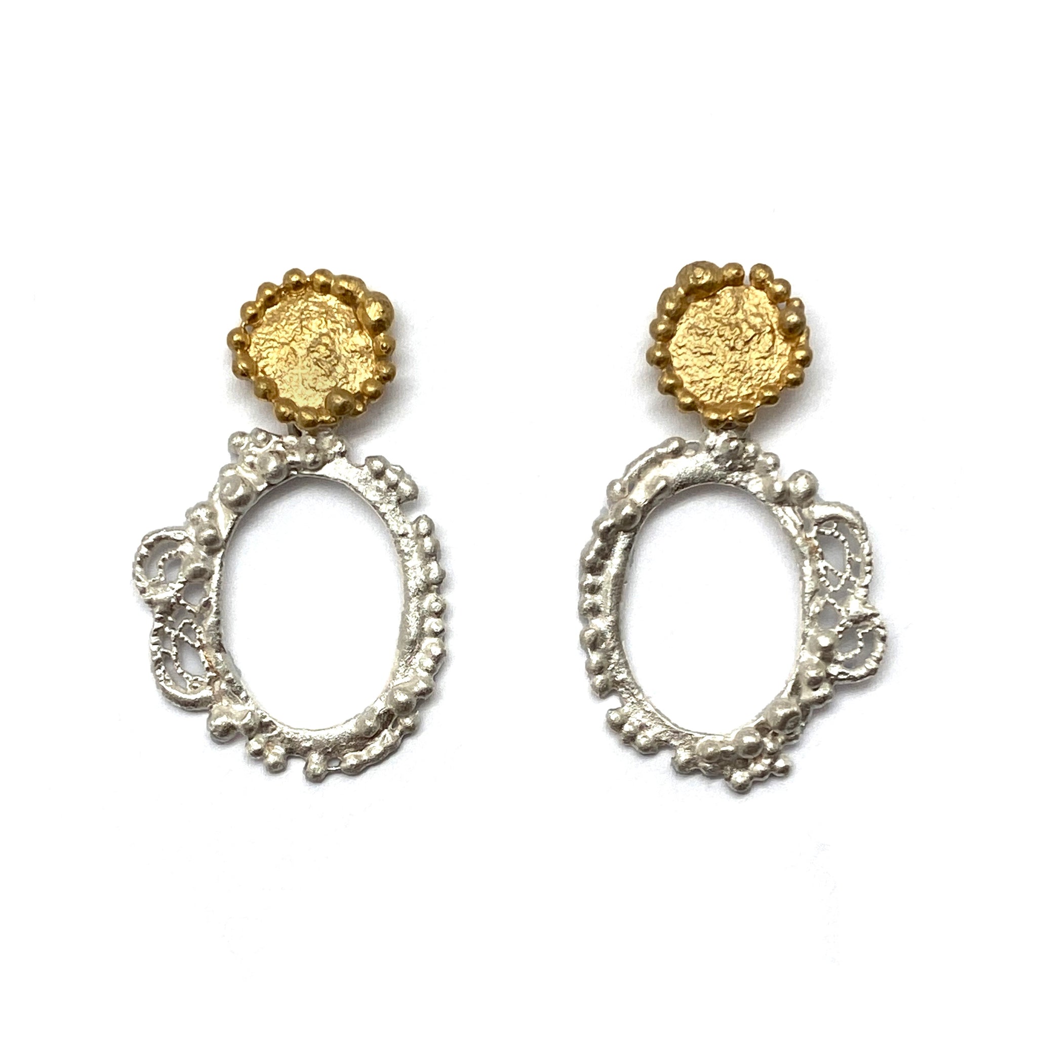 This pair of earrings from Anna Krol are an easy to wear statement. These mixed metal dangles are from her cast lace collection and feature one of a kind organic detail. Pair with either of her cast lace necklaces or the bracelet to complete the set.
