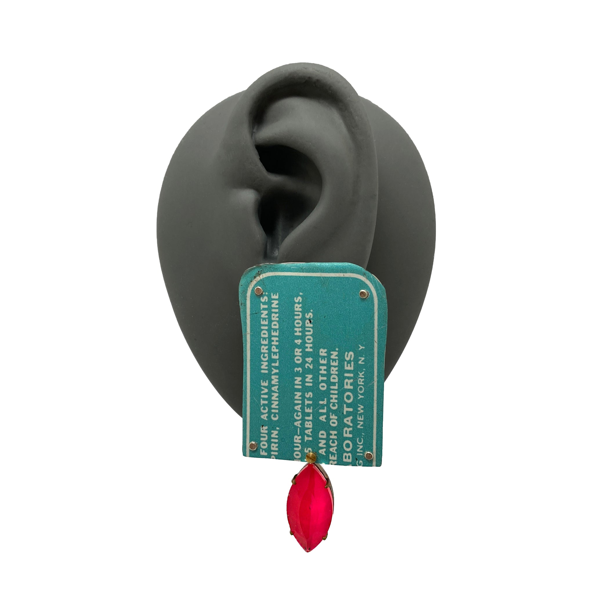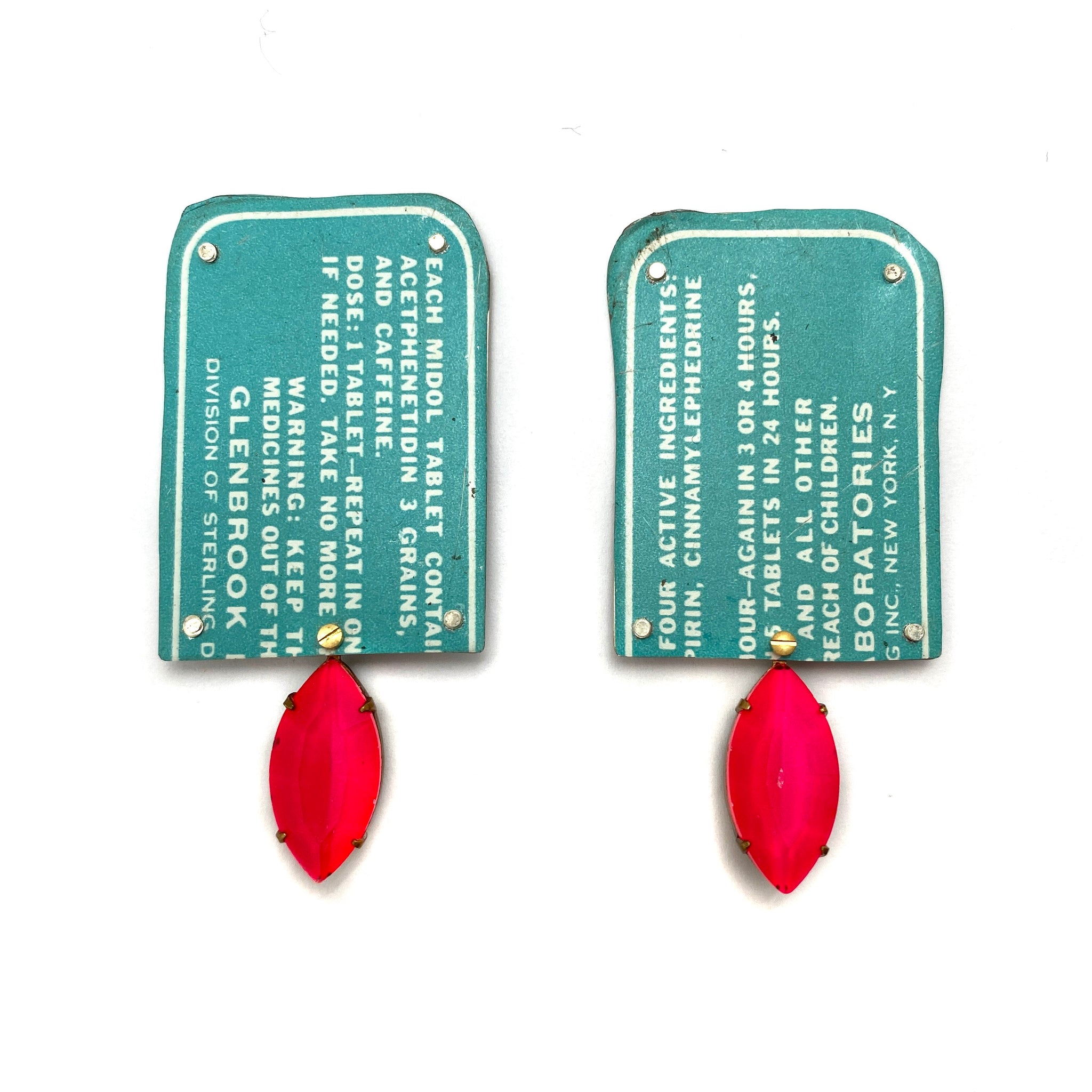 Bold, beautiful and with a hint of Barbie pink, these earrings from Carin Jones are one of a kind. This fresh pair are made with vintage Midol tins and accented with a hot pink acrylic 'gem'.