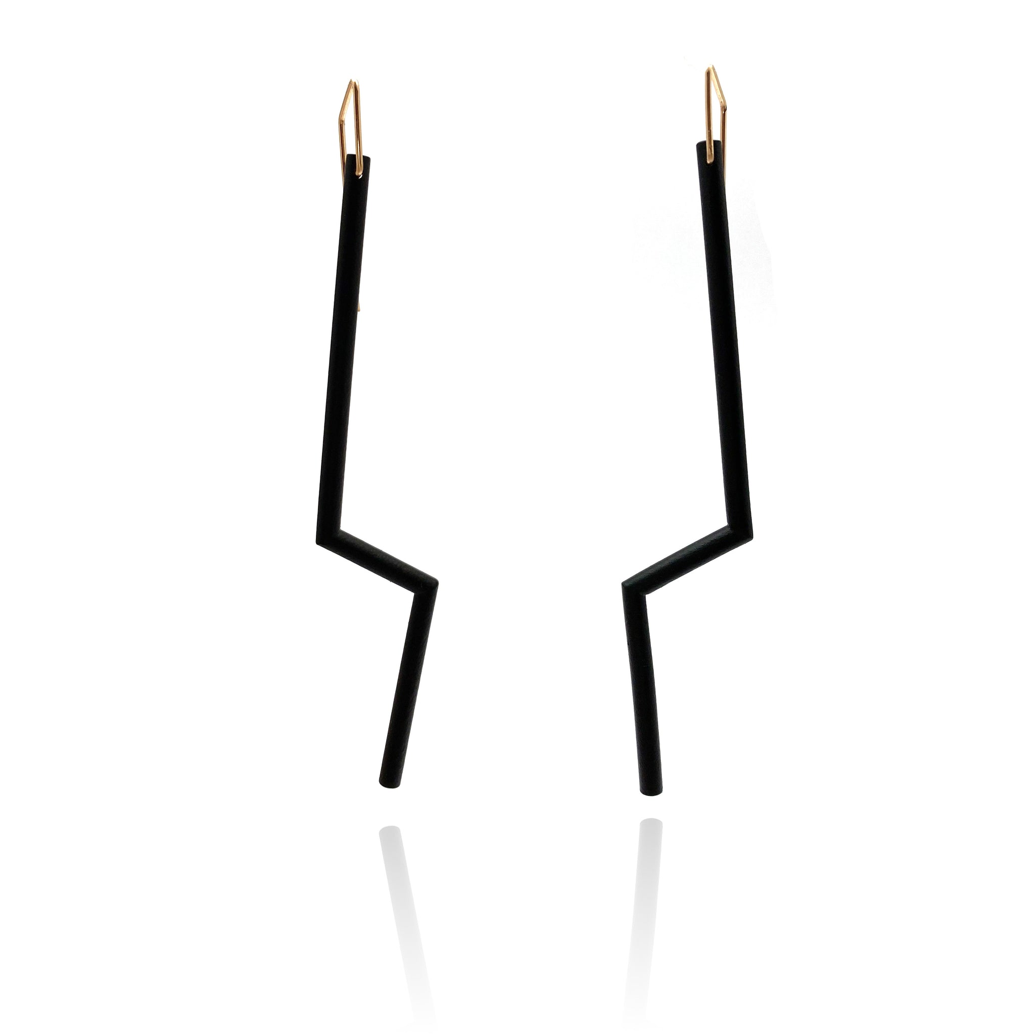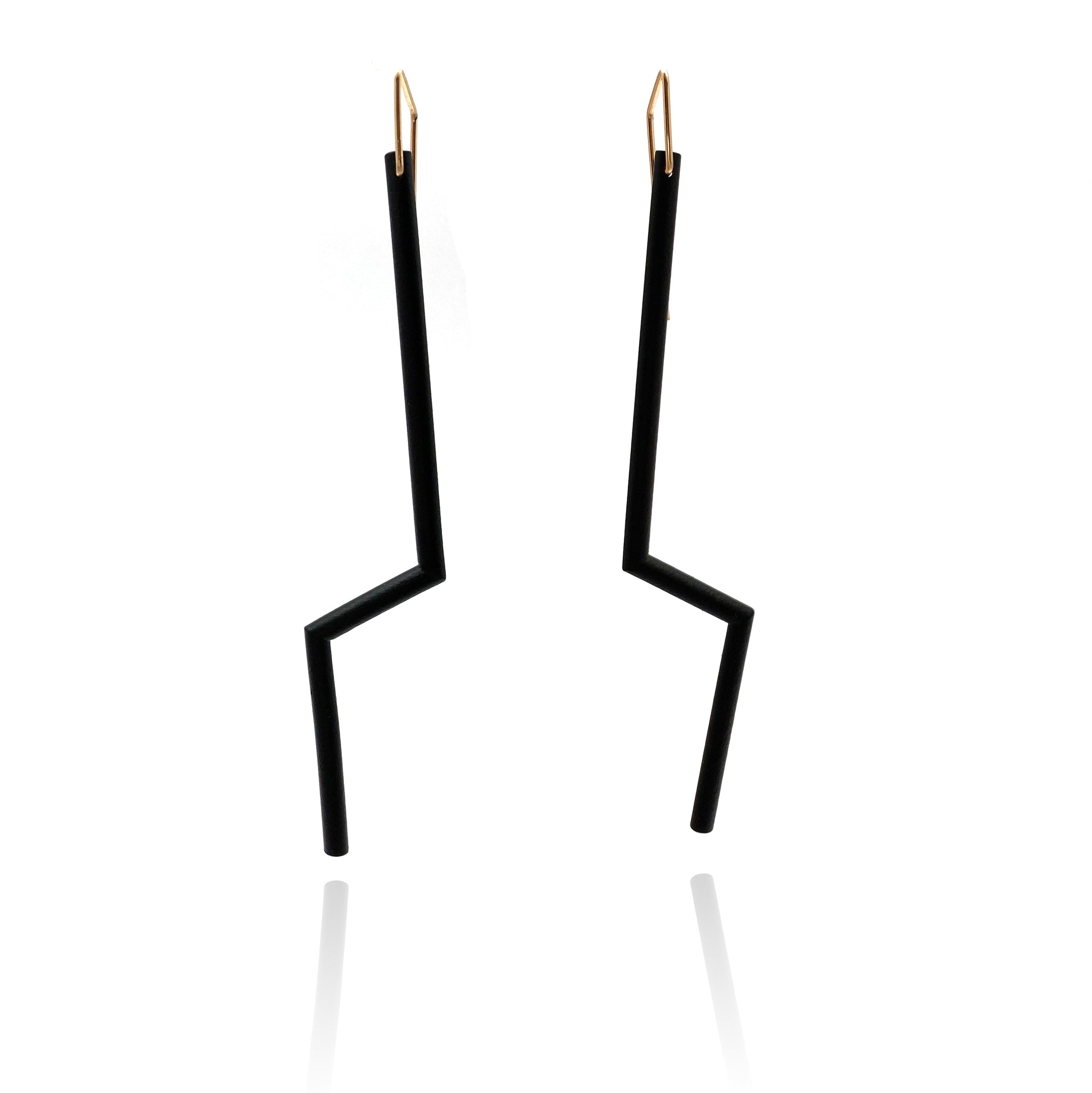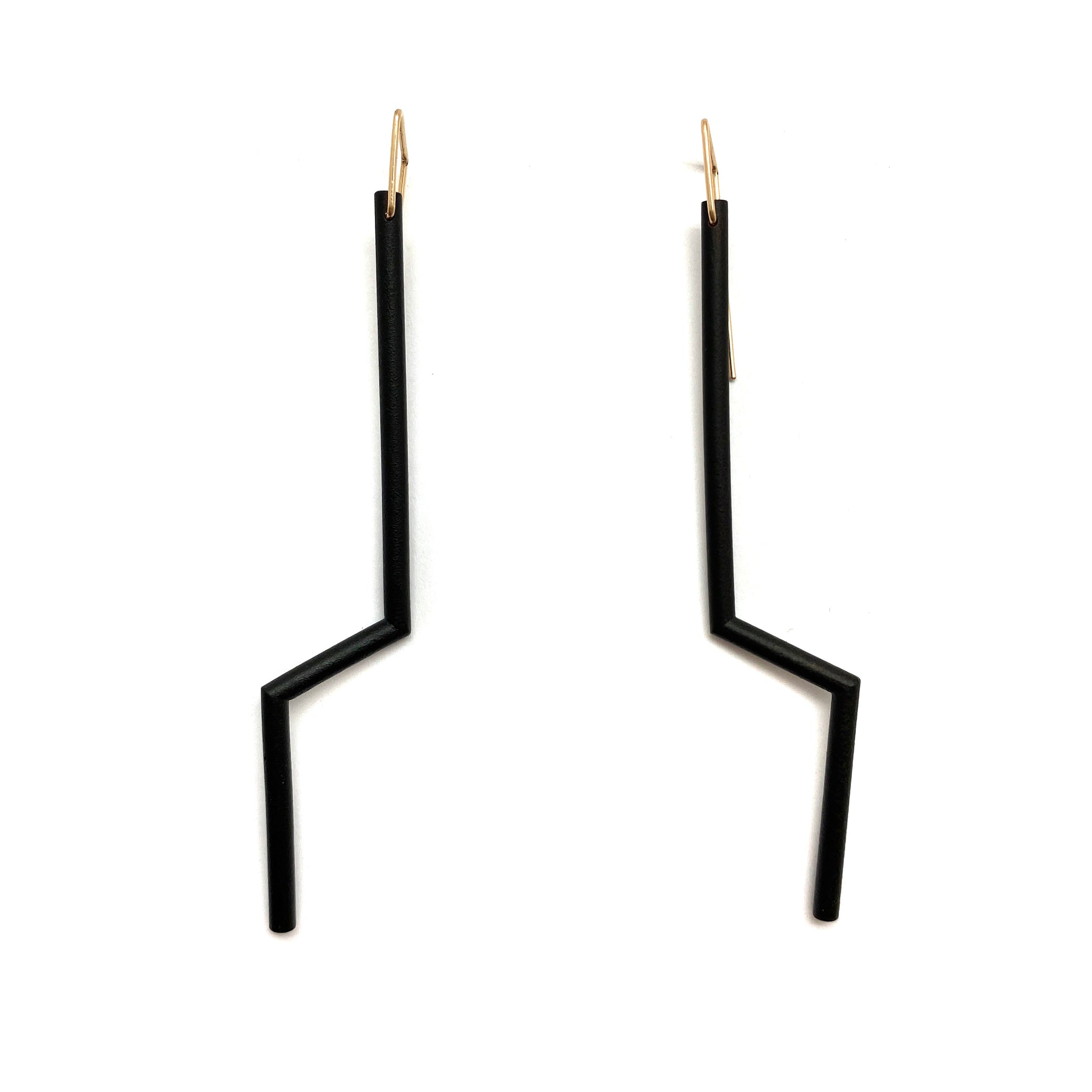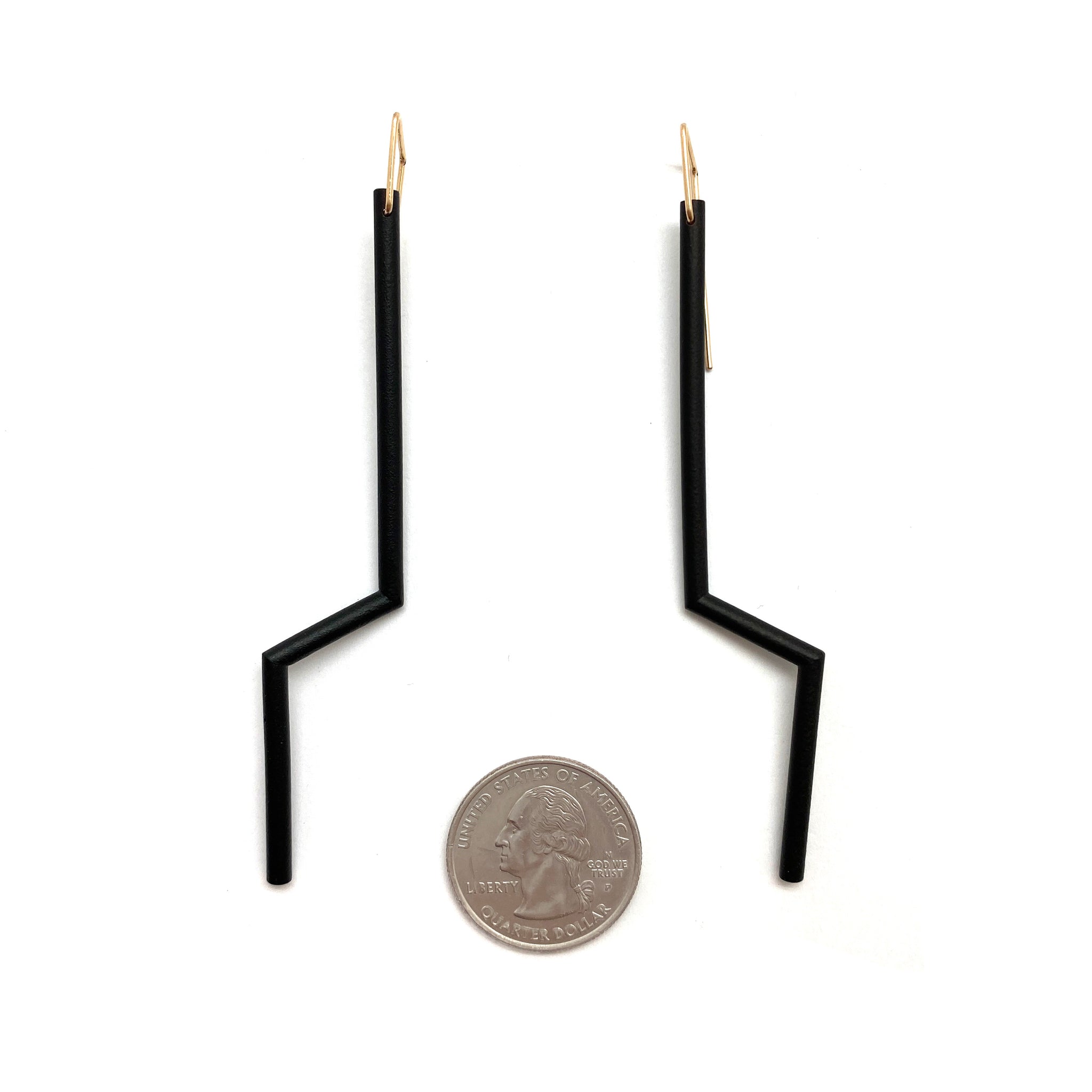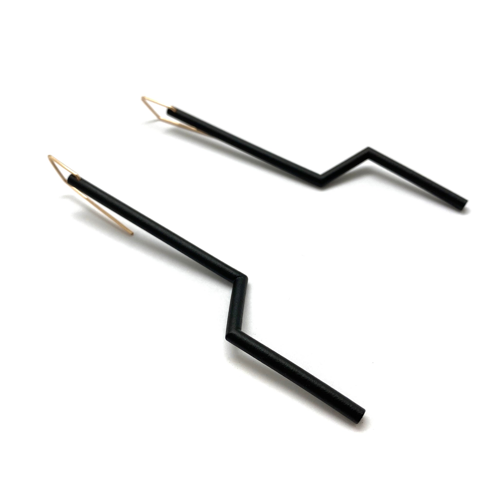 Let these angular earrings from Joanne Grimonprez add some edge to your earring collection. Made with her signature powder coated copper, this long pair are suspended from gold fill hooks.