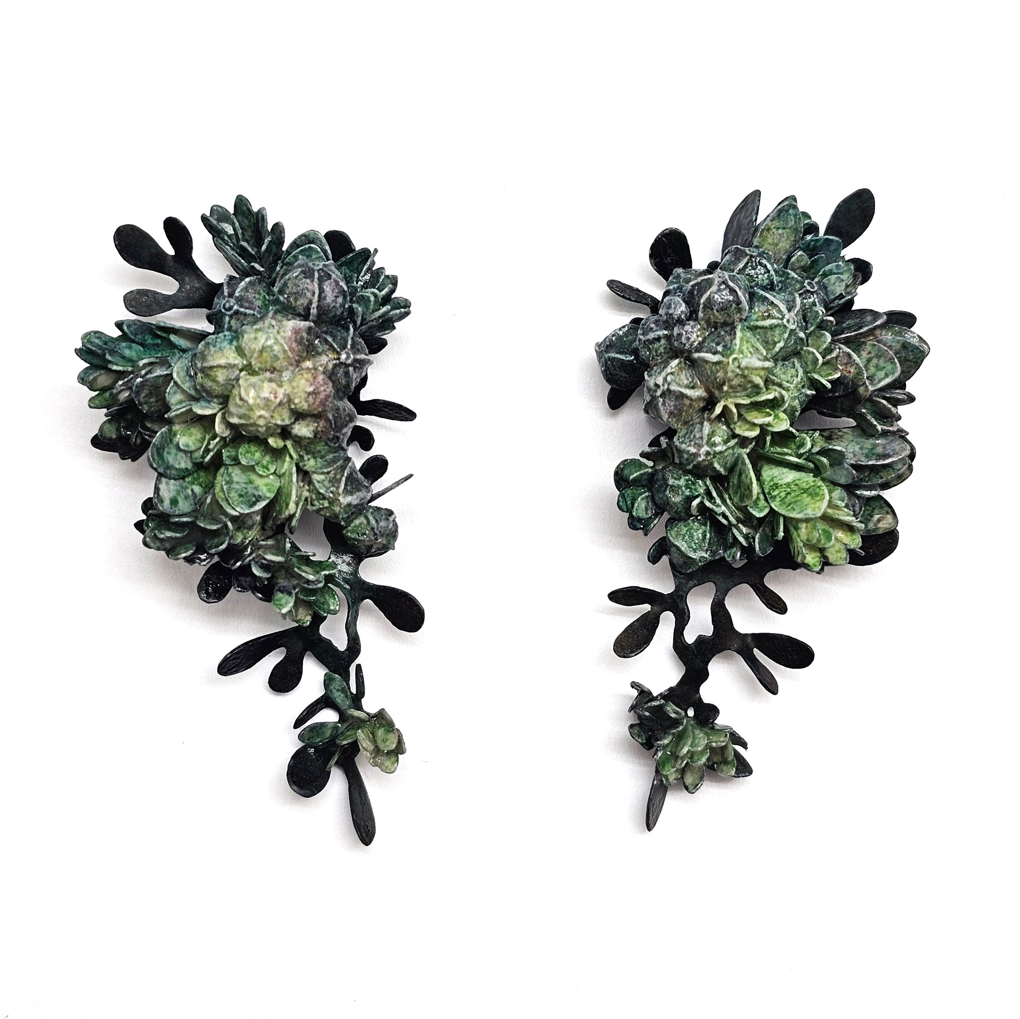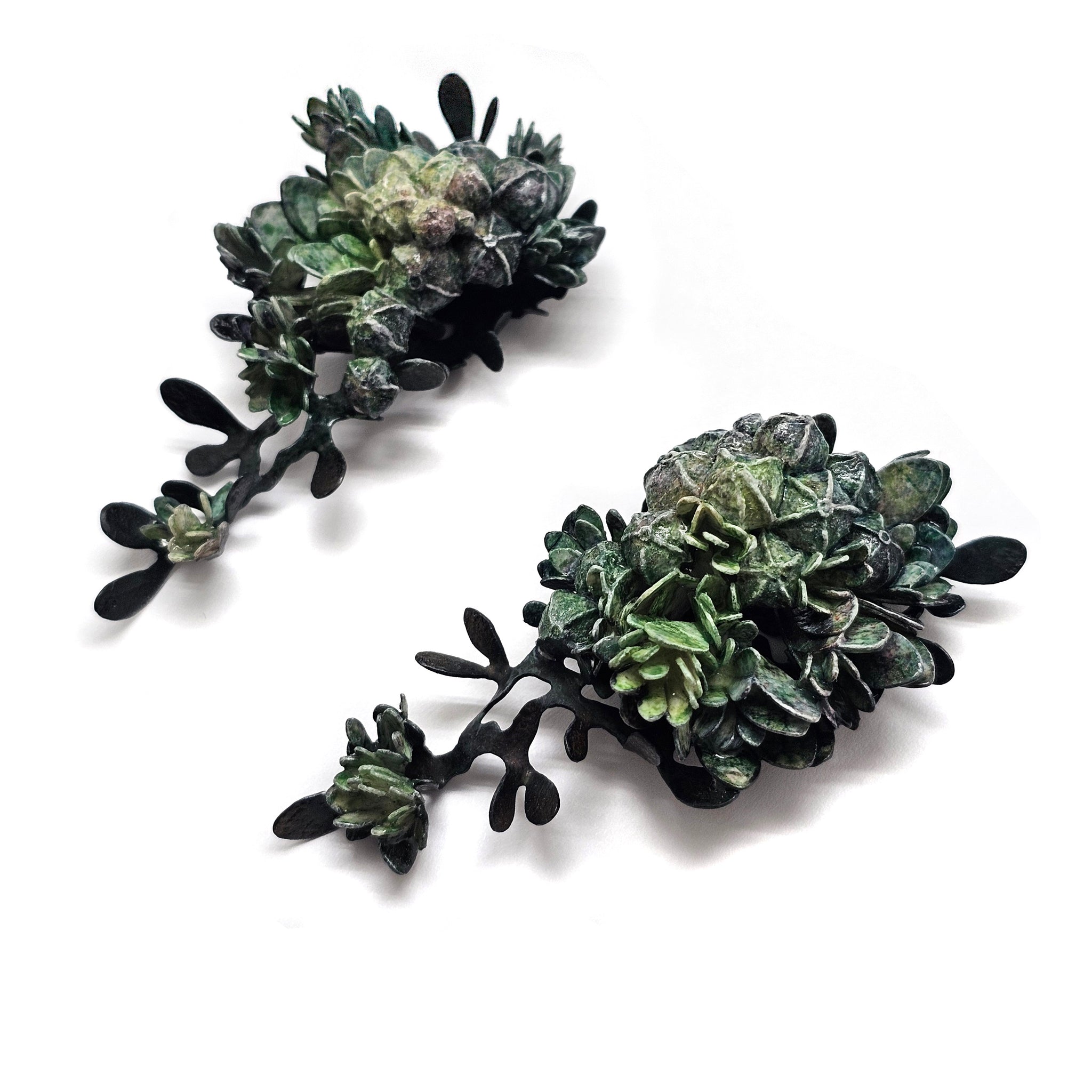 These sculptural earrings from Hanna Liljenberg are bountiful bouquet of botanicals. This one of a kind pair are made with seed cases preserved in paint, paper and lacquer and cradled by brass cut outs in a blue-green color way.