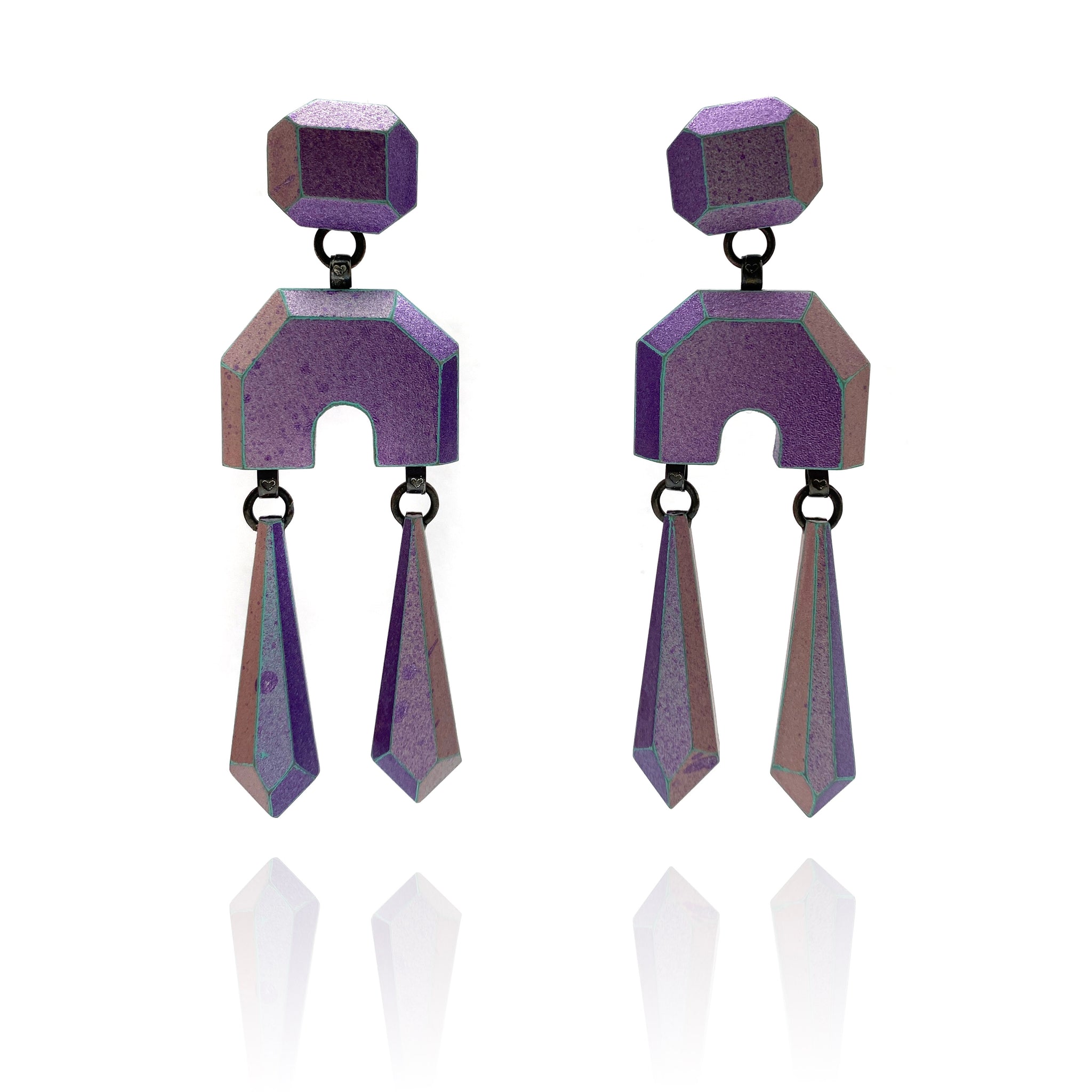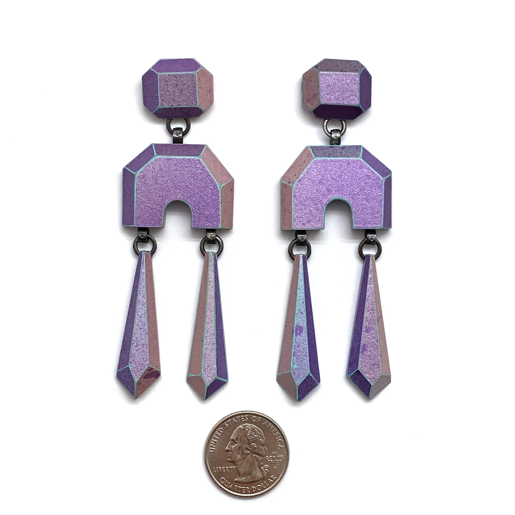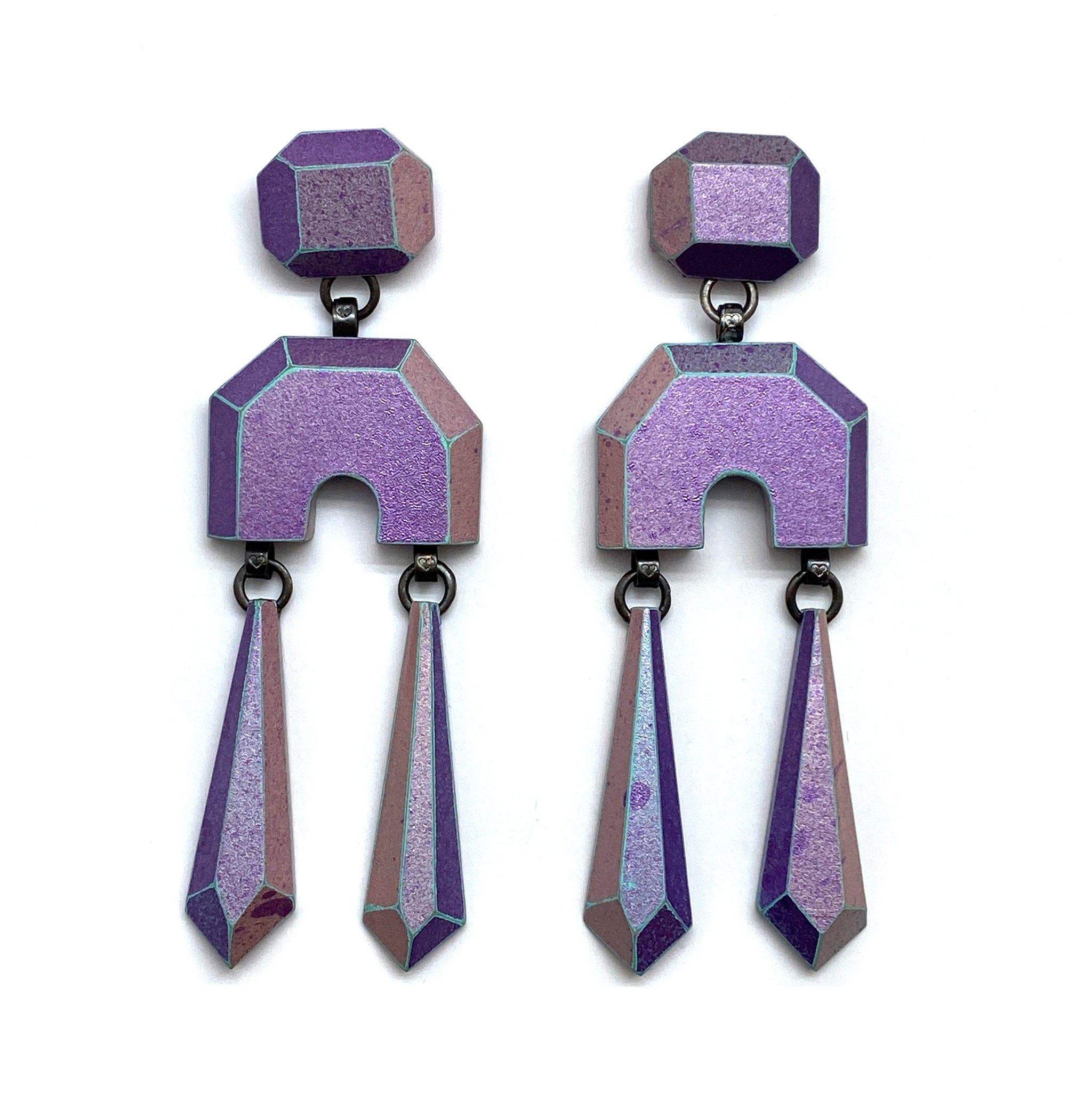 This multi-tier pair from Eva Burton are an energetic addition to any bold collection. Painted with iridescent purple and accents of blue, these gemstone inspired earrings are a great statement.