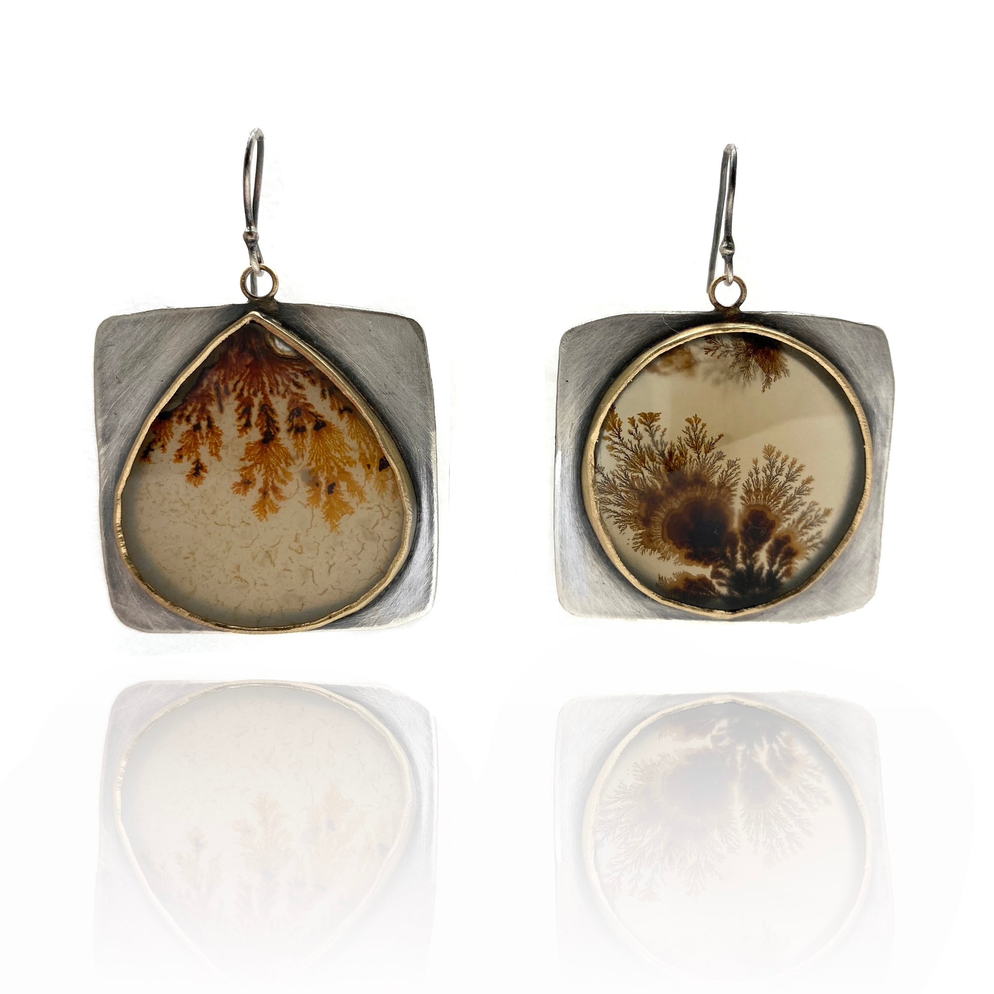 Made by Lori Francescutti, this one of a kind pair have a wonderful warmth. Suspended from sterling silver hooks, these earrings feature asymmetric pieces of Dendritic Agate are set in 18k gold bezels on sterling silver squares.