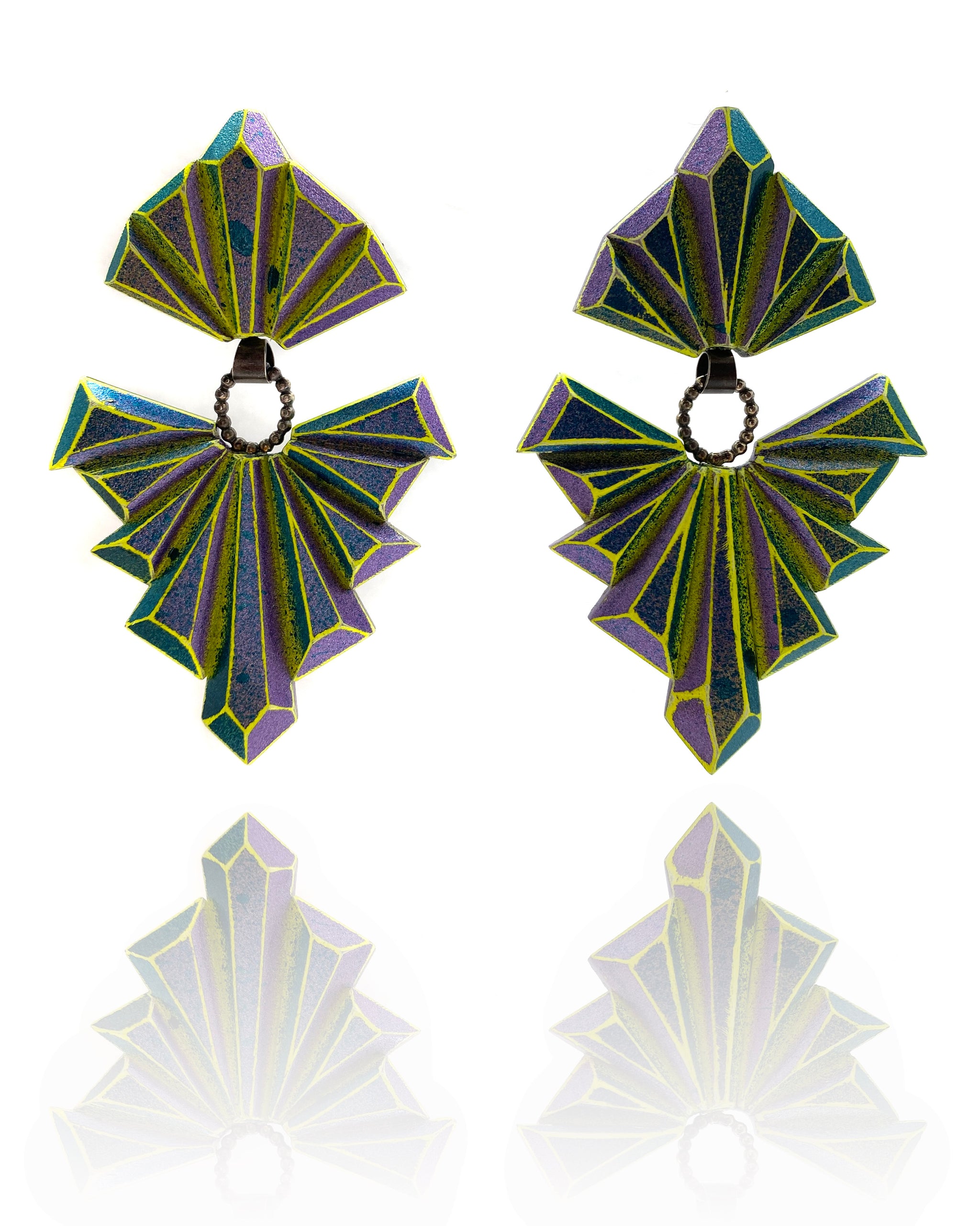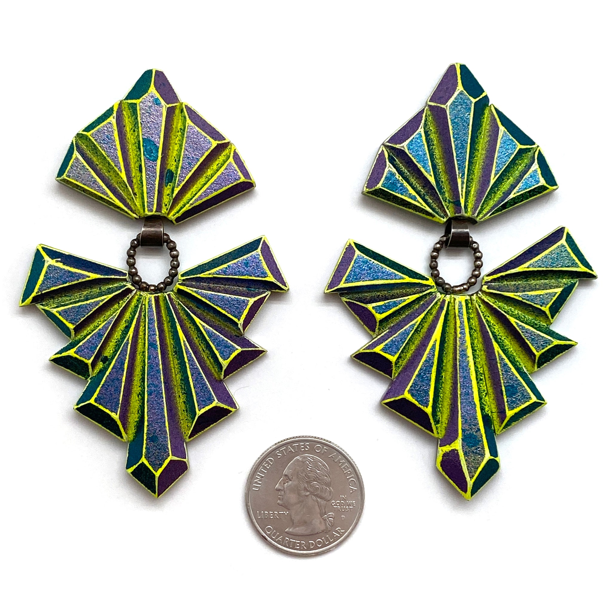 Made with a lightweight wood and painted with a cool mix of greens, blues and purples, these statement earrings are a stand out. This post back pair feature two sections secured with a ball chain link for subtle movement.
