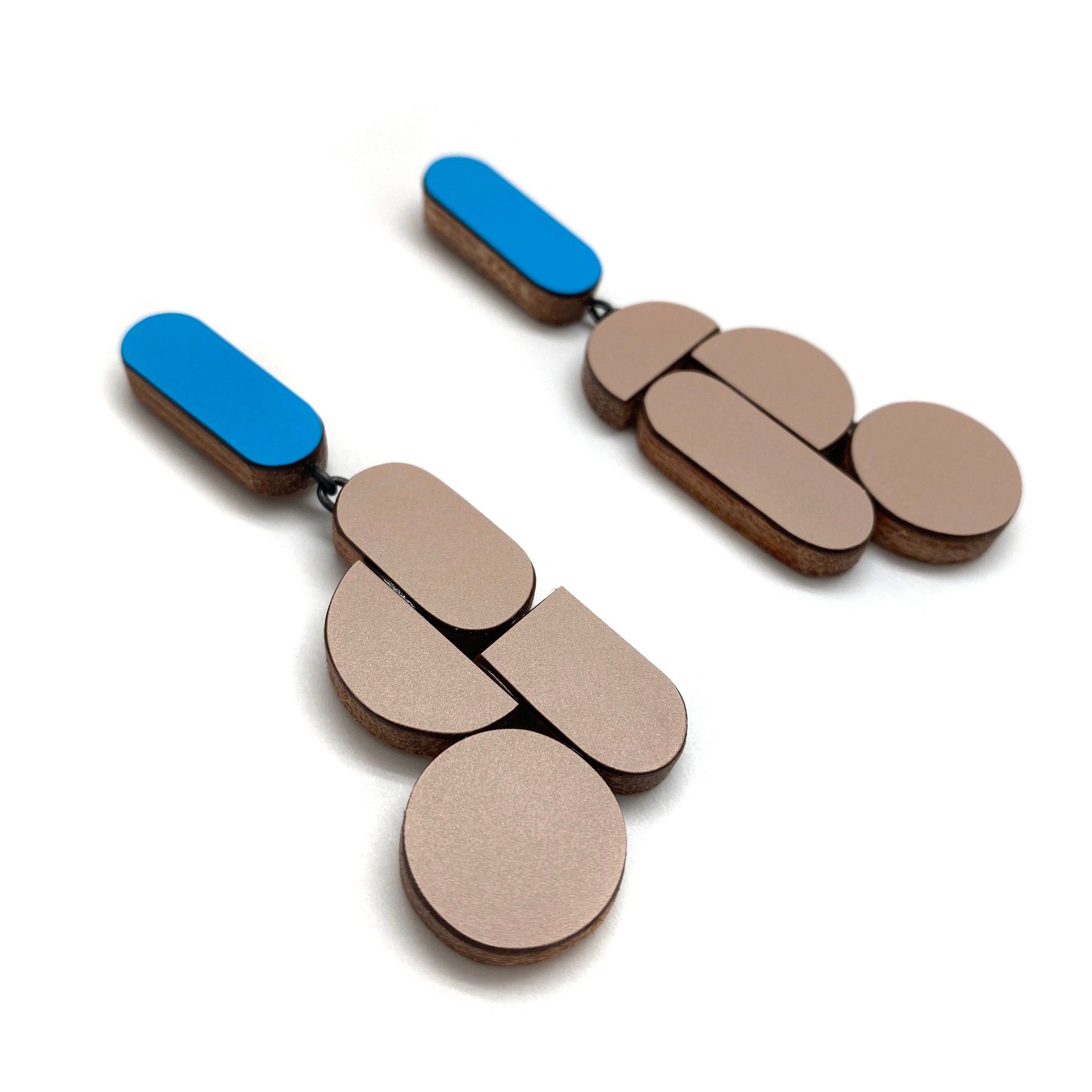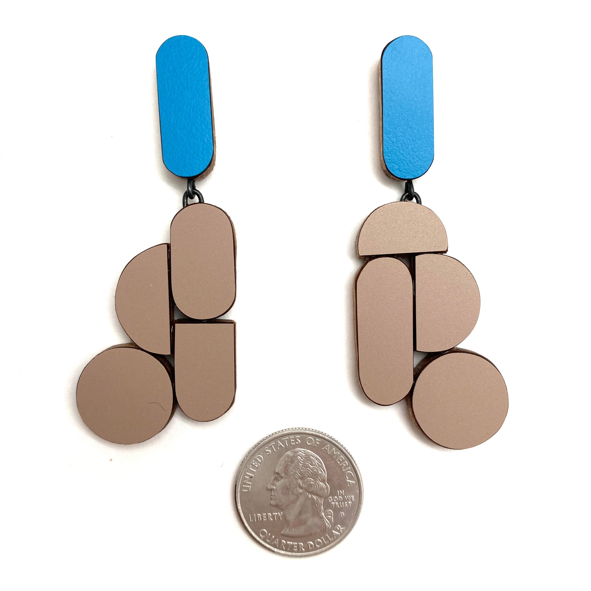 This geometric pair from Karen Vanmol are a fun mix of shapes and sizes. The bright blue post backs are extra eye catching!