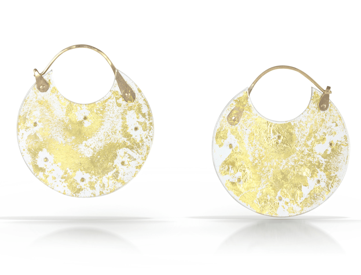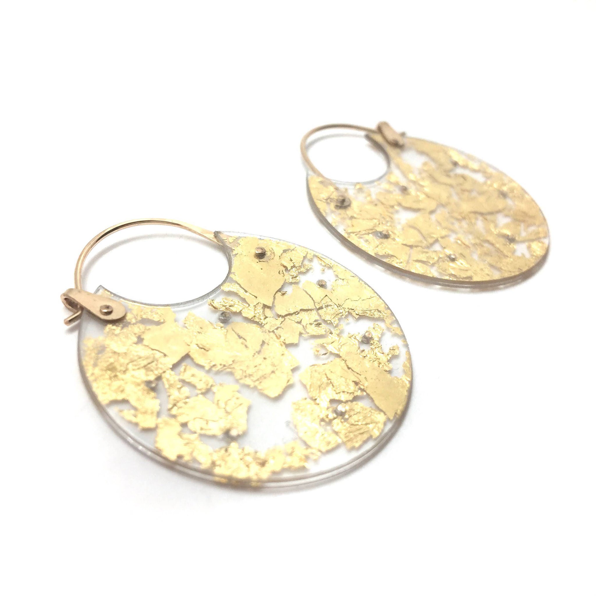 23k Gold leaf set in Polycarbonate with 14k gold fill ear hooks. Approximately 1/38" in width and 1.5" in height.