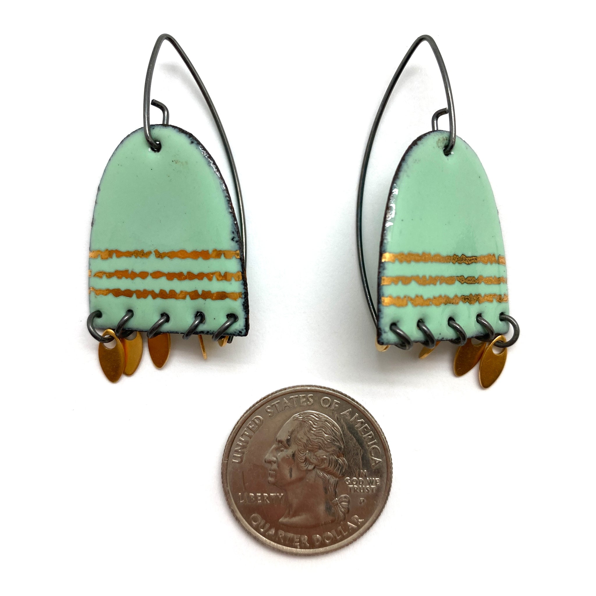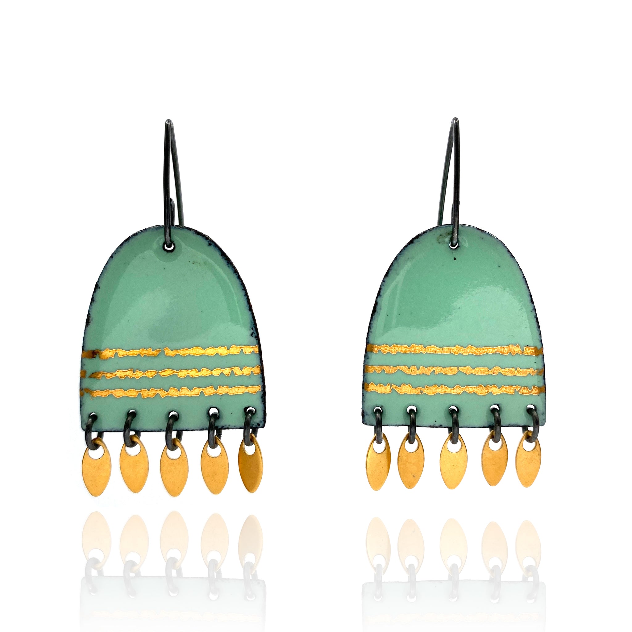 These enamel earrings by Jenne Rayburn have a fabulous fringe flow! This minty pair are suspended from elongated oxidized sterling silver hook backs and finished with gold drawings and dangling details.