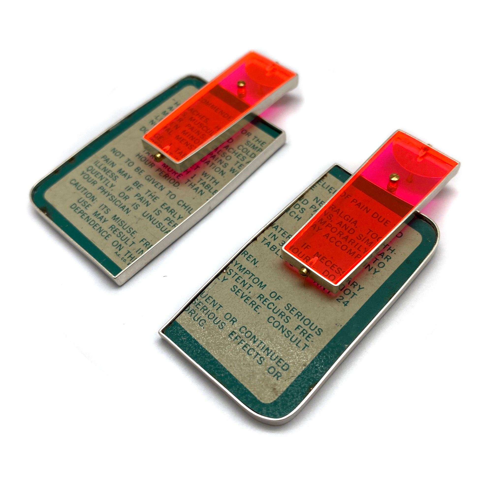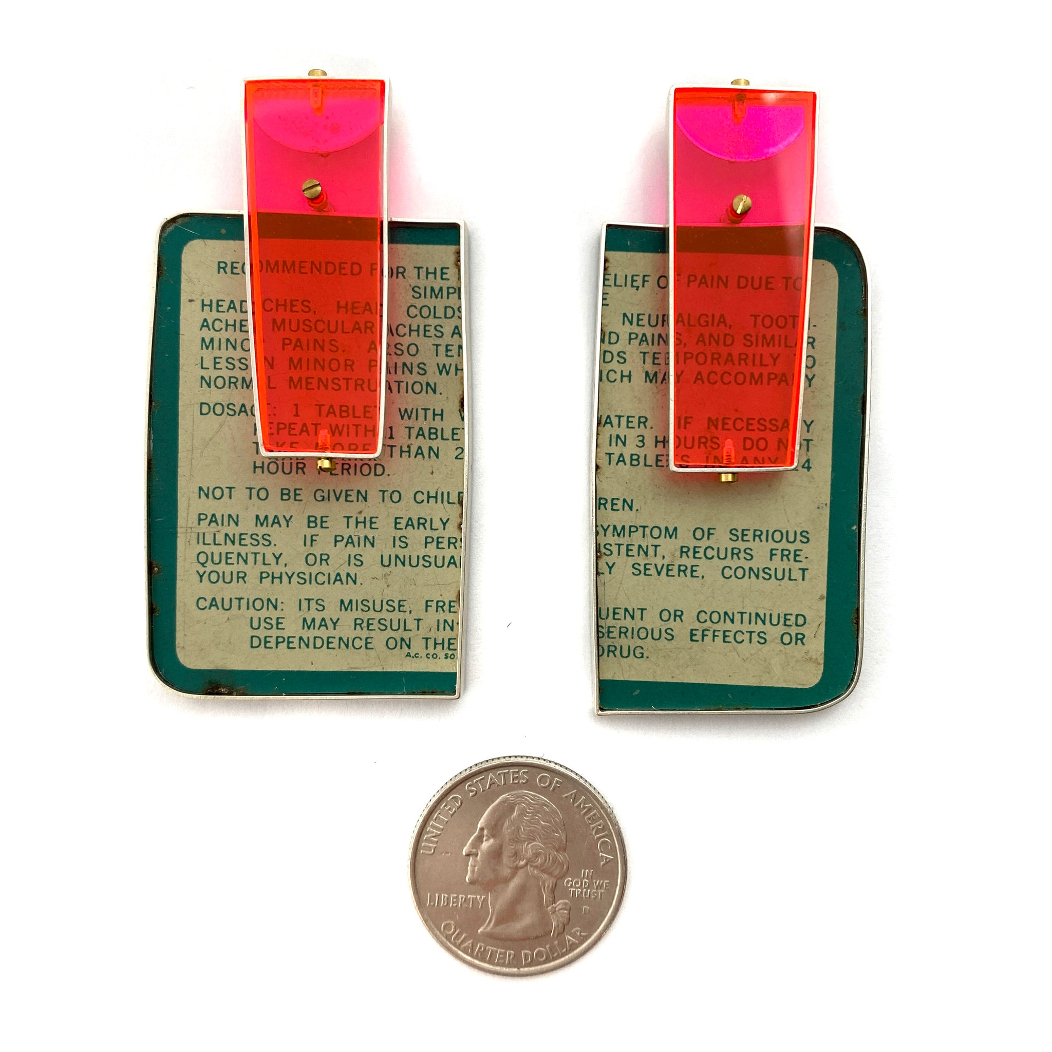 This one of a kind pair by Carin Jones are vintage, cheeky and chic. These geometric earrings are made with vintage Midol tins and accented with a hot pink acrylic strip for a pop of neon color.