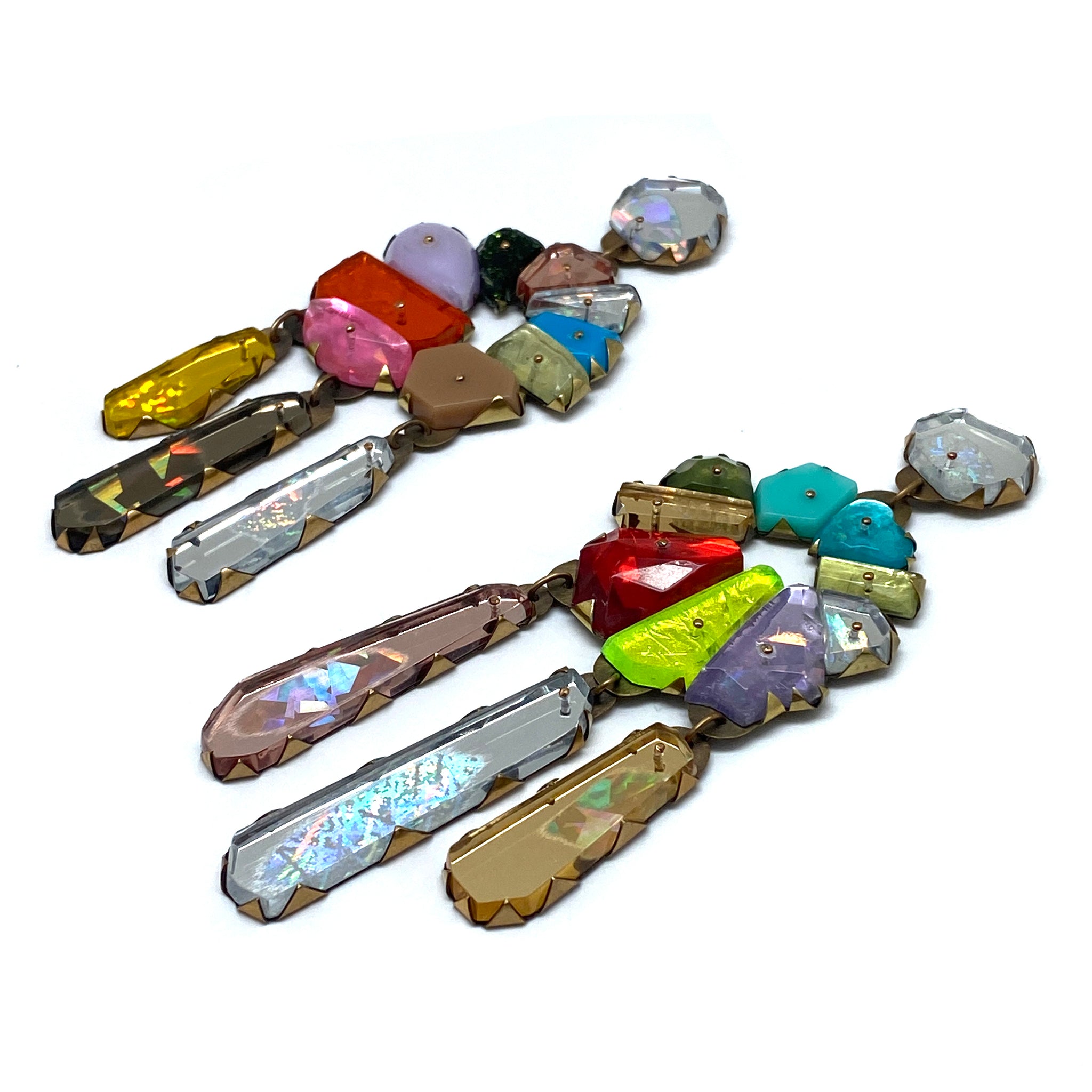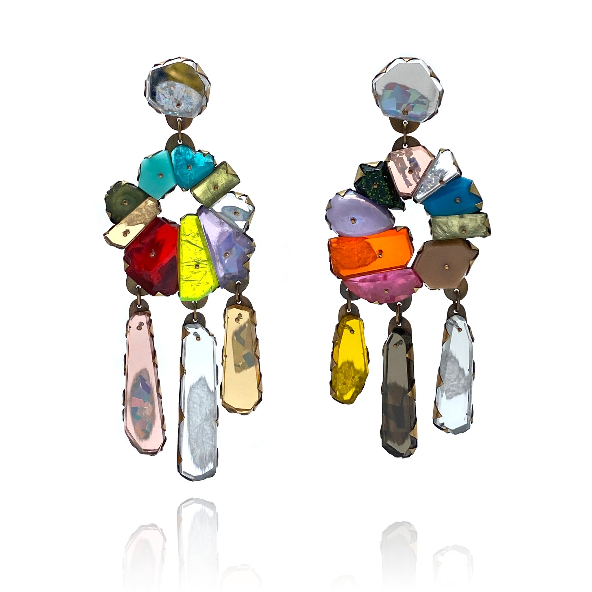 A lengthy pair of unapologetic statement earrings that are sure to catch the eye! Made with rainbow and iridescent acrylic, this pair are unforgettable.