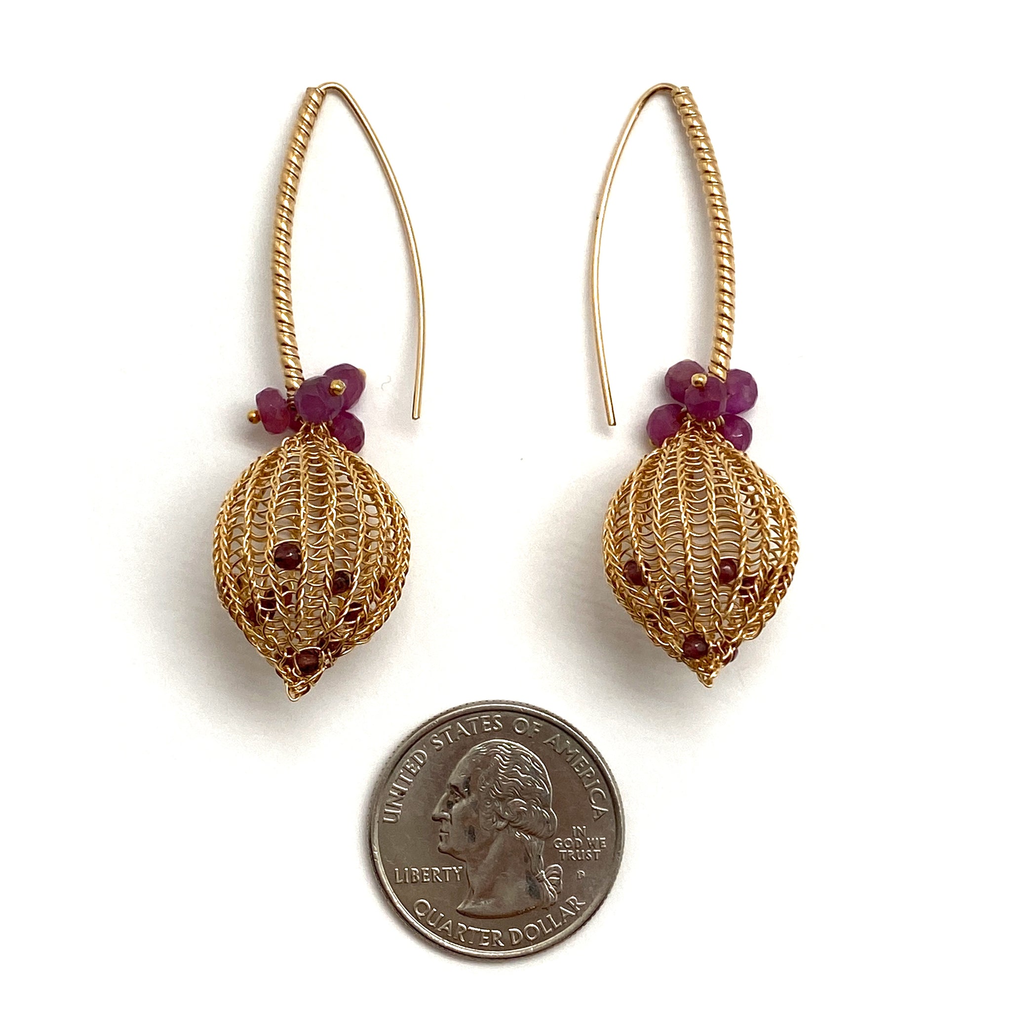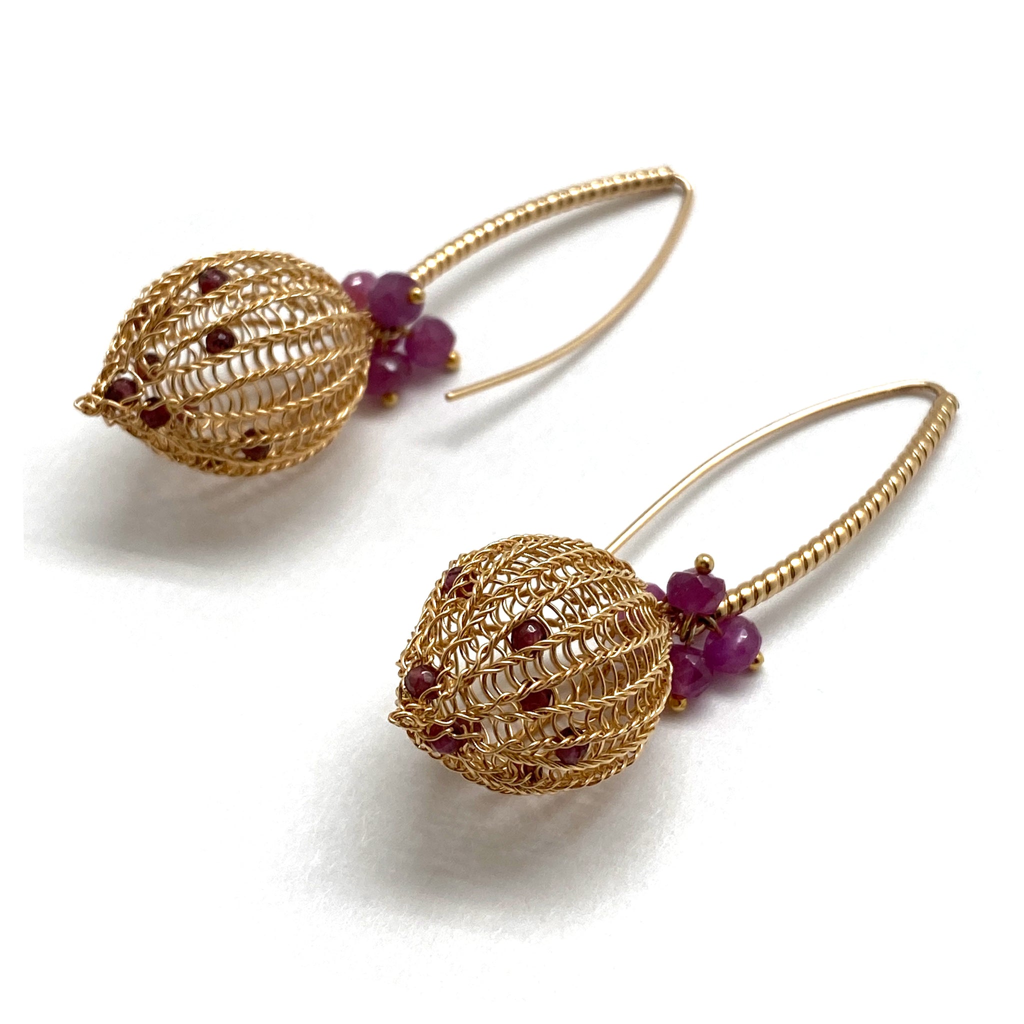 Hand crocheted by Sowon Joo, this radiant gold fill pair are accented with ruby and garnet beads. The hook backs are textured for an extra eye-catching detail.