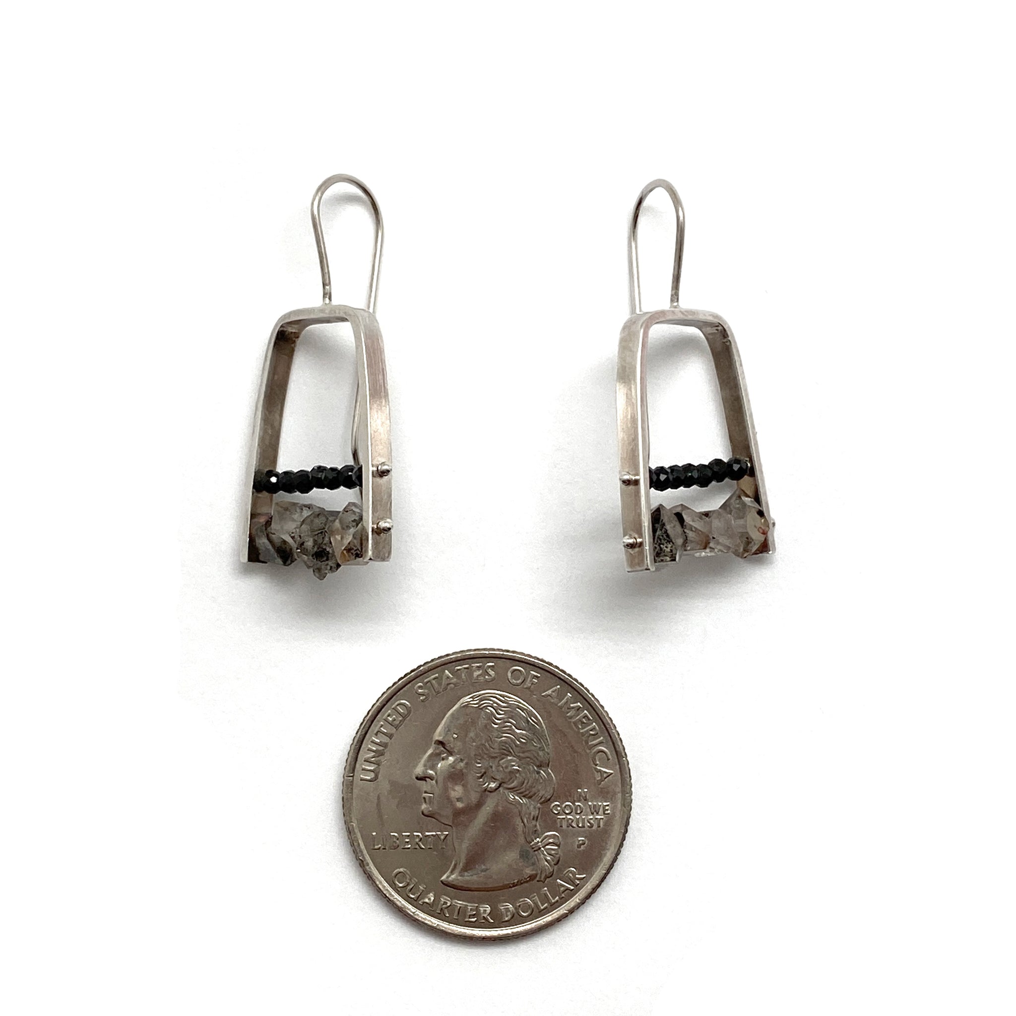 These earrings from Ashka Dymel feature two rows of spinels and herkimer diamonds. The contrast of the bright sterling silver and dark stones make this a pair that stand out.