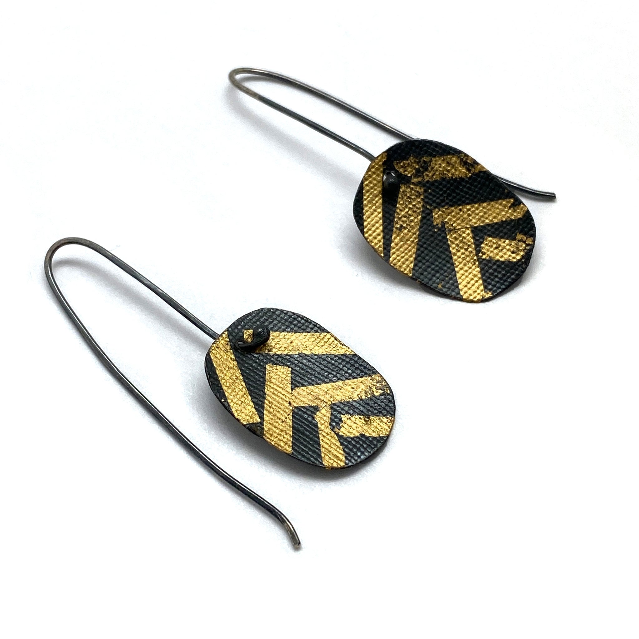 Suspended from long hook backs, this lightweight pair from Myung Urso are easy to wear. The 23k gold leaf are set in an abstract striped pattern for spirited statement.