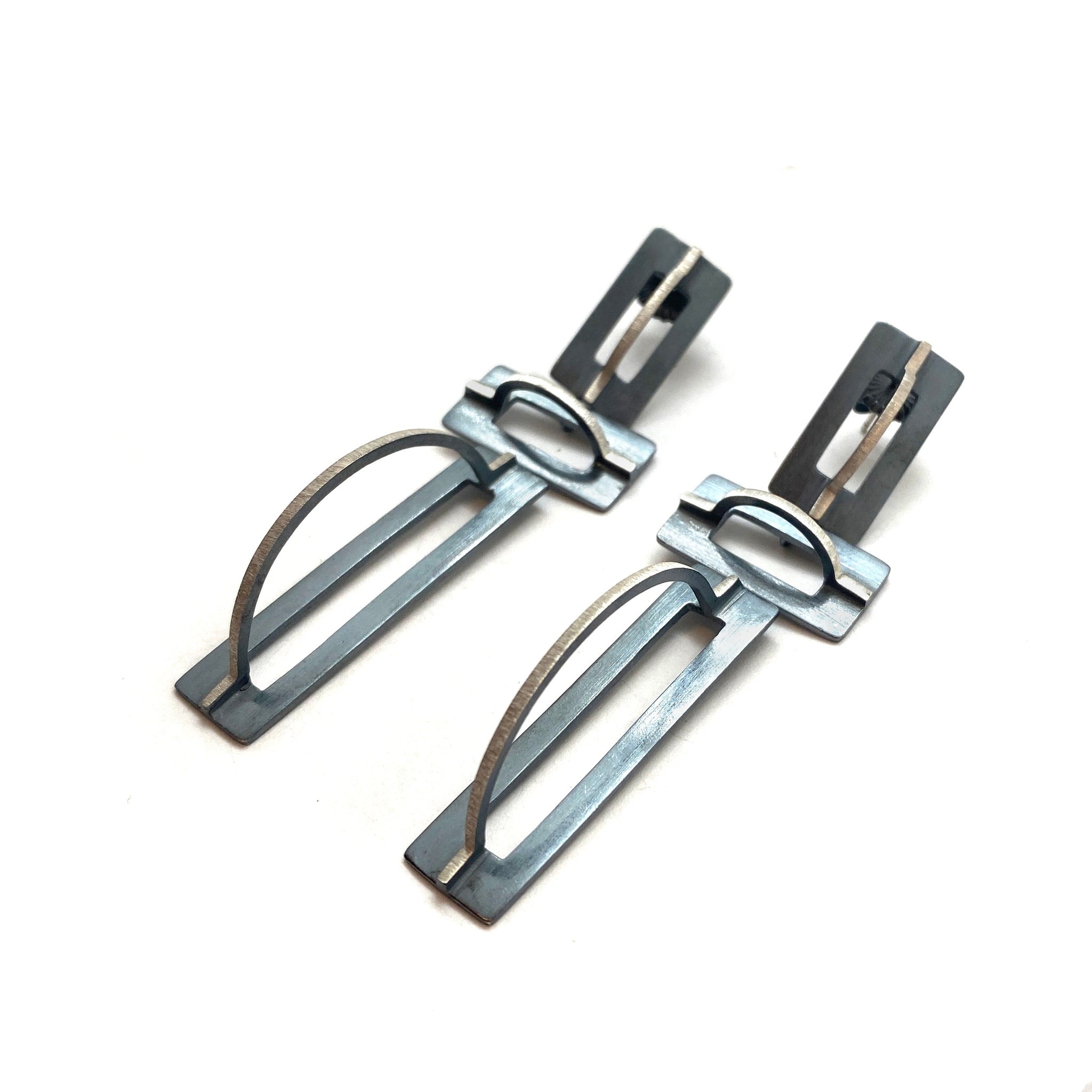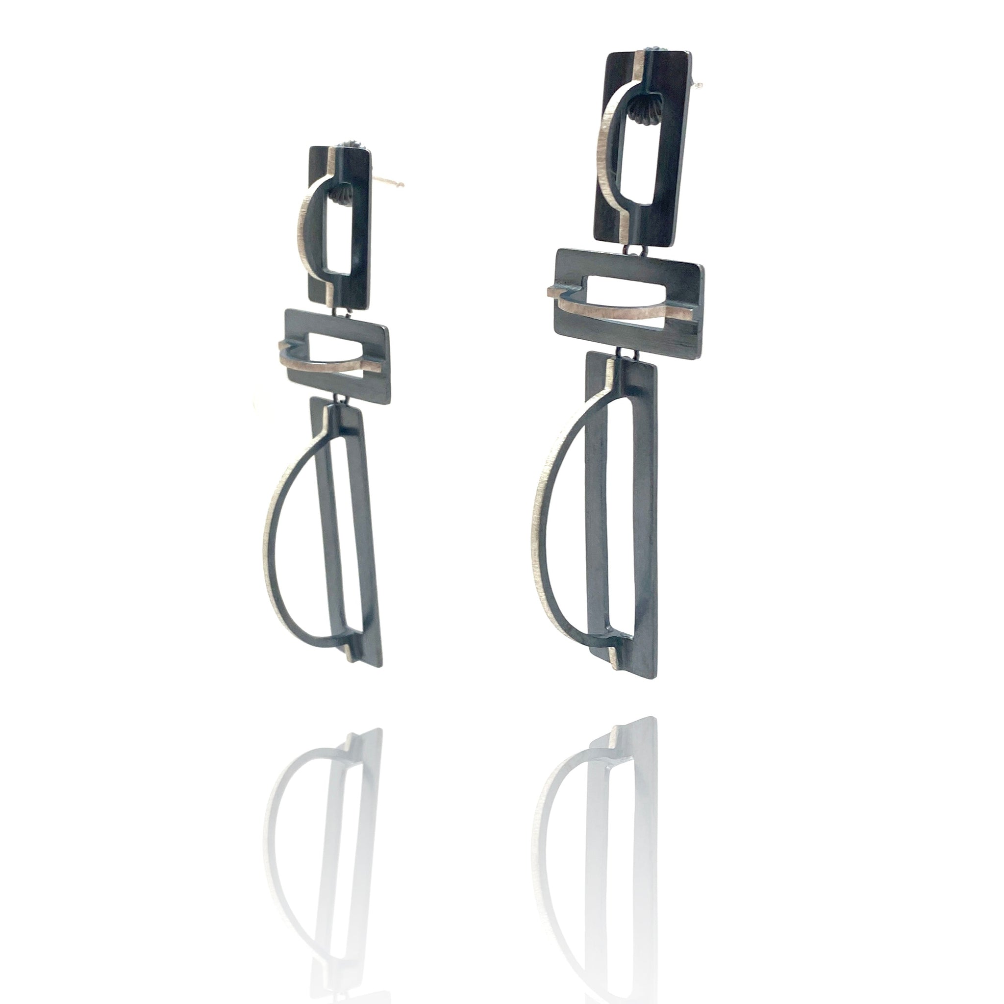 Heather Guidero's work is easily identified by her use of strong shapes and movement. A thin arch of metal sits high above strong rectangular frames which creates a completely different appearance of shape when it moves and turns.