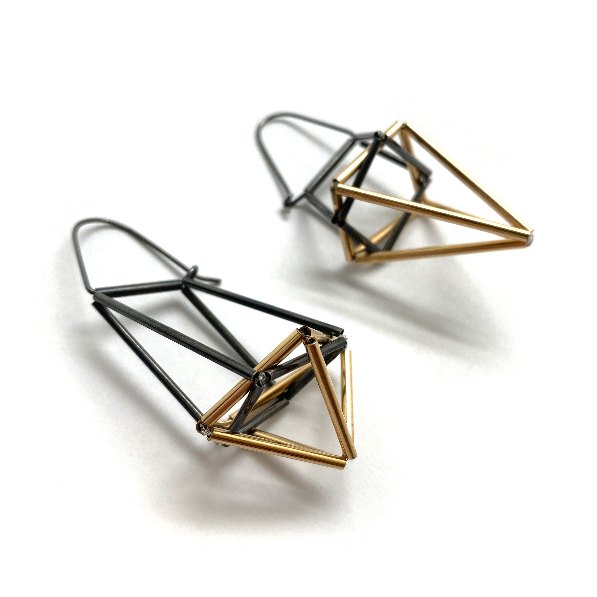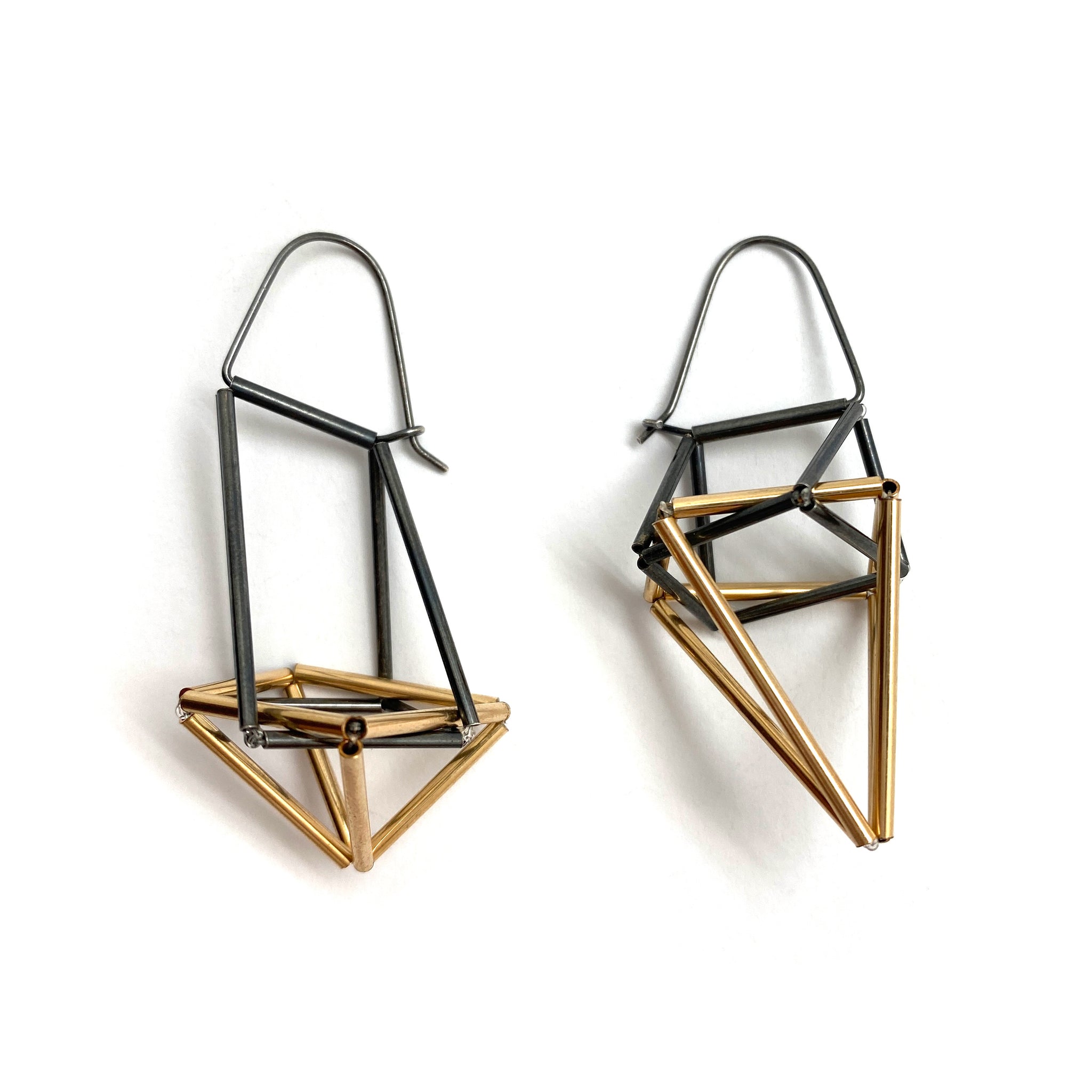 These asymmetrical earrings from Emilie Pritchard feature her signature, sculptural polyhedrons. They are a great statement that can be easily dressed up or down.