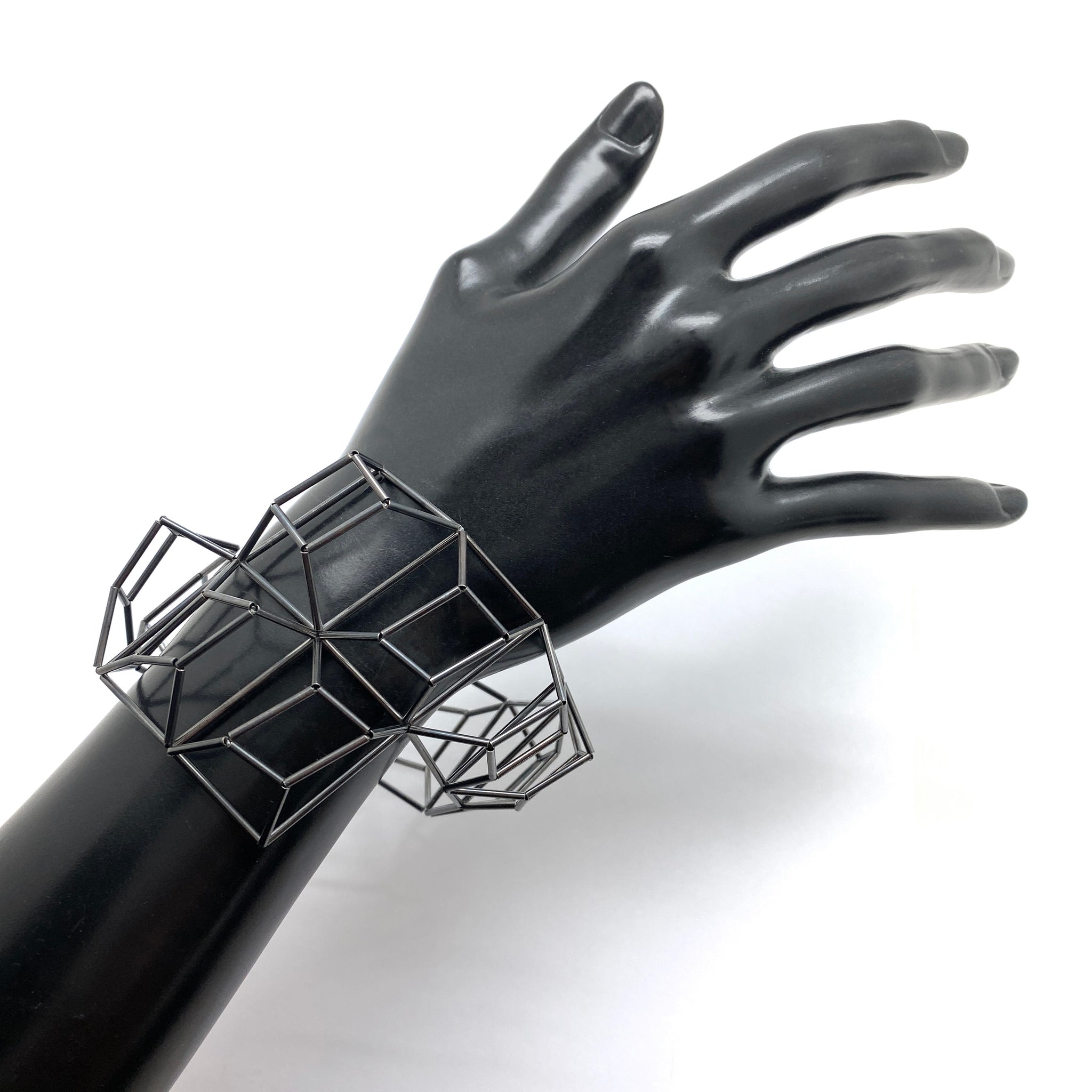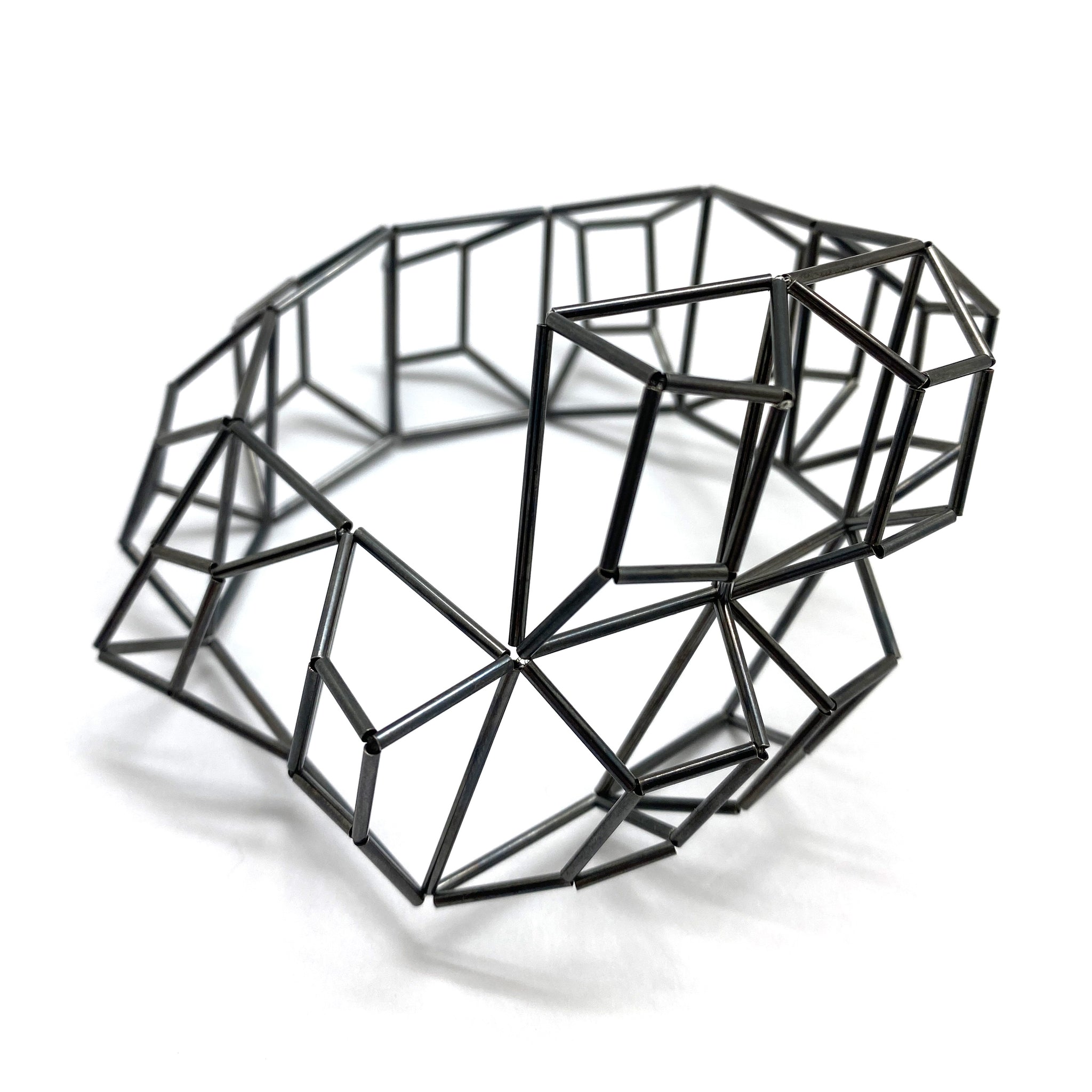 This architectural statement from Emilie Pritchard is unlike anything in your collection. Made with oxidized sterling silver tubing, this sculptural piece is light as air.