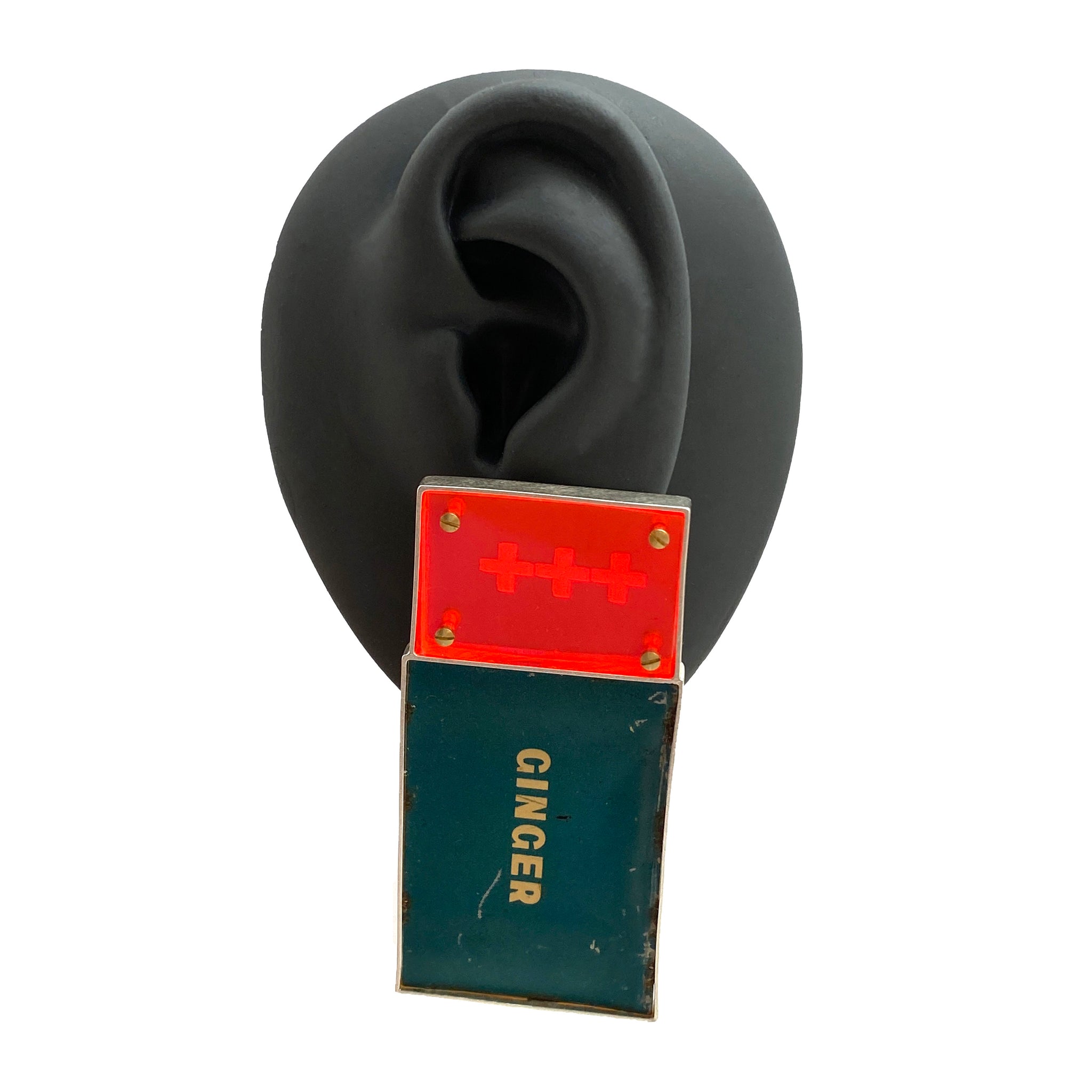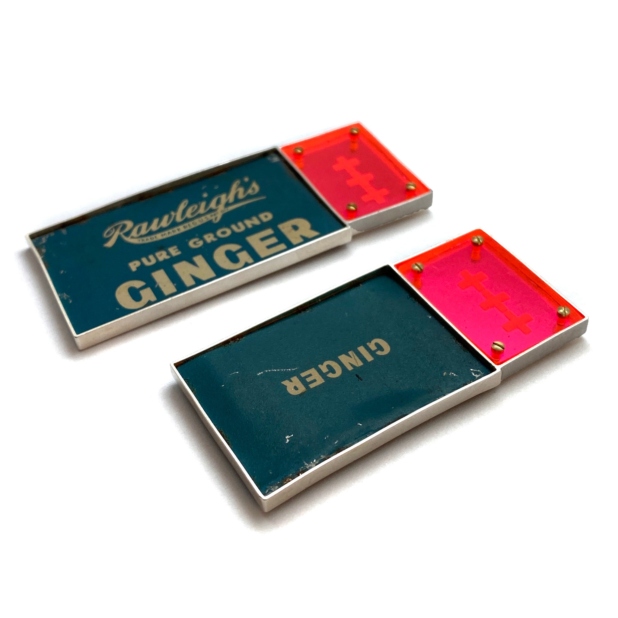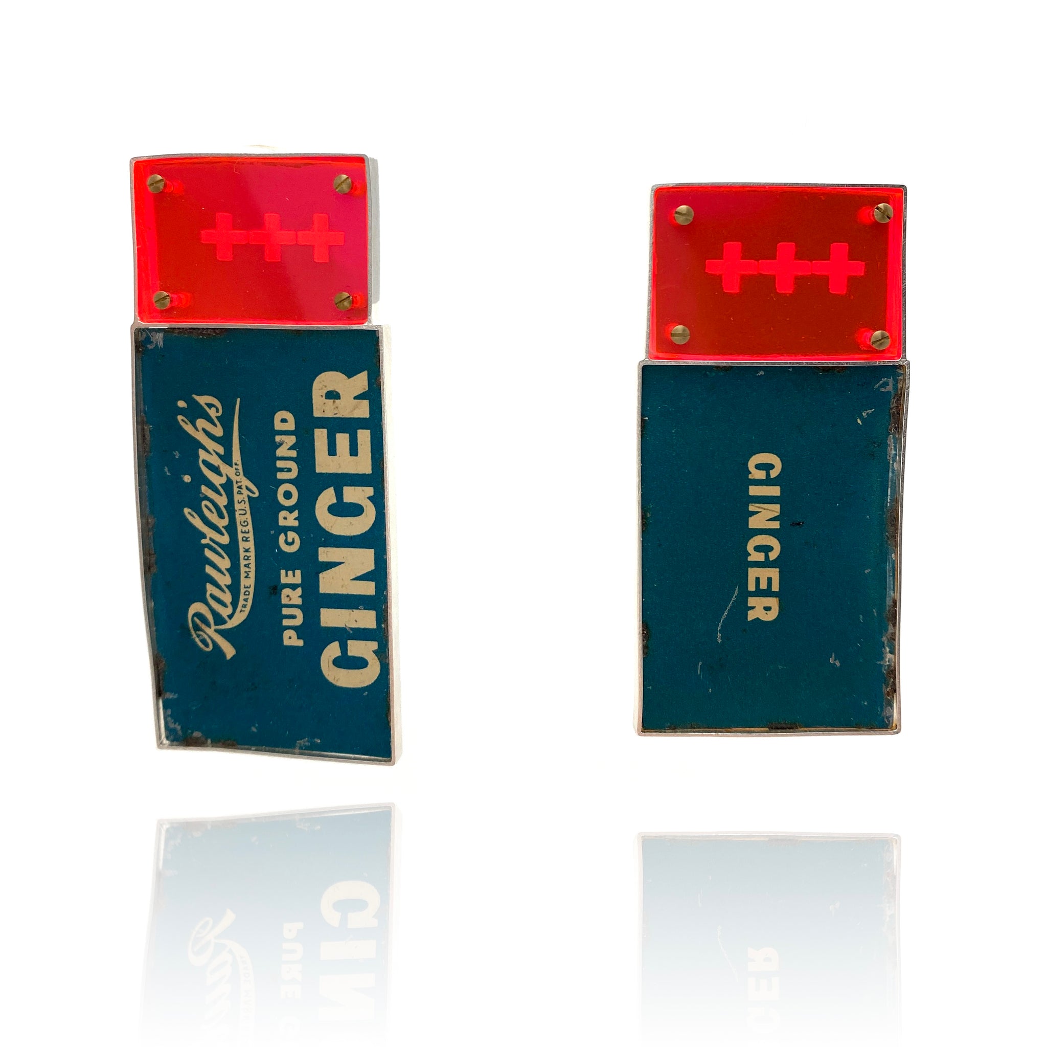 Made with laser etched acrylic and vintage tins, this one of a kind pair are as sweet as ginger! The bold combination of materials and text result in wearable piece of contemporary art jewelry.