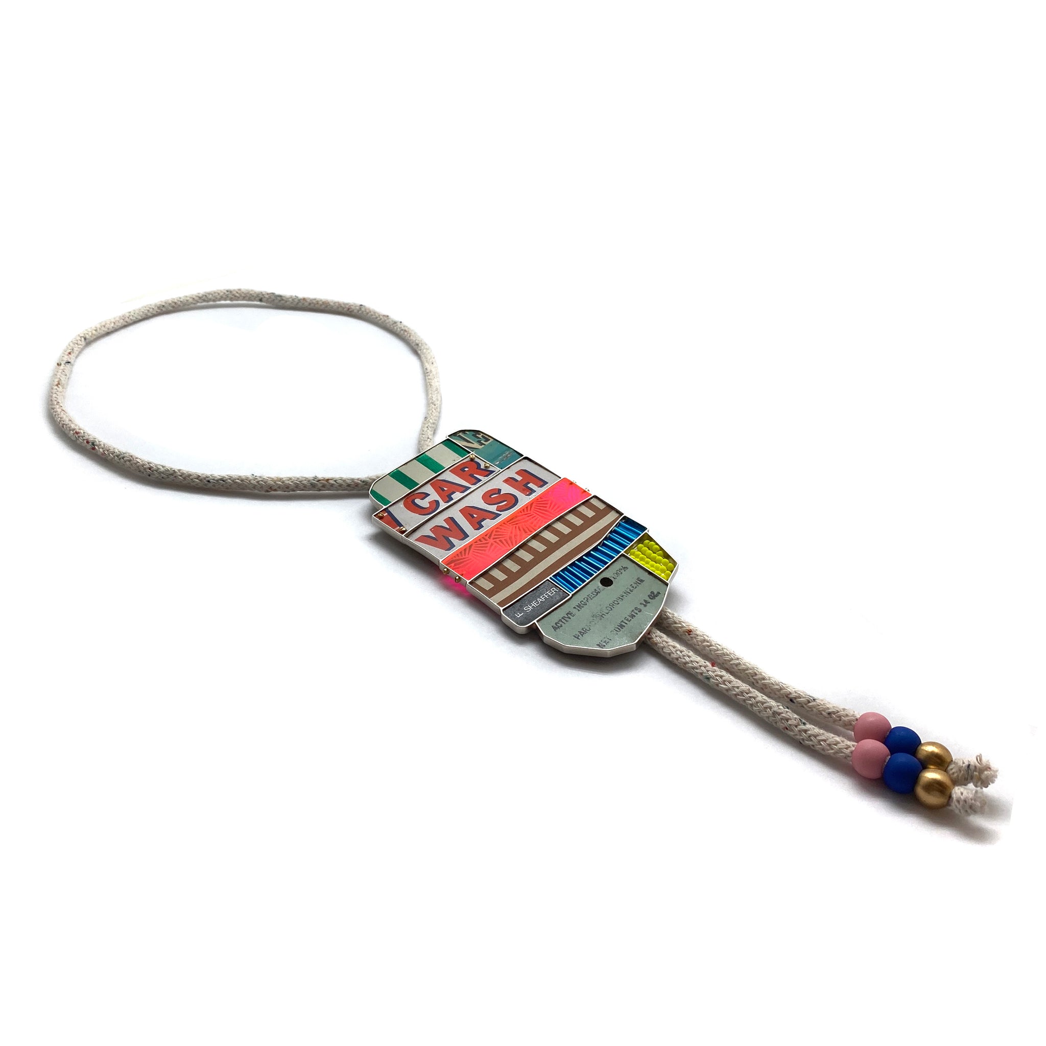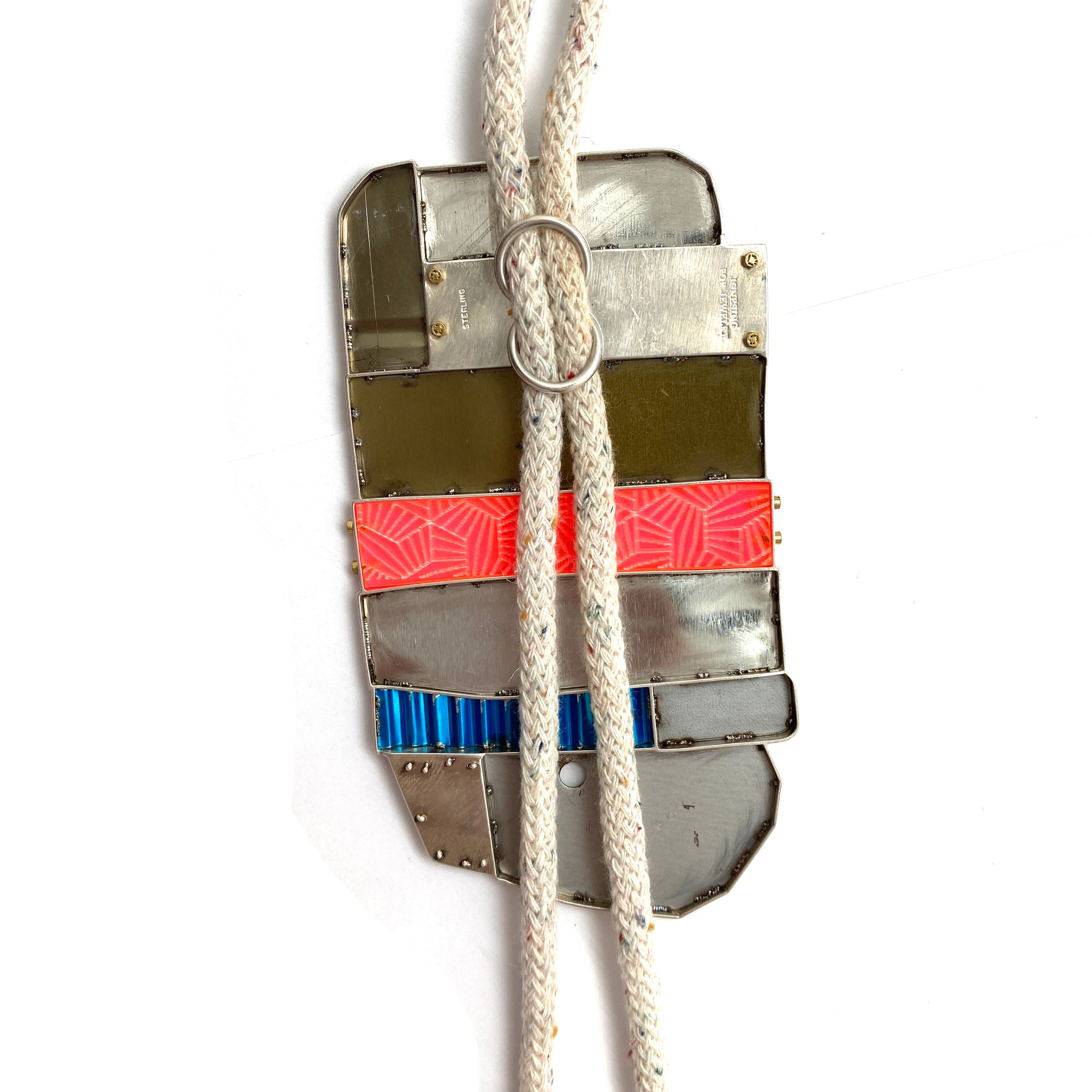Carin Jones' new body of work is bold and bright - with bolo ties! This comfortable, one of a kind piece feature a large wearable collage of graphic vintage tins, etched acrylic and colorful beads.