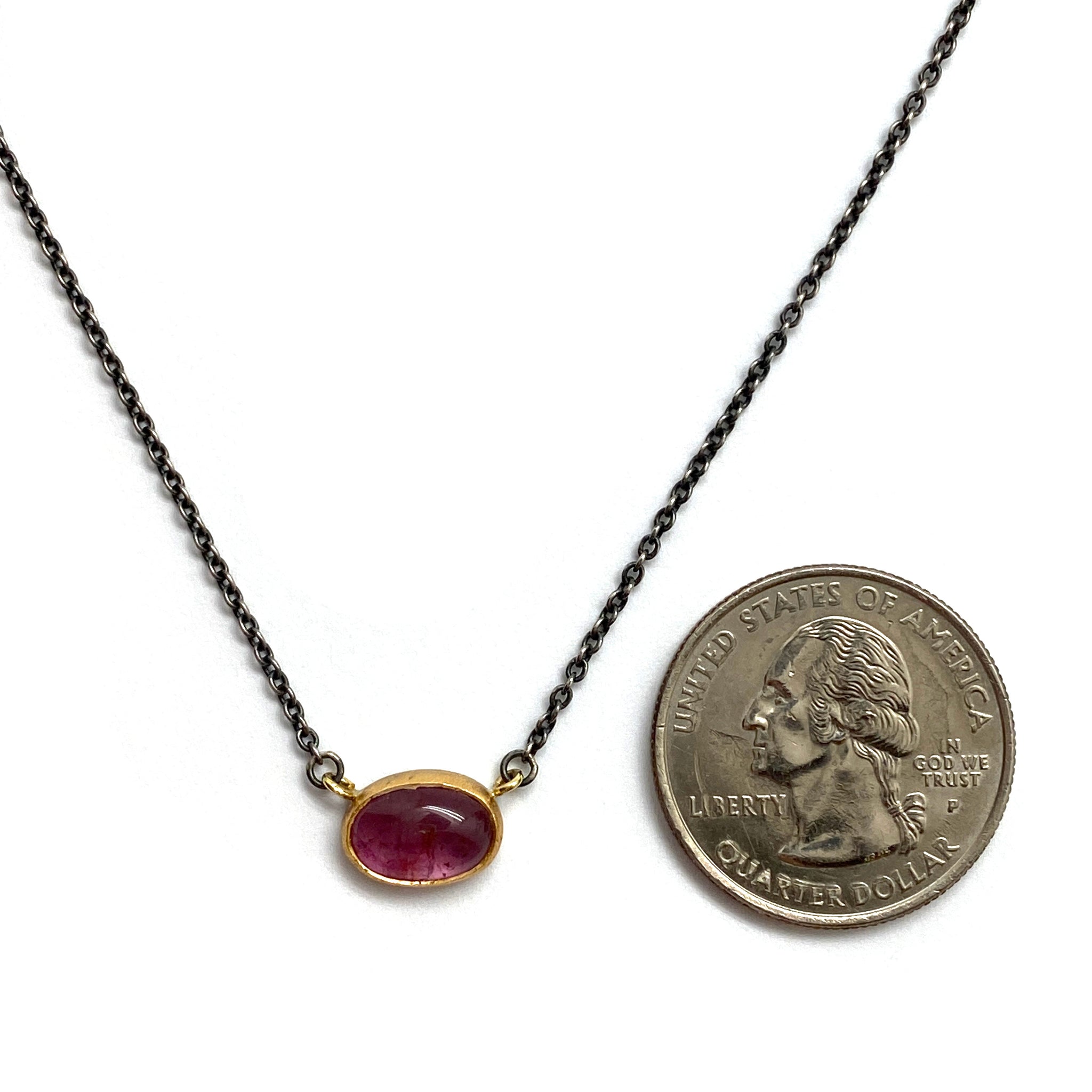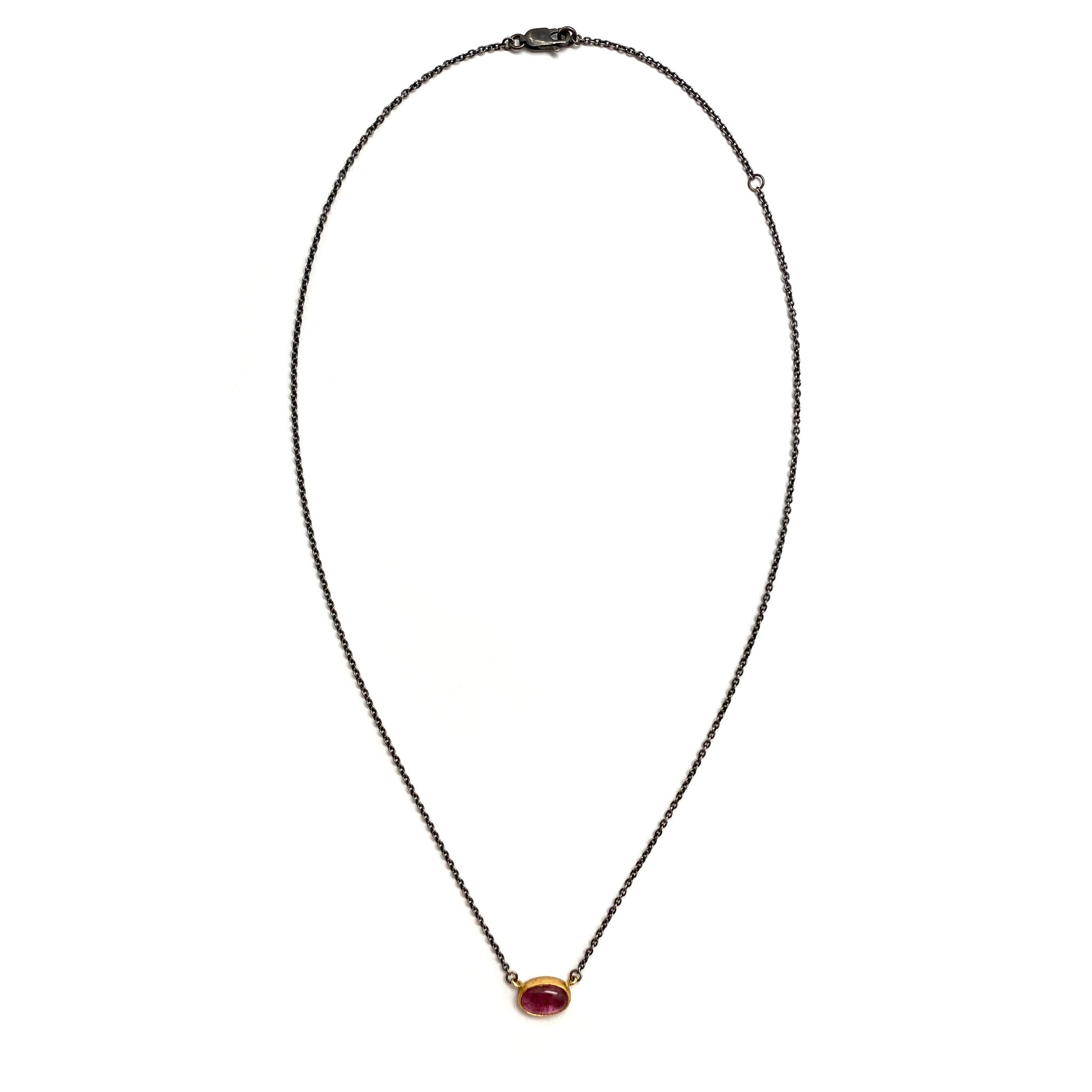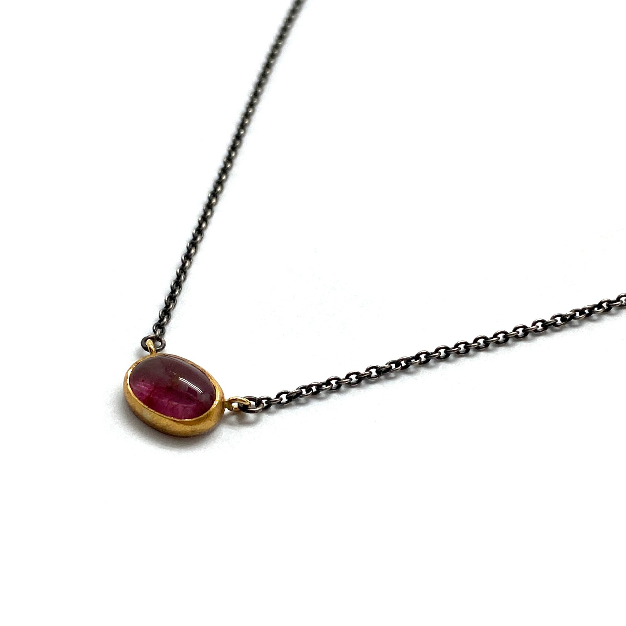 A stunning pink tourmaline is set in 22k gold to create this lovely pendant. On an oxidized sterling silver chain, this necklace can easily be dressed up or down.