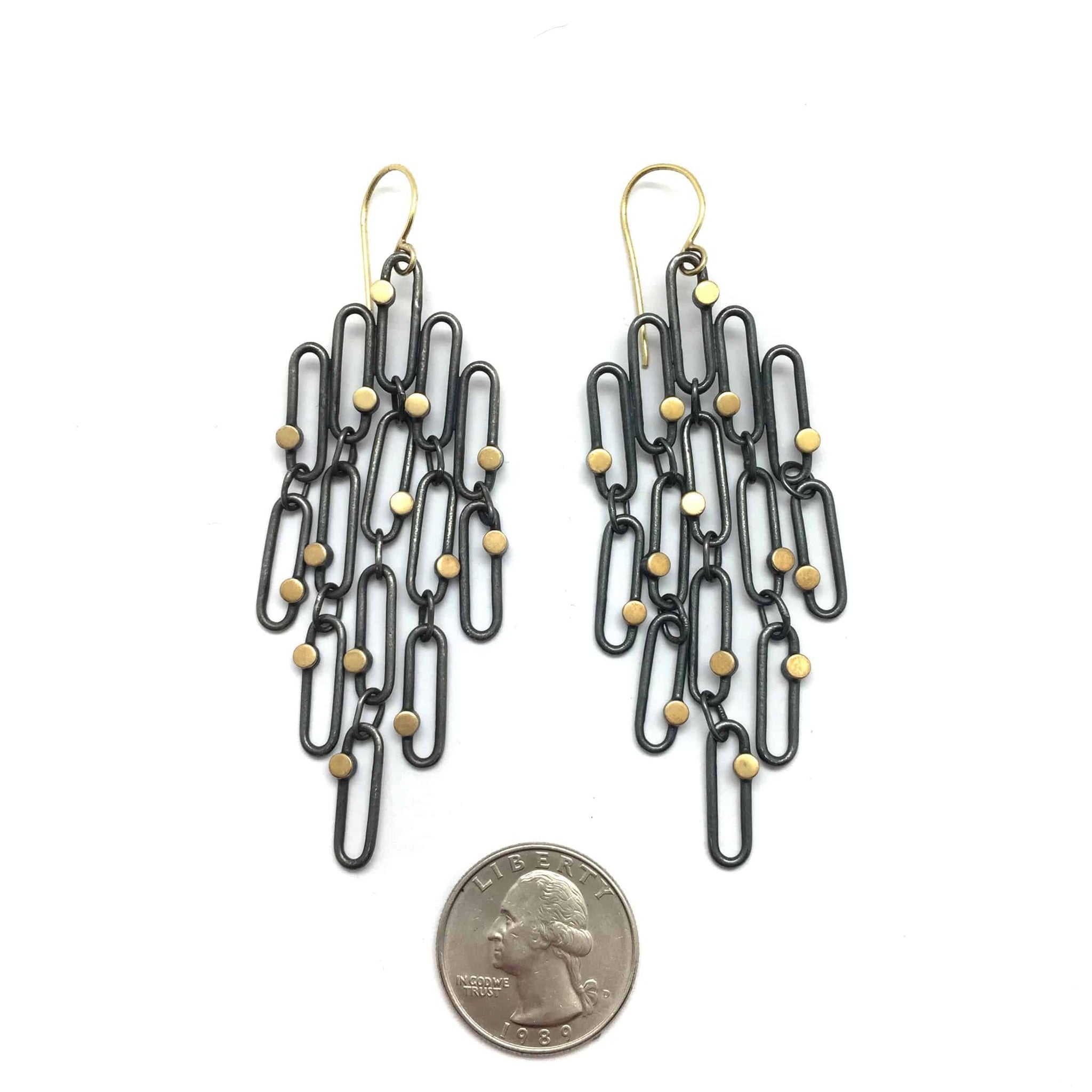 Heather Guidero's dramatic chandelier earrings have an easy flow and movement with her elevated alternative take on chain mail. These earrings feature layered oxidized sterling silver and 22k gold circle links 18k yellow gold ear hooks.