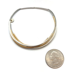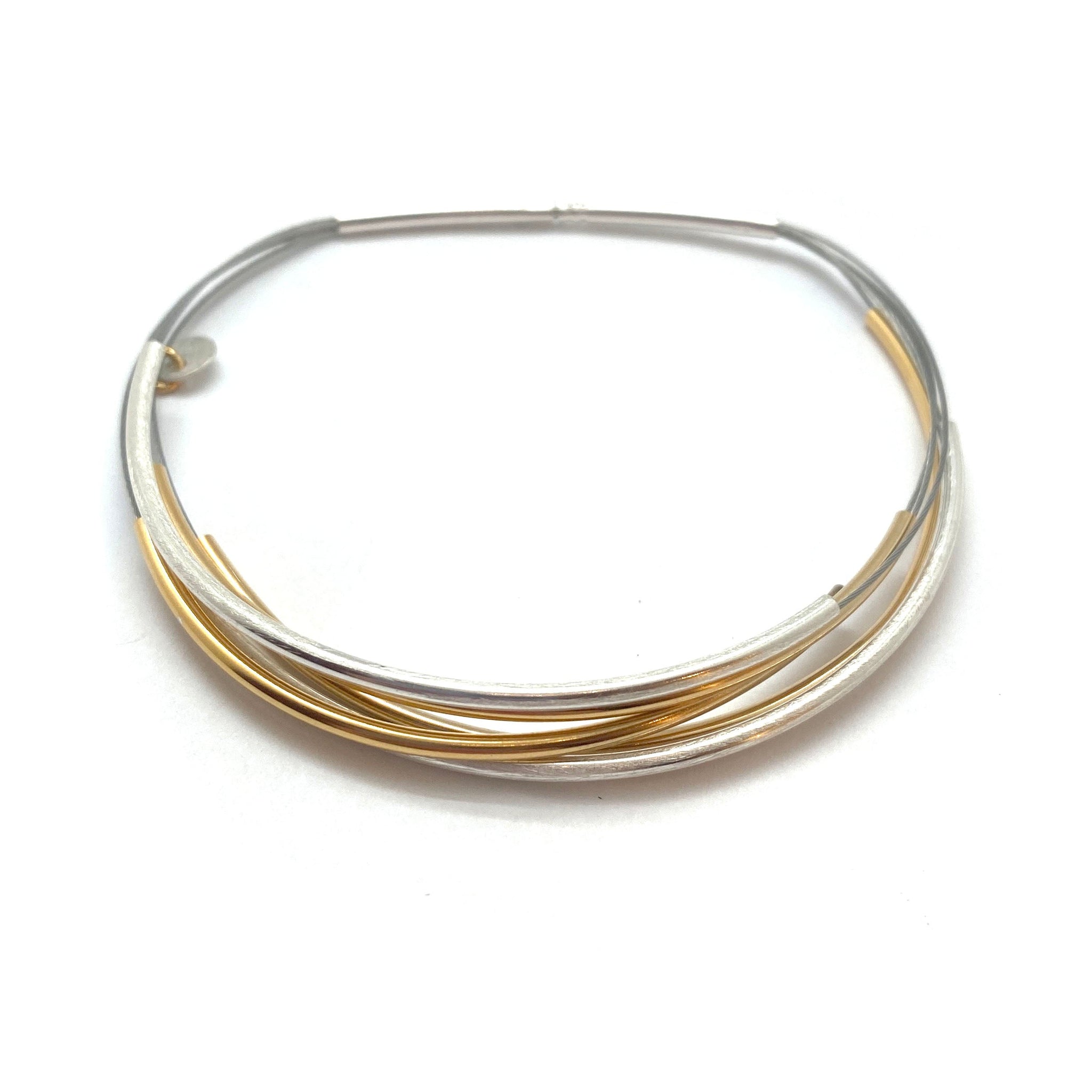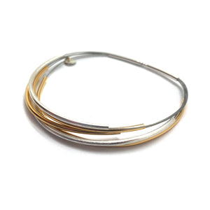 Curved gold vermeil and sterling silver bangle. Easy on and off closure, just push the bar into the tubing.