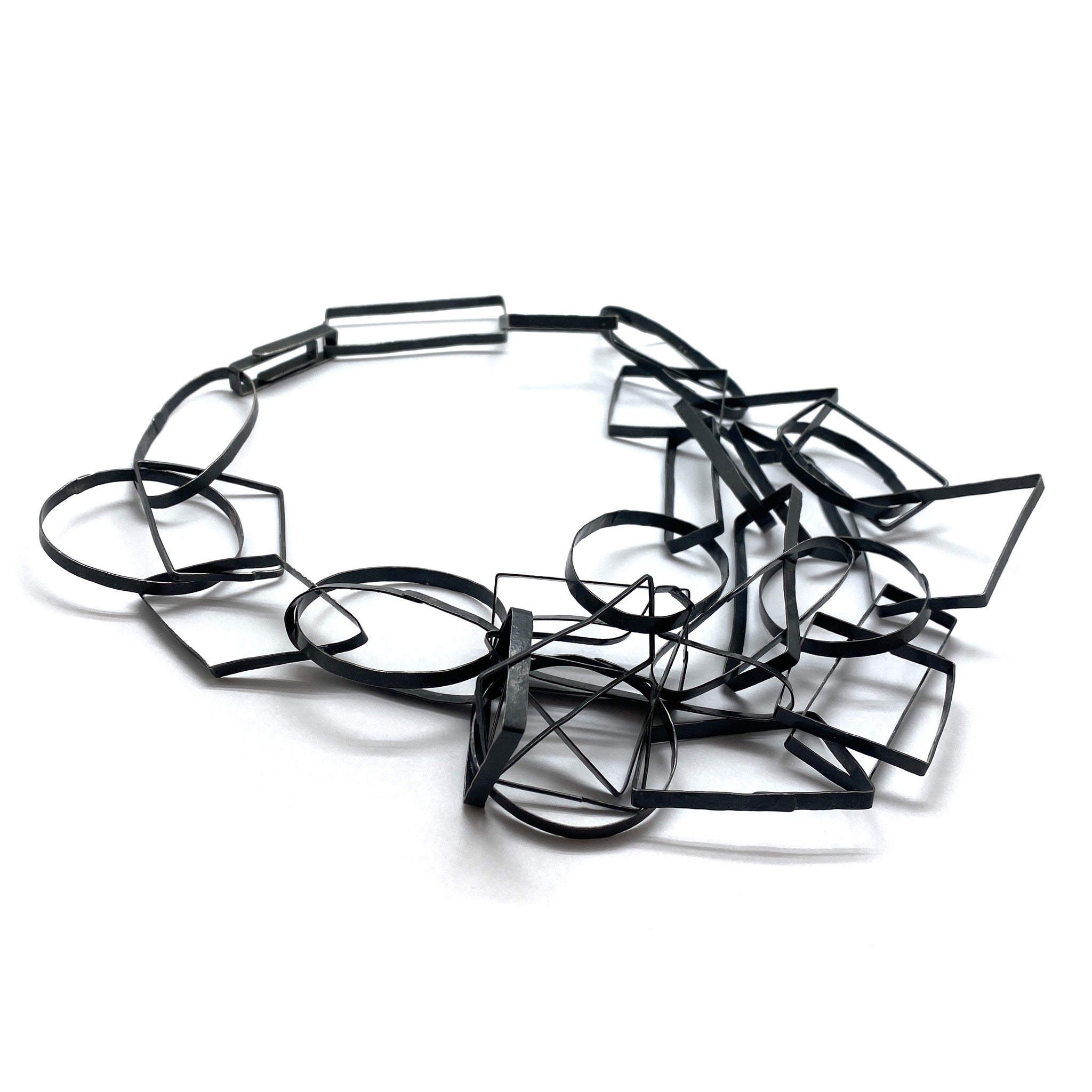 This geometric bundle necklace is made with Biba Schutz's signature mix of contrast, texture and form. The interconnected shapes pop in a dark, oxidized sterling silver.