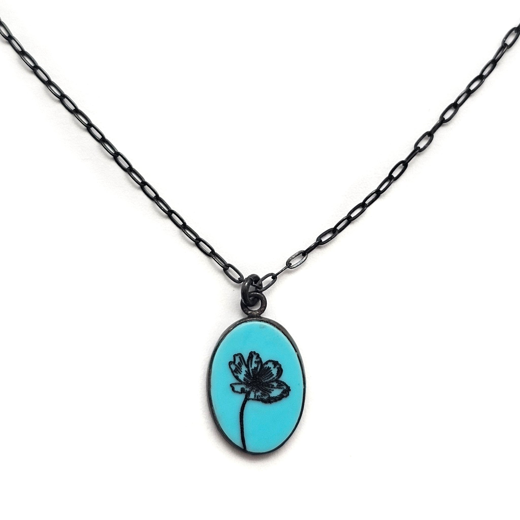Made with turquoise and suspended from an oxidized sterling silver chain, this pendant is the perfect pop of color to add to your necklace stack. Featuring an etching of a flower, wear this fabulous fossil-inspired necklace every day.
