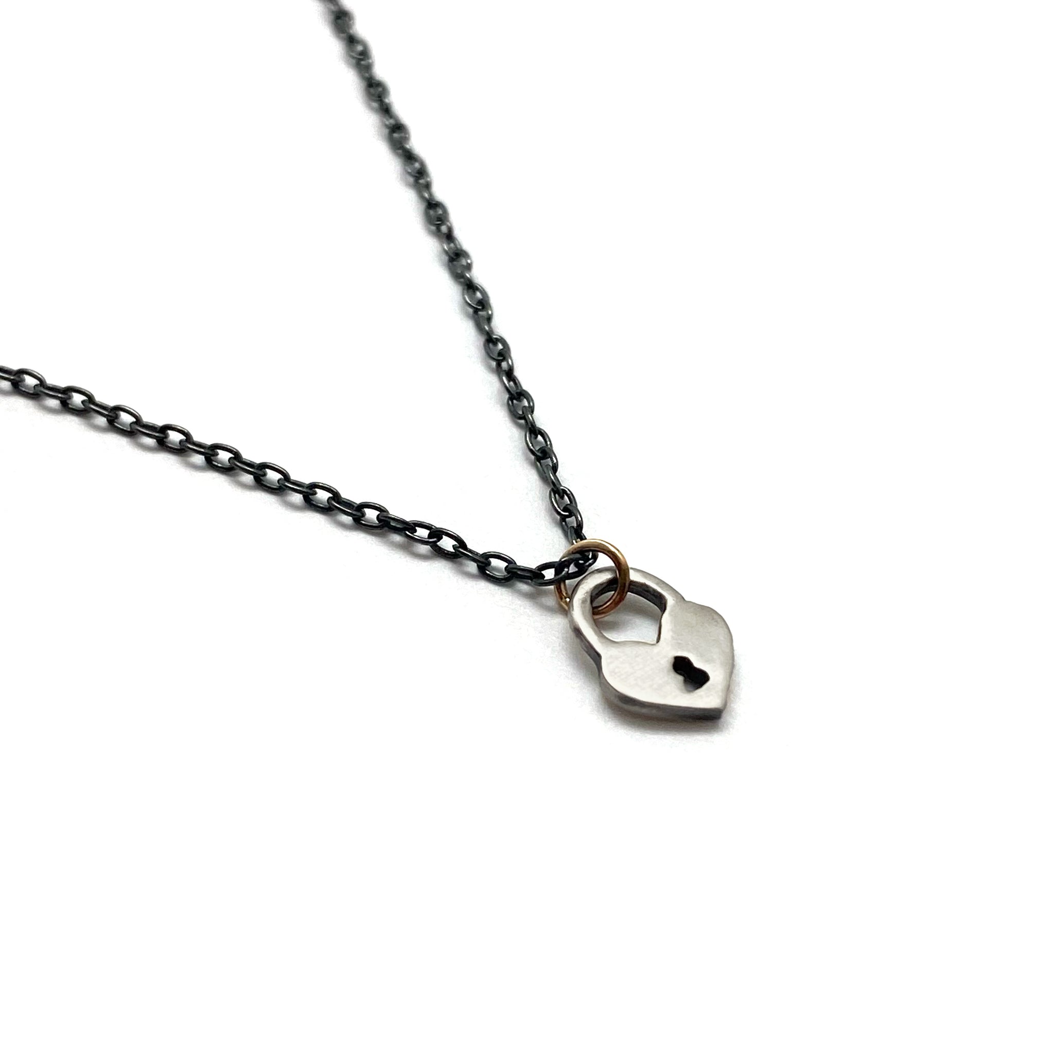 This petite sterling silver pendant is a sweet staple necklace. The silver heart-shaped lock is suspended from a 14k gold jump ring on an oxidized chain, making this lovely necklace a great gift for the jewelry lover of any age.
