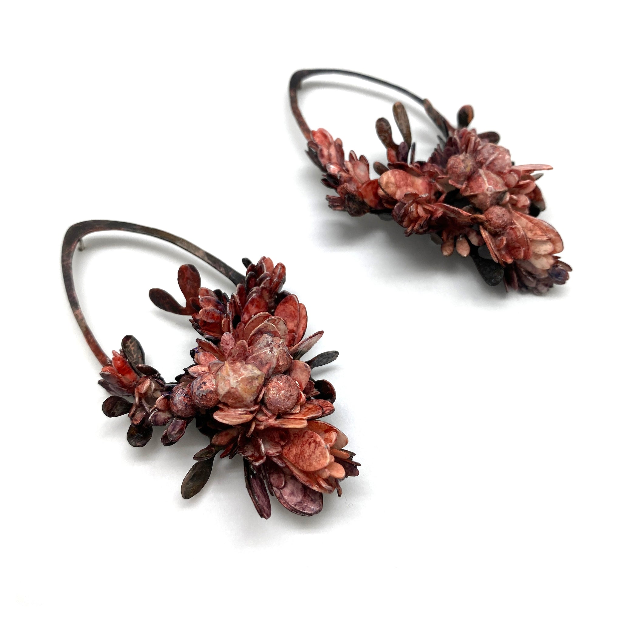 A gallery favorite, these sculptural pink earrings from Hanna Liljenberg are a must have. Made with seed cases preserved in paint, paper and lacquer and cradled by brass cut outs, this pair are your next go to statement.