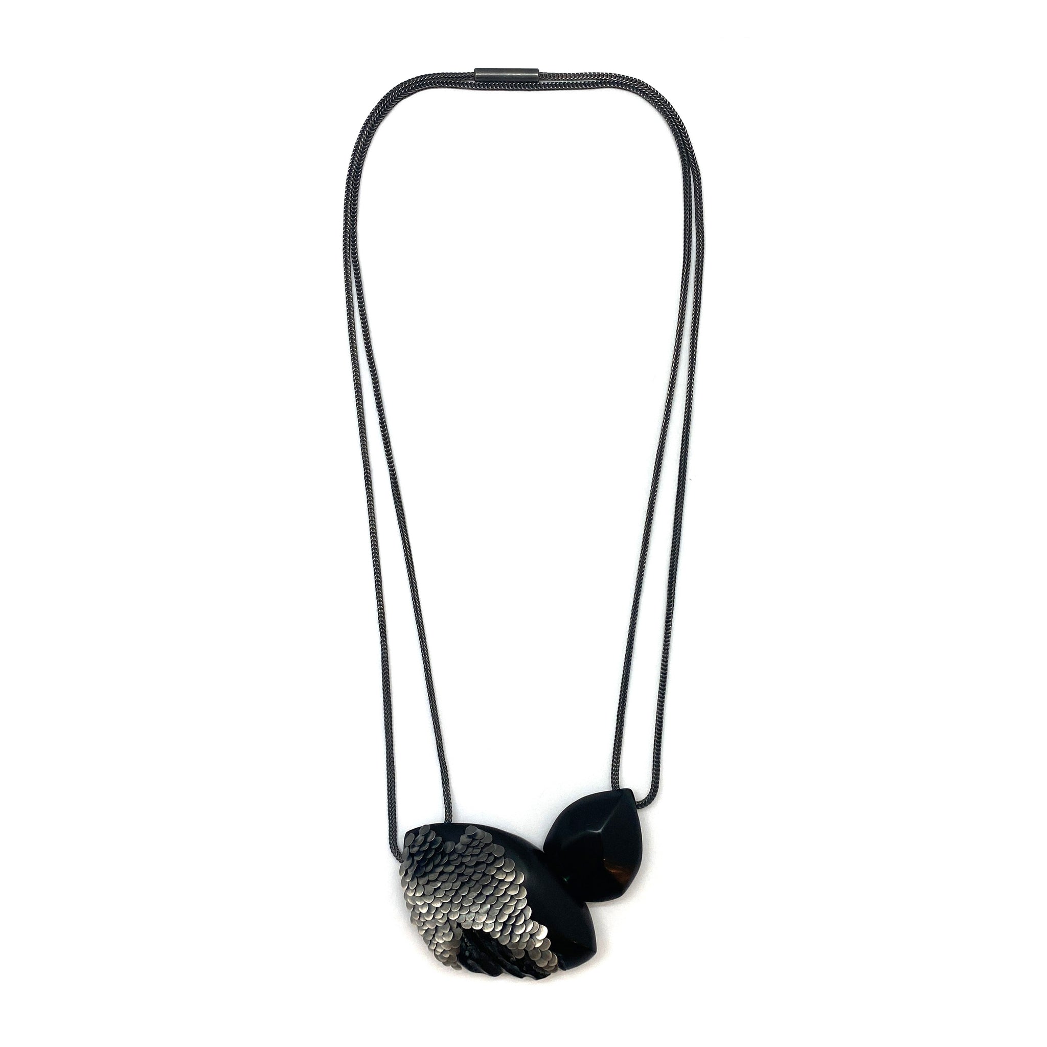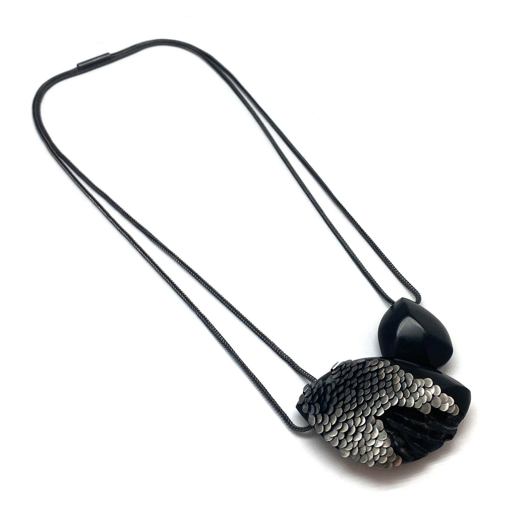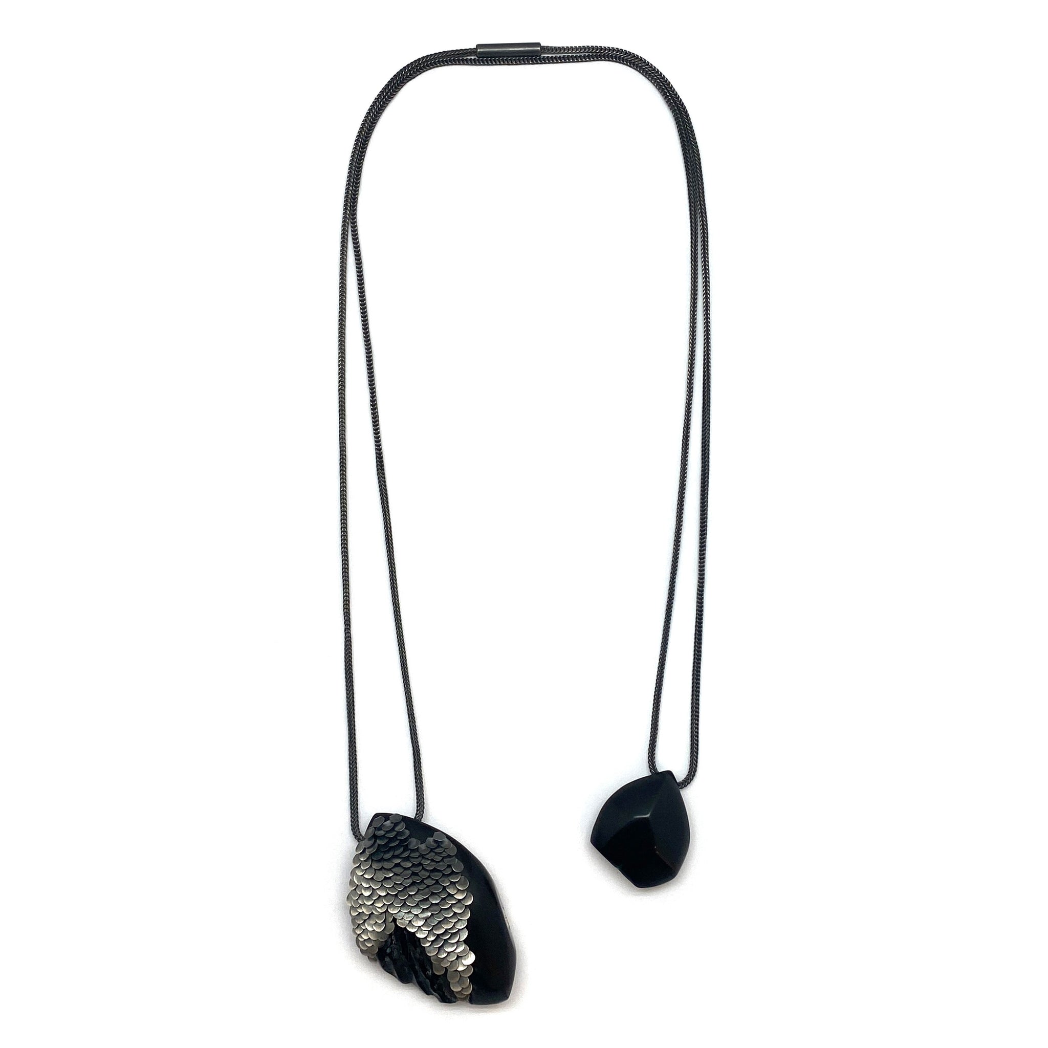Featuring hand carved acrylic adorned with sterling silver scales, this is smaller sized Murmur necklace by Emmeline Hastings. The two pendant pieces connect with a magnet, making the necklace easy to put on and take off.