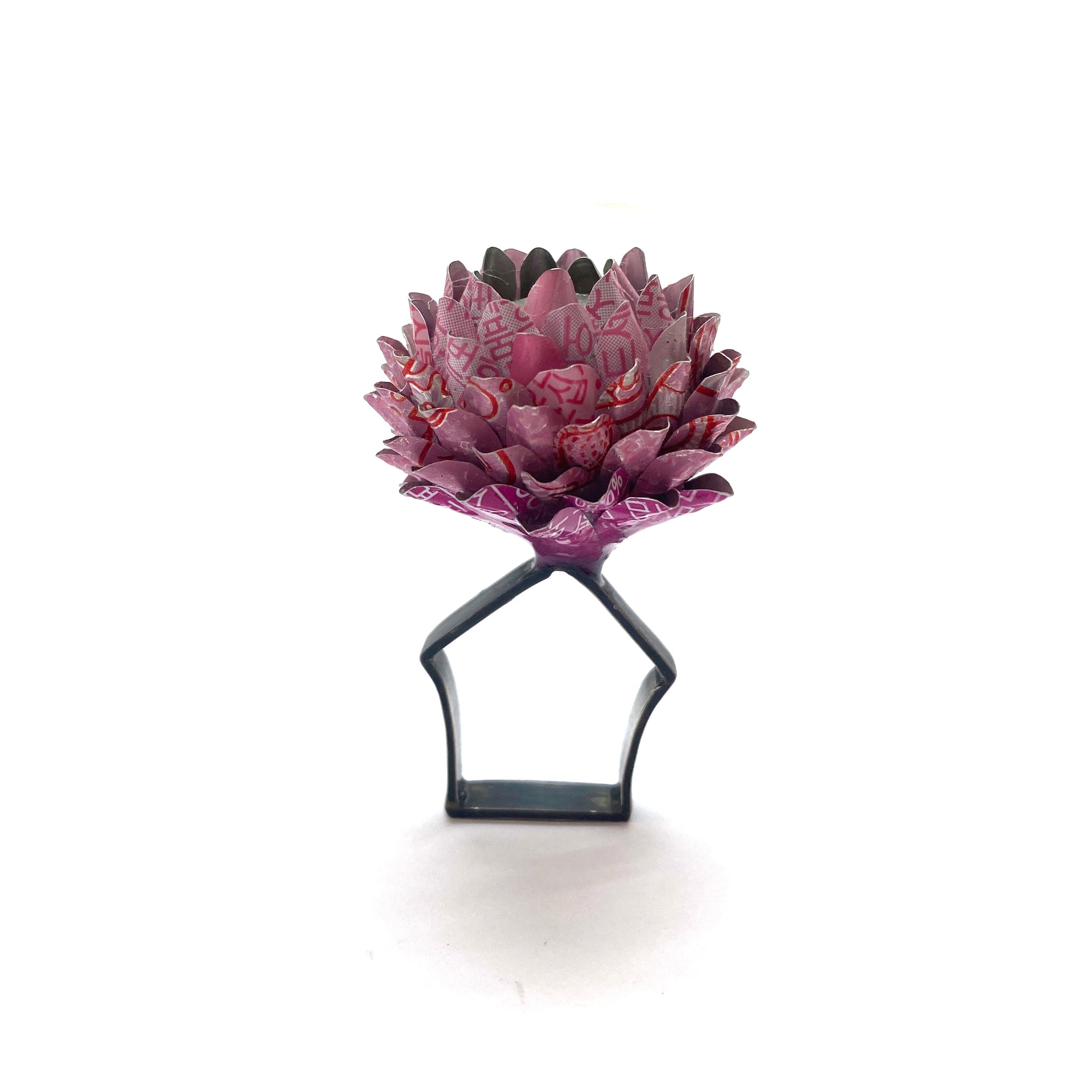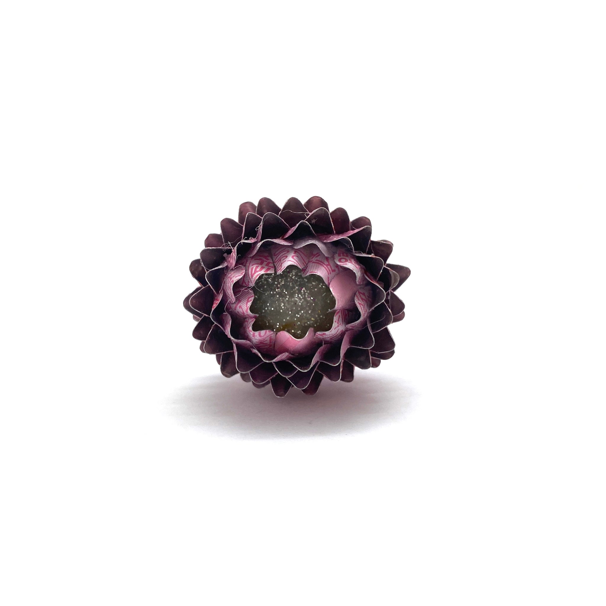 Wear a small sculpture with this one of a kind ring by Eunseok Han. Made with recycled aluminum on a comfortable sterling silver band, this pretty pink statement features a glittery silver resin center.