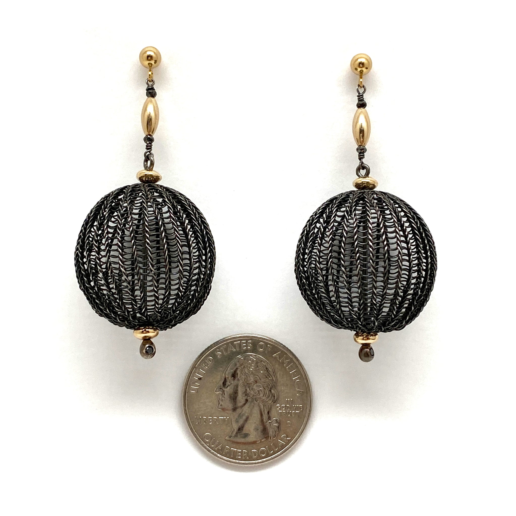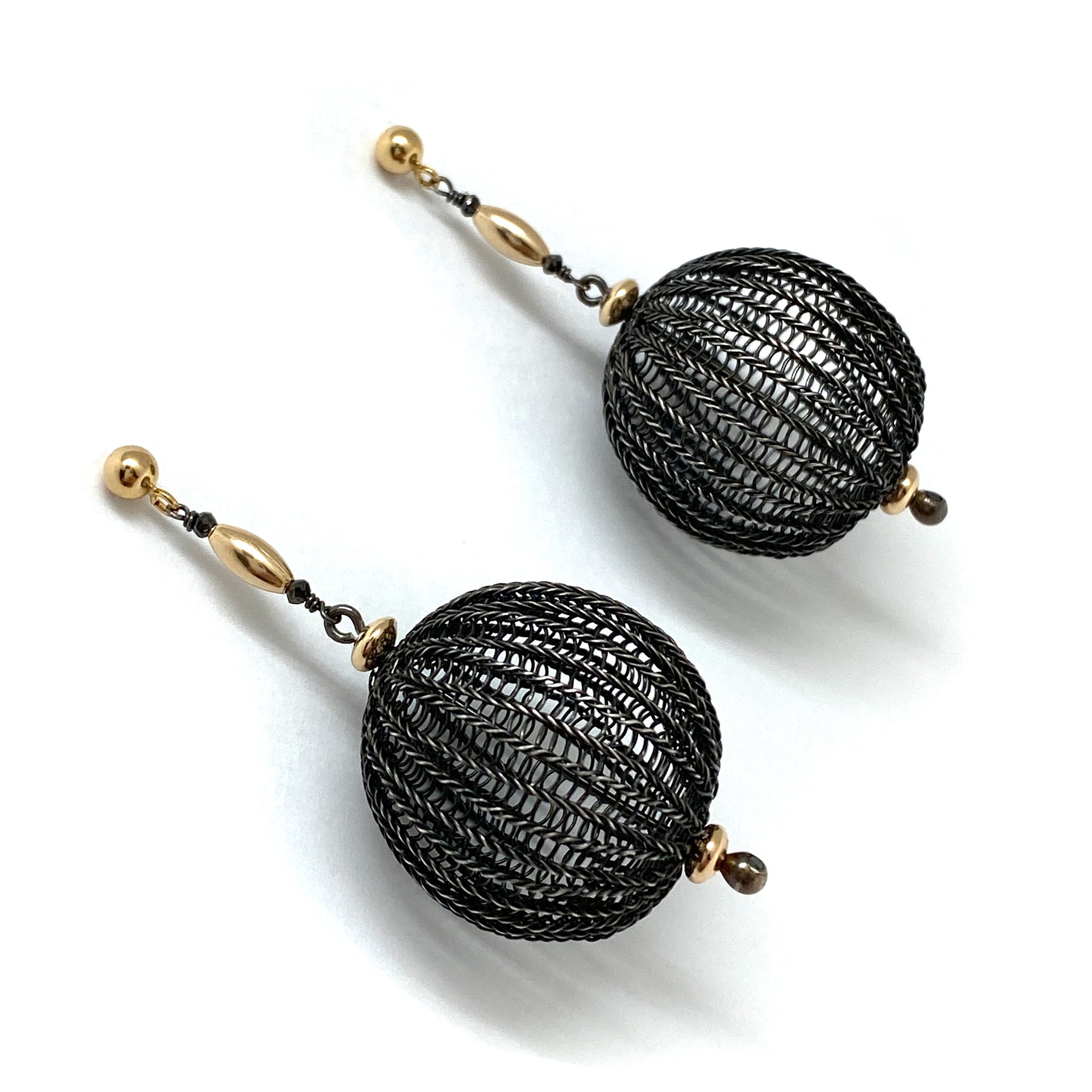 In a classic black and gold colorway, these earrings by Sowon Joo will pair with any piece in your wardrobe. Suspended from gold fill posts, Sowon's classic crocheted orb sways with accents of black diamonds catching the light.