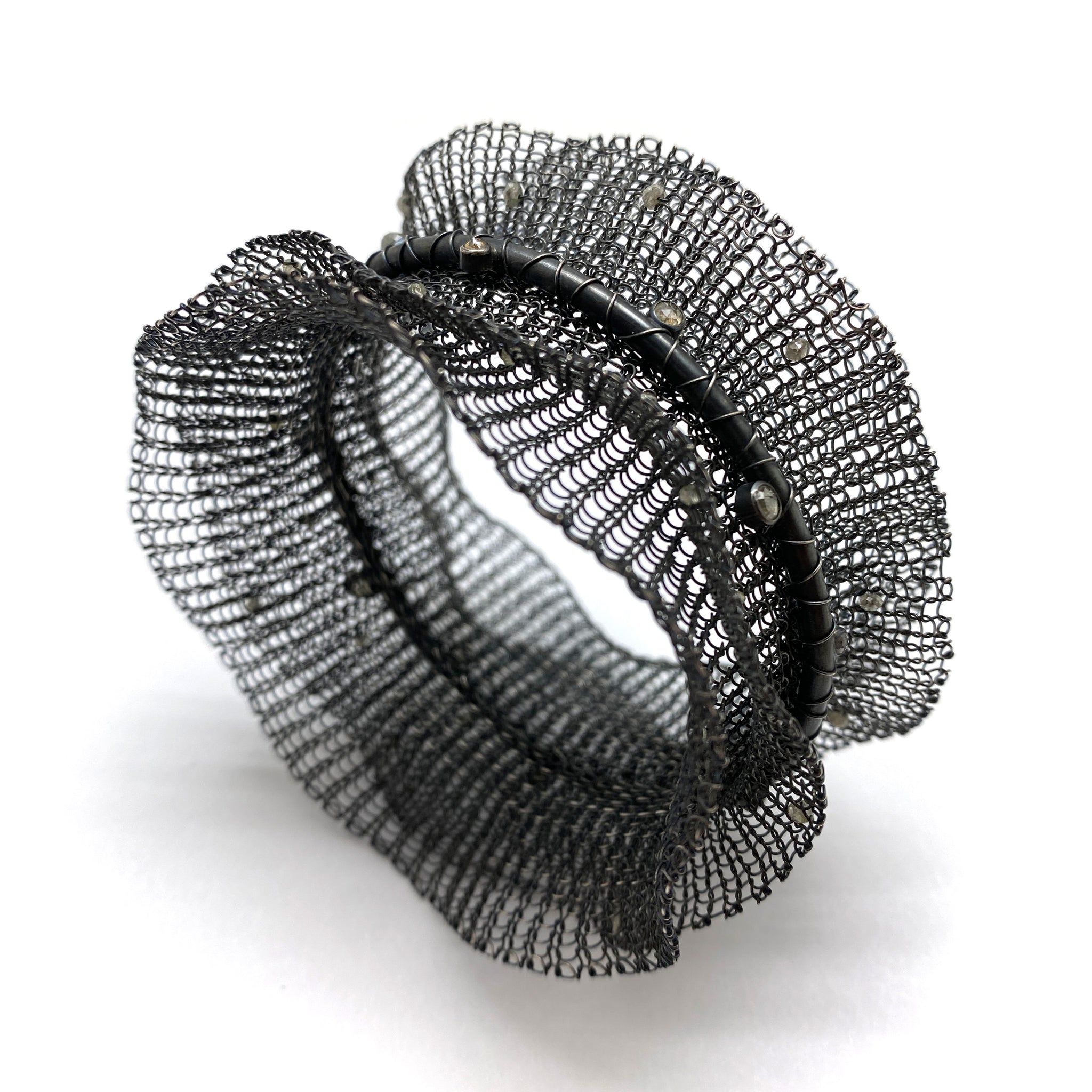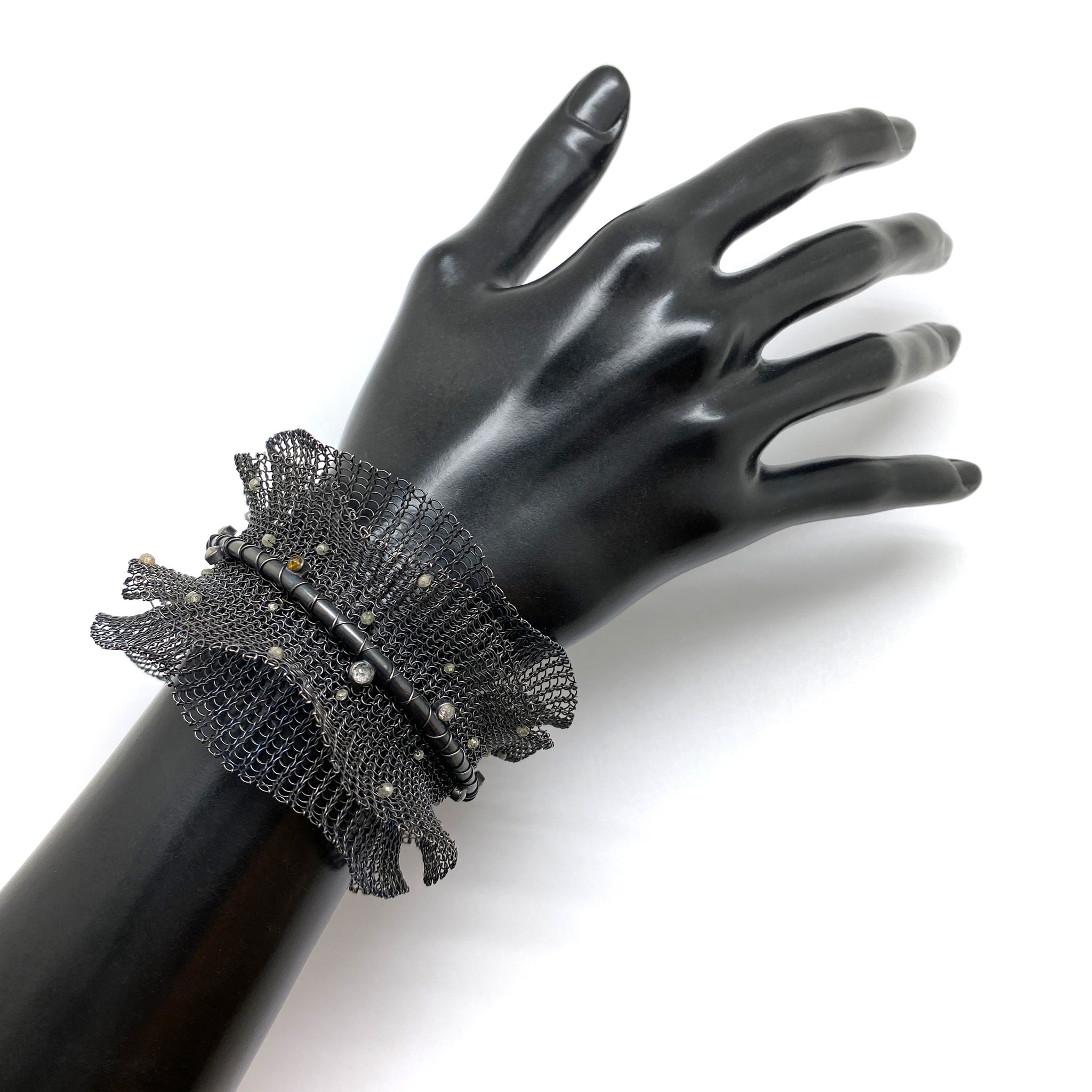 Made with crocheted oxidized sterling silver and rough diamonds beads, wear this statement bracelet on your next night out. This bracelet does not have an opening and slips over the hand like a bangle.