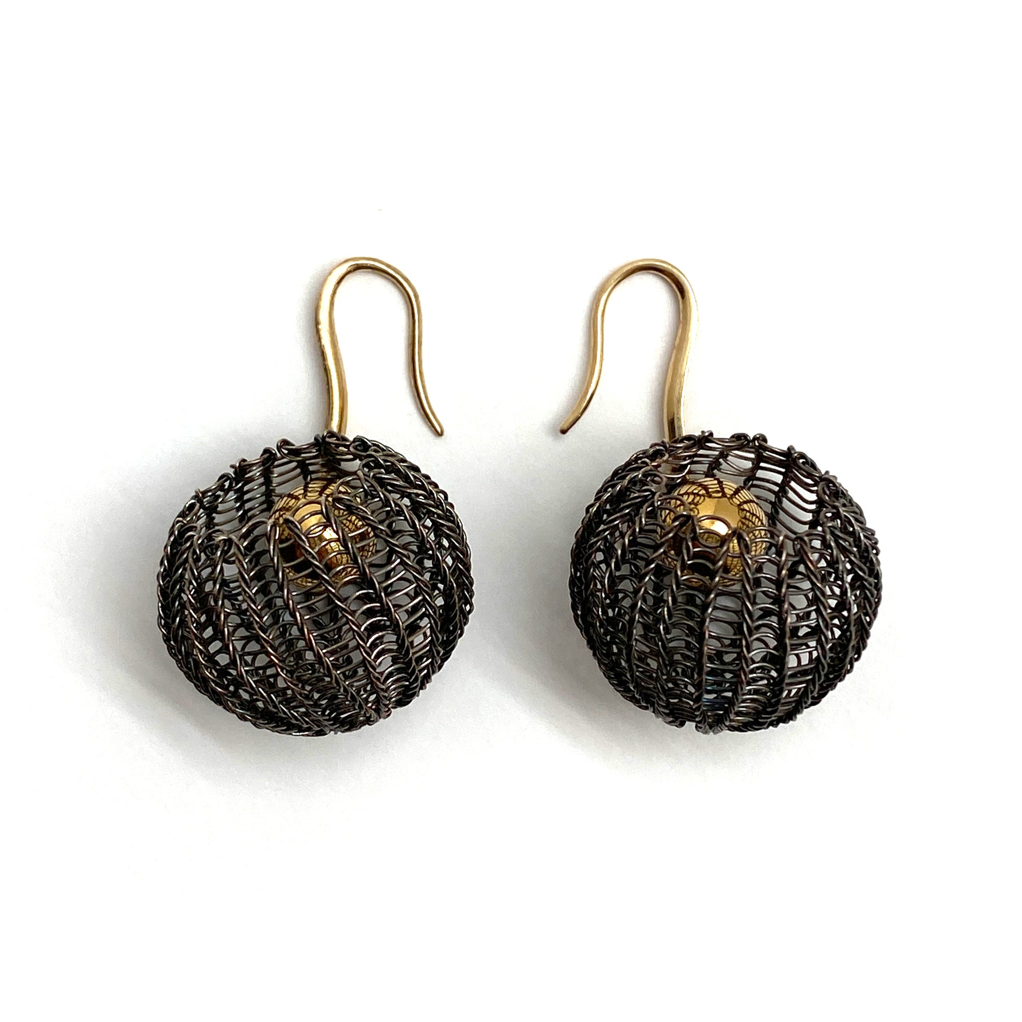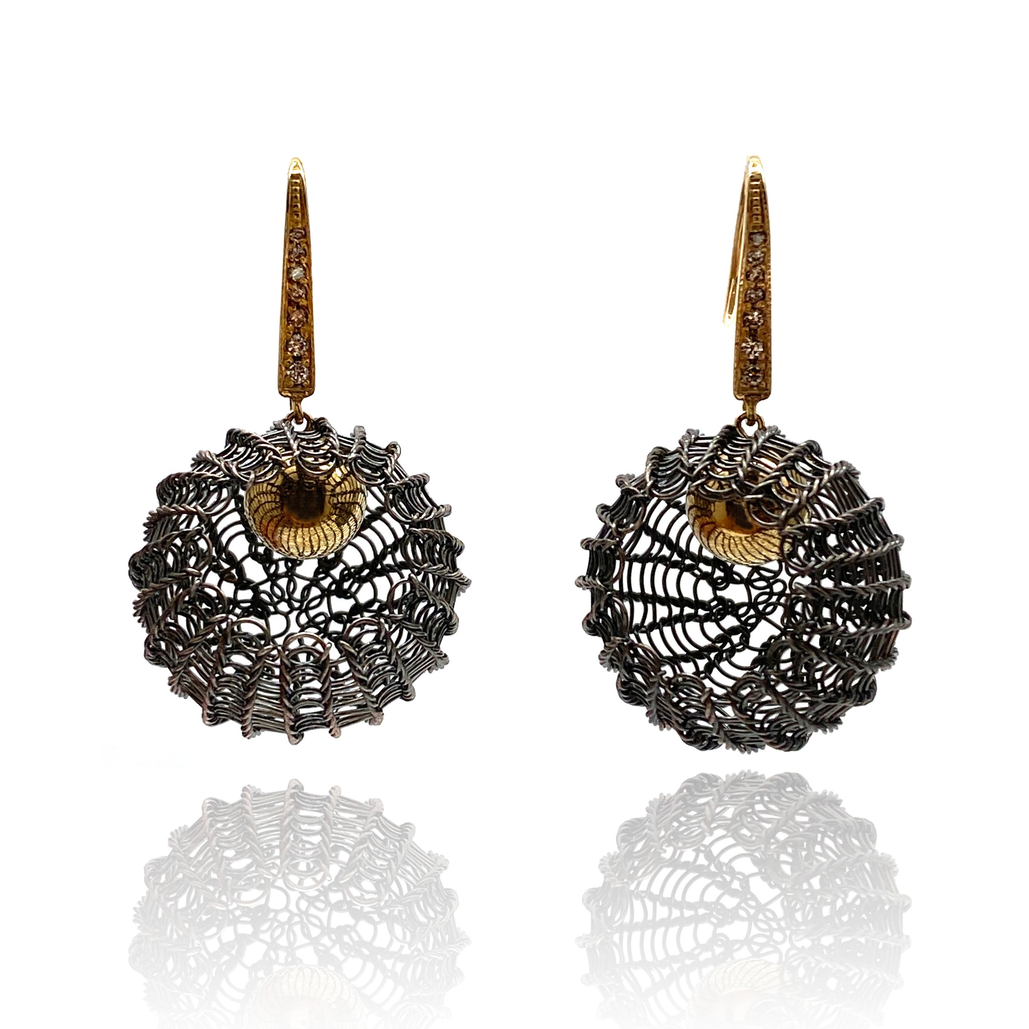 This decadent and delicate pair by Sowon Joo effortless mix precious materials with precious construction. An oxidized sterling silver crocheted sphere is suspended from 14k gold posts that are encrusted with with cognac diamonds to create this lightweight statement.
